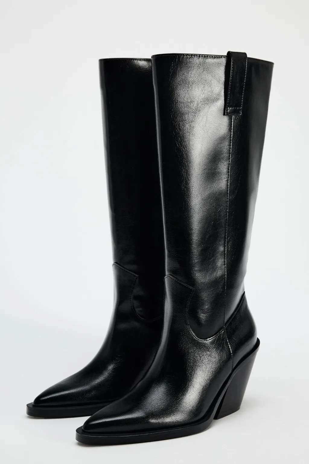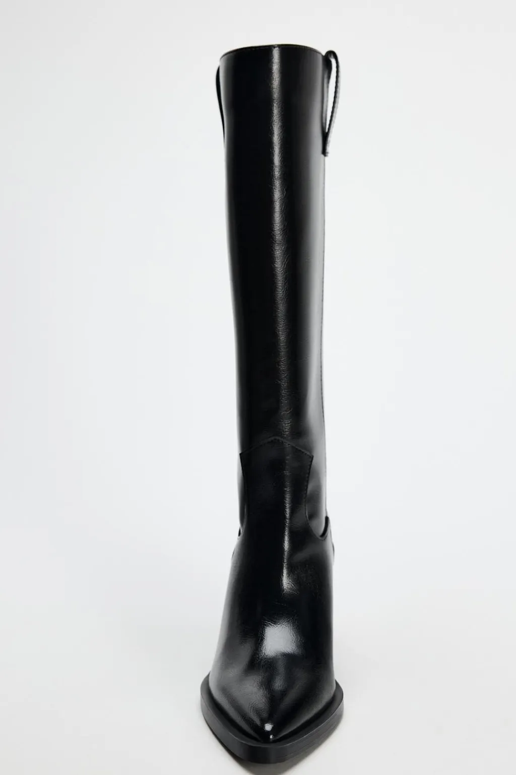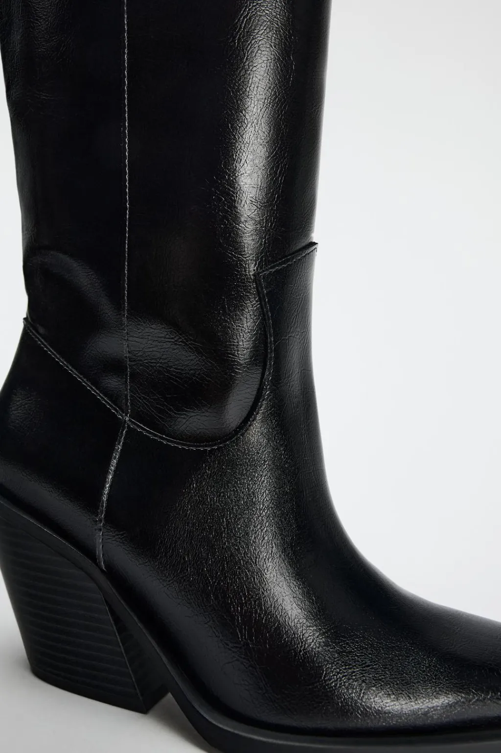 Zapato tipo bota de tacón estilo cowboy. Tiradores laterales. Acabado en punta.