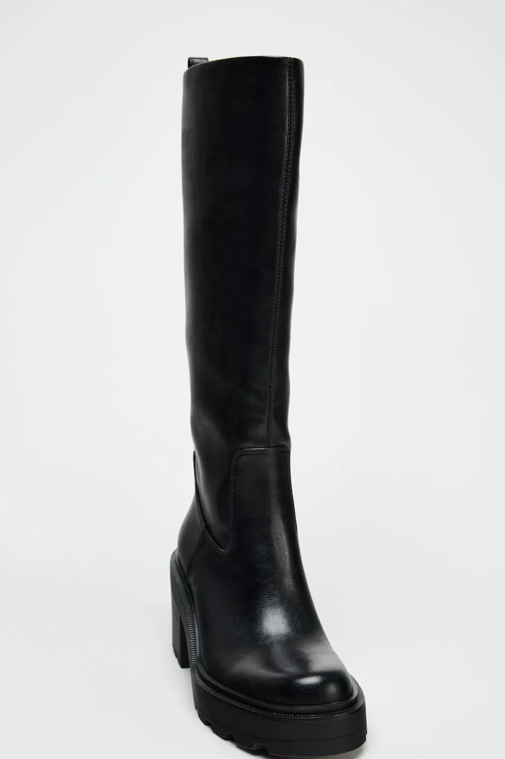 Zapato tipo bota con suela track y dentada. Tacón ancho y caña alta. Tirador trasero. Acabado en punta redonda.