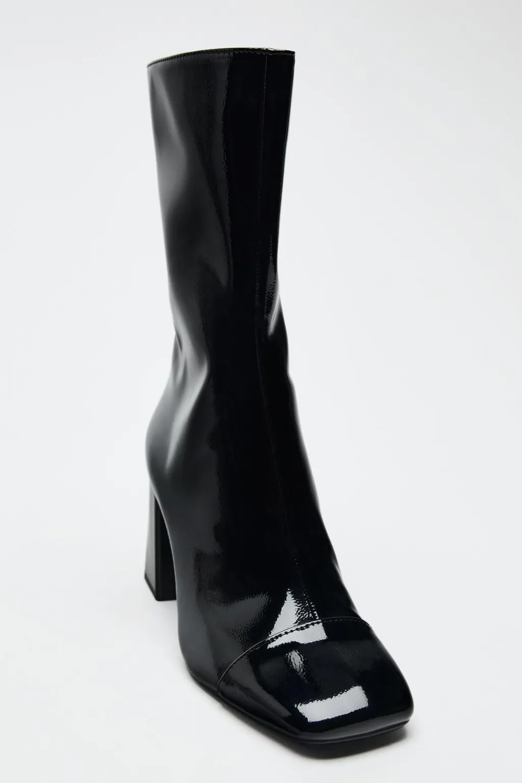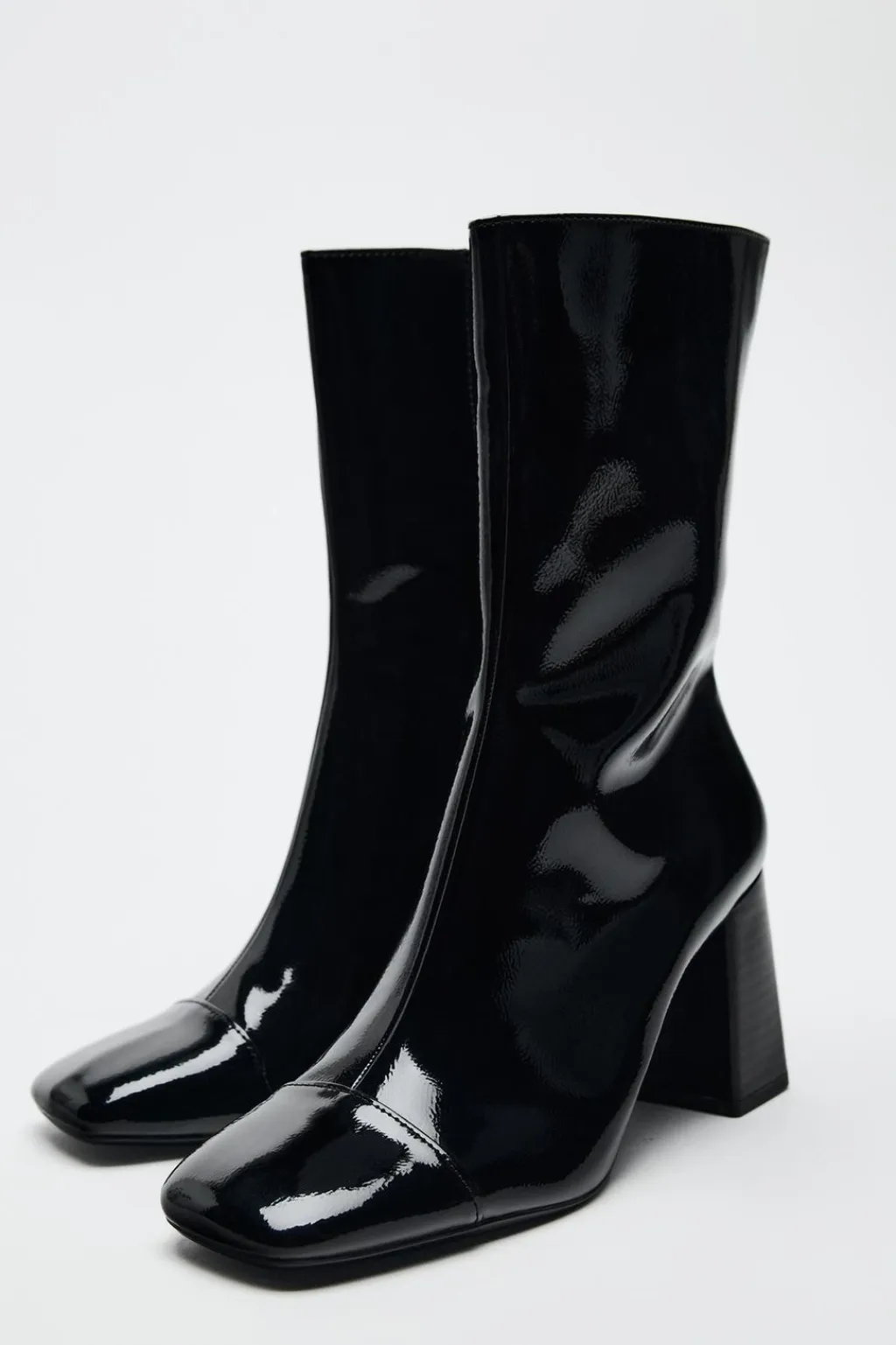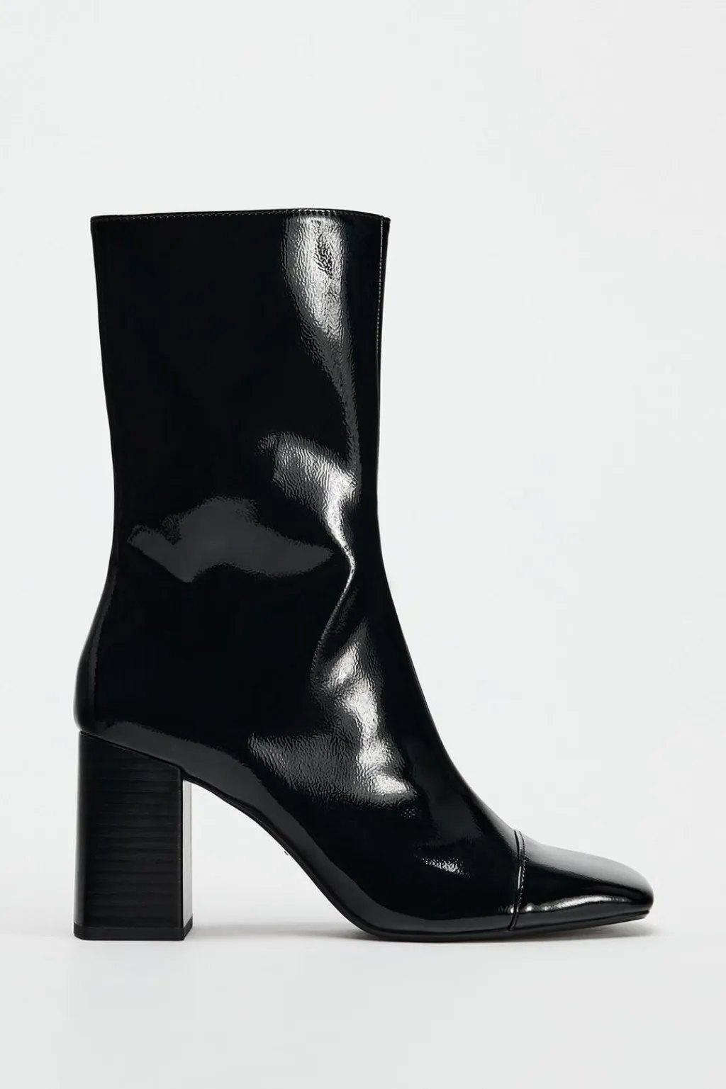 Zapato tipo botín con tacón ancho. Efecto acharolado. Acabado en punta cuadrada. Cierre mediante cremallera.
