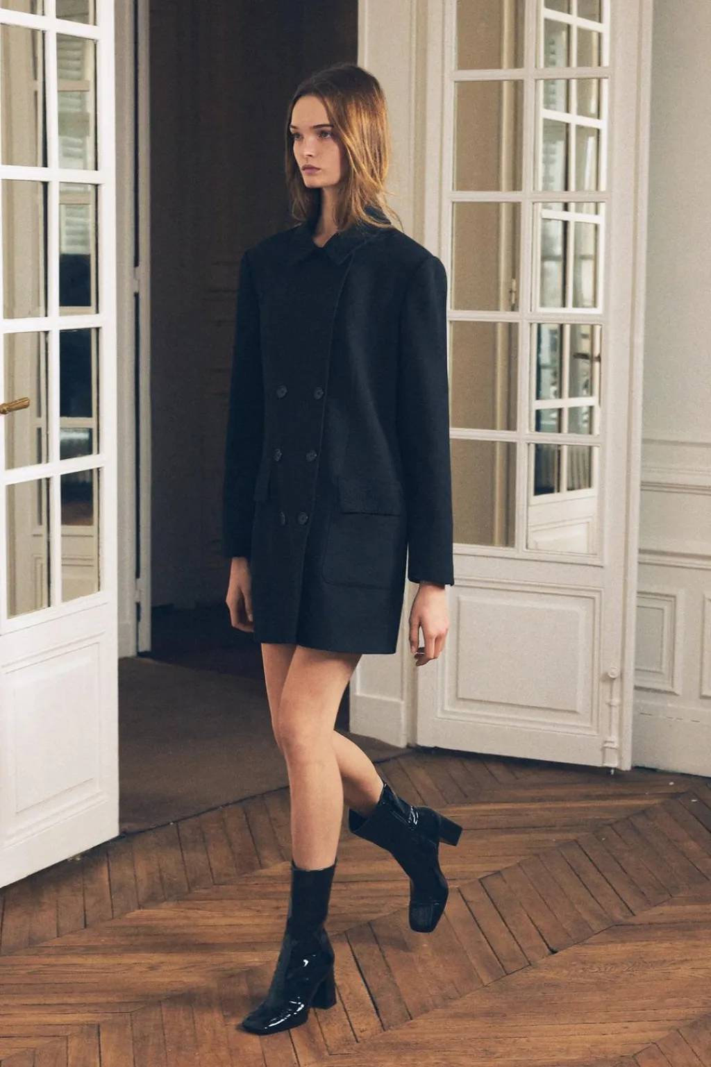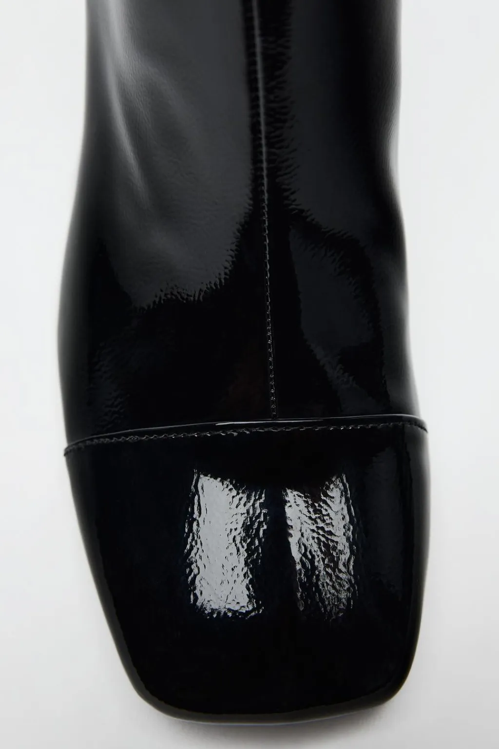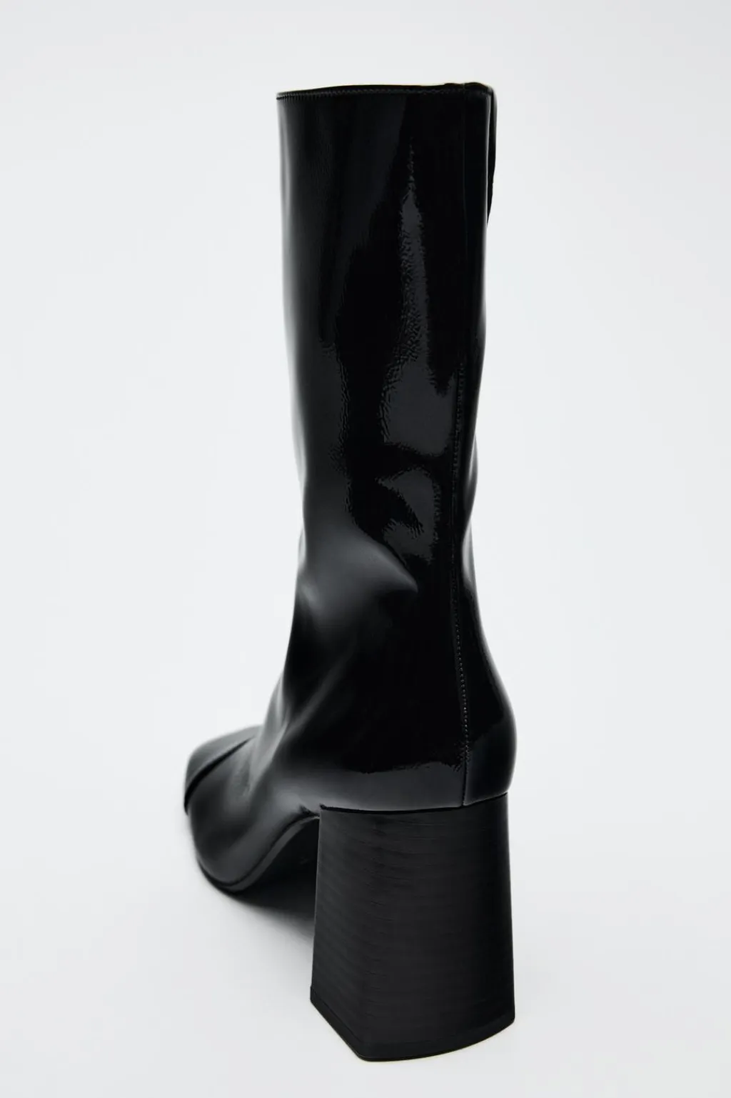 Zapato tipo botín con tacón ancho. Efecto acharolado. Acabado en punta cuadrada. Cierre mediante cremallera.
