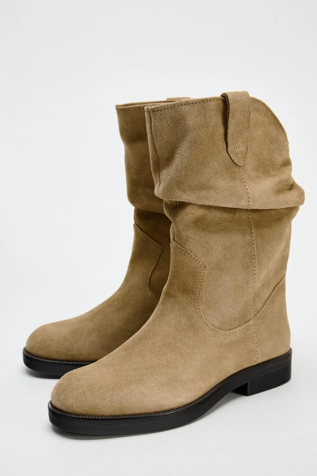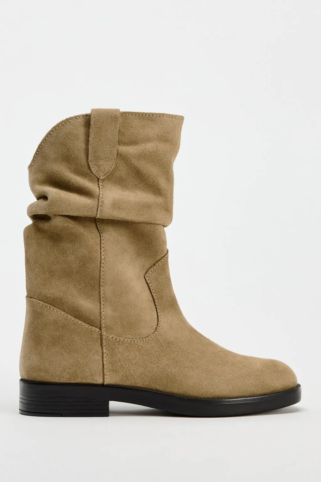 Zapato tipo botín plano. Caña ancha con pliegues. Tiradores laterales. Acabado en punta redonda.