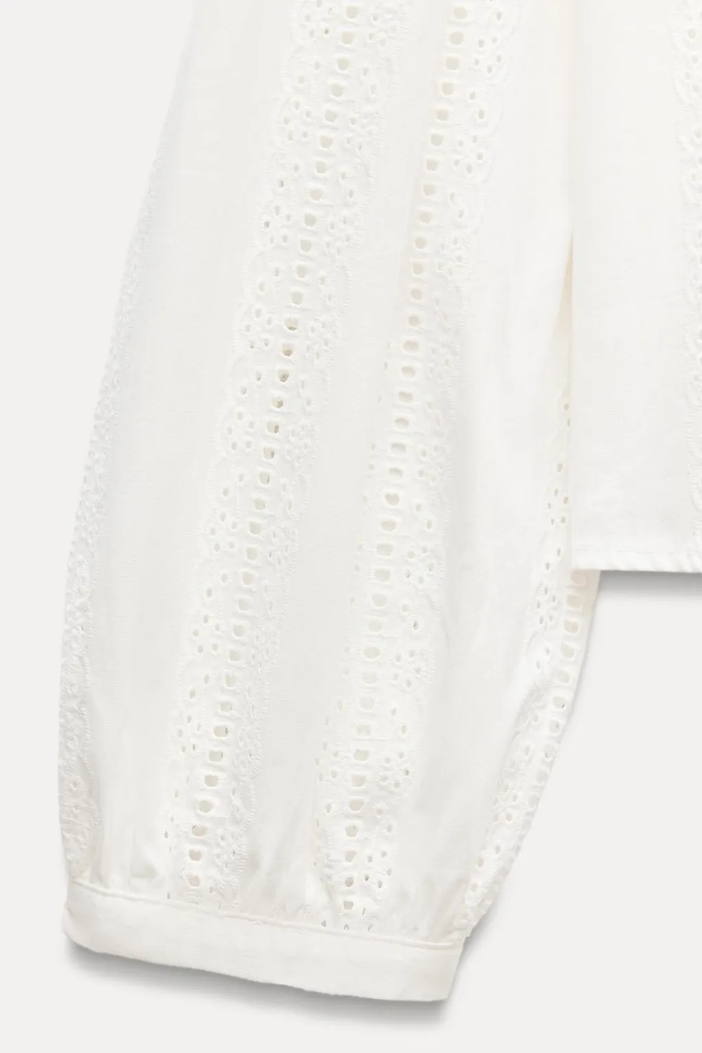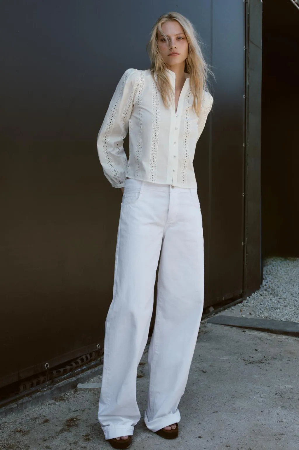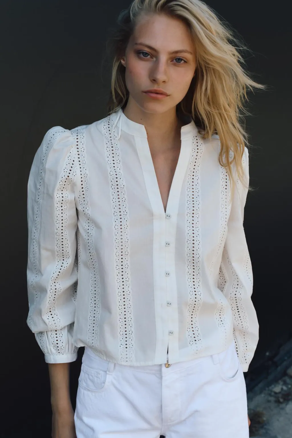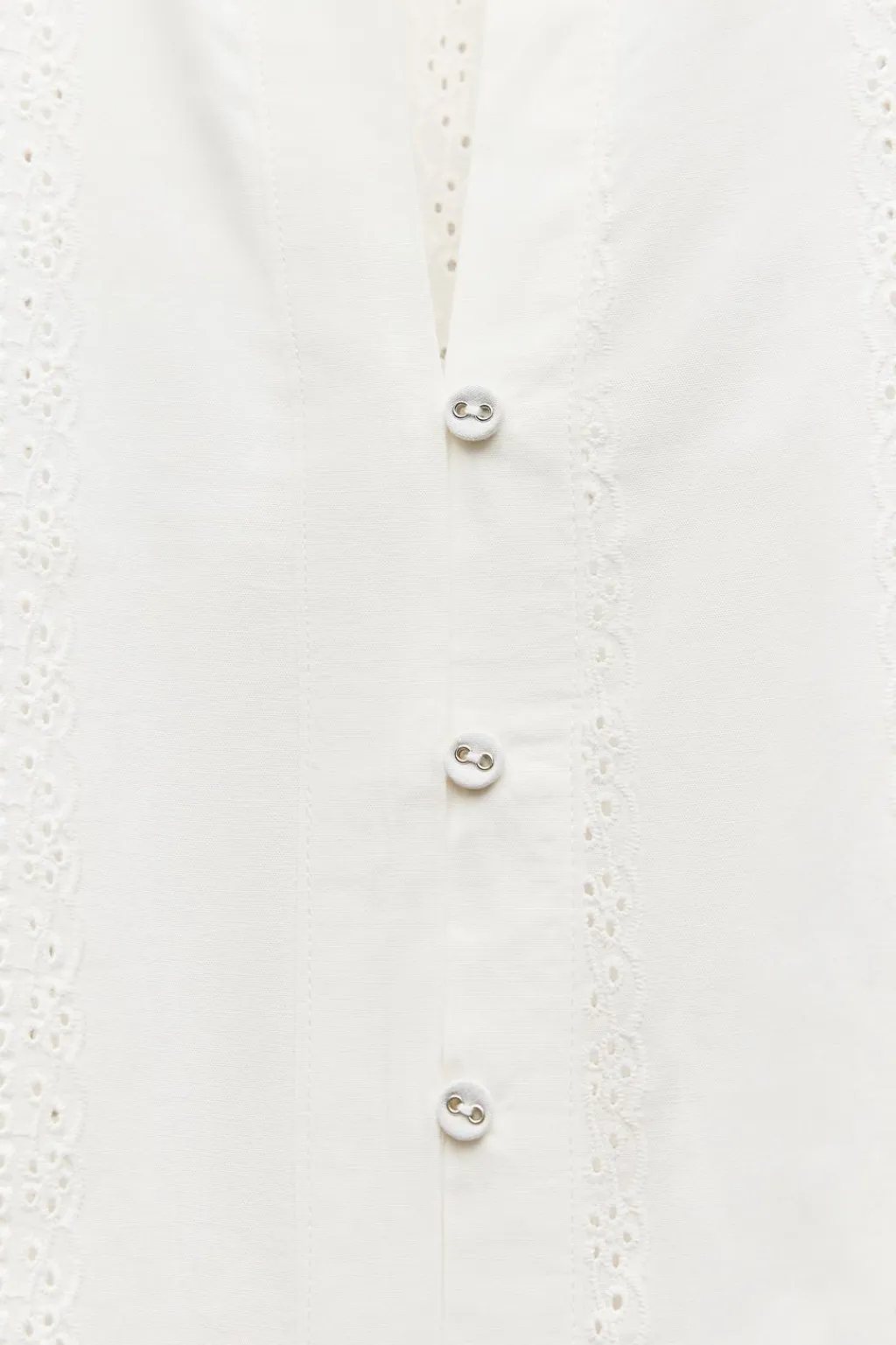 Camisa de cuello redondo y manga larga con hombro abullonado. Detalle de bordados combinados a tono. Cierre frontal con botones.