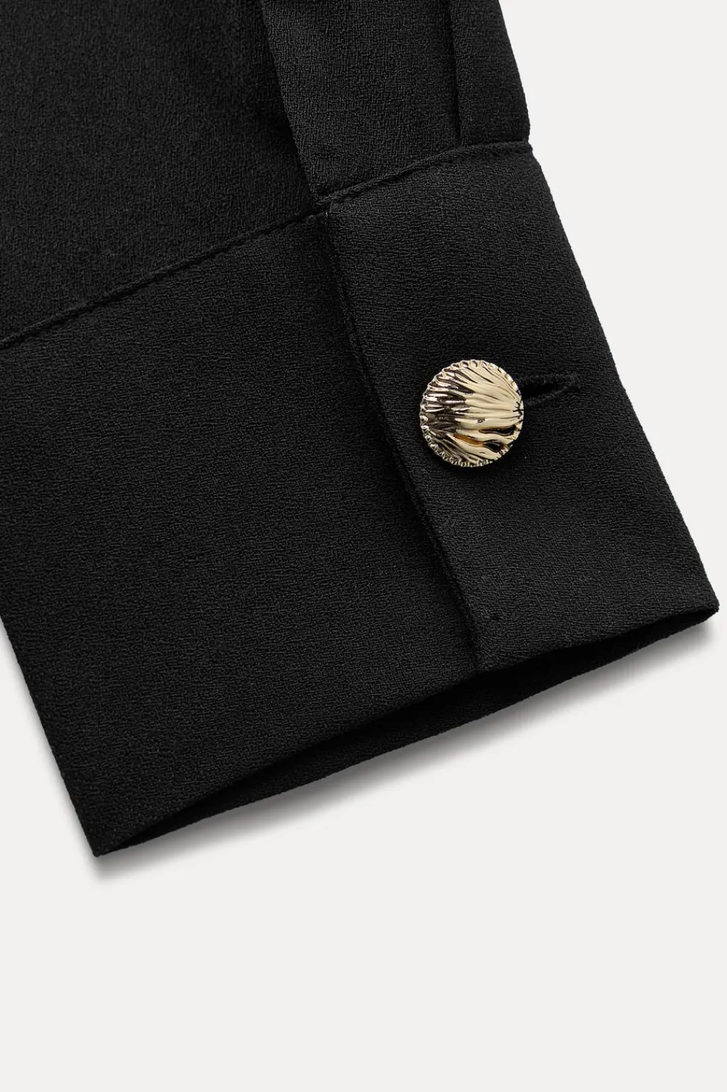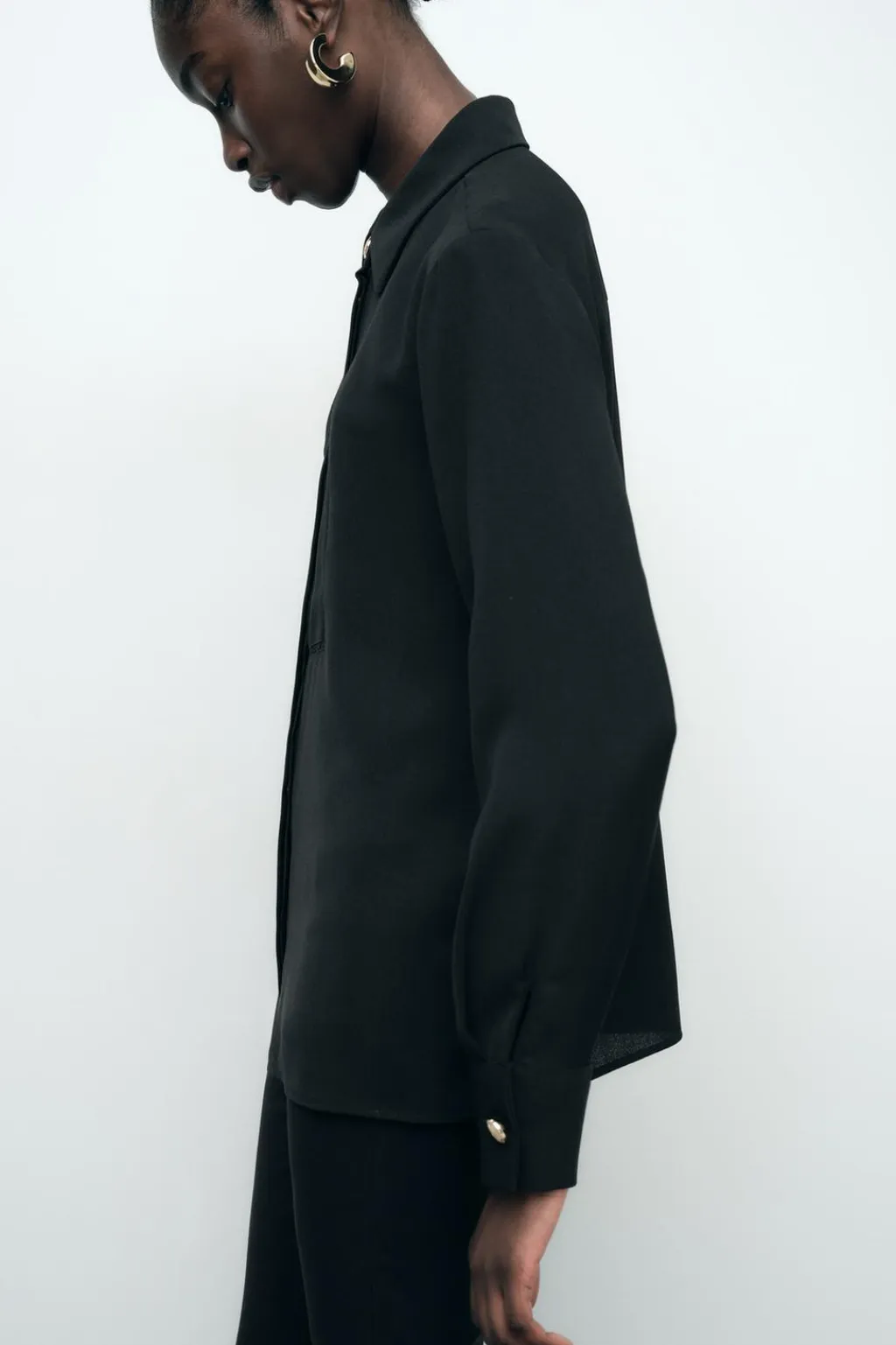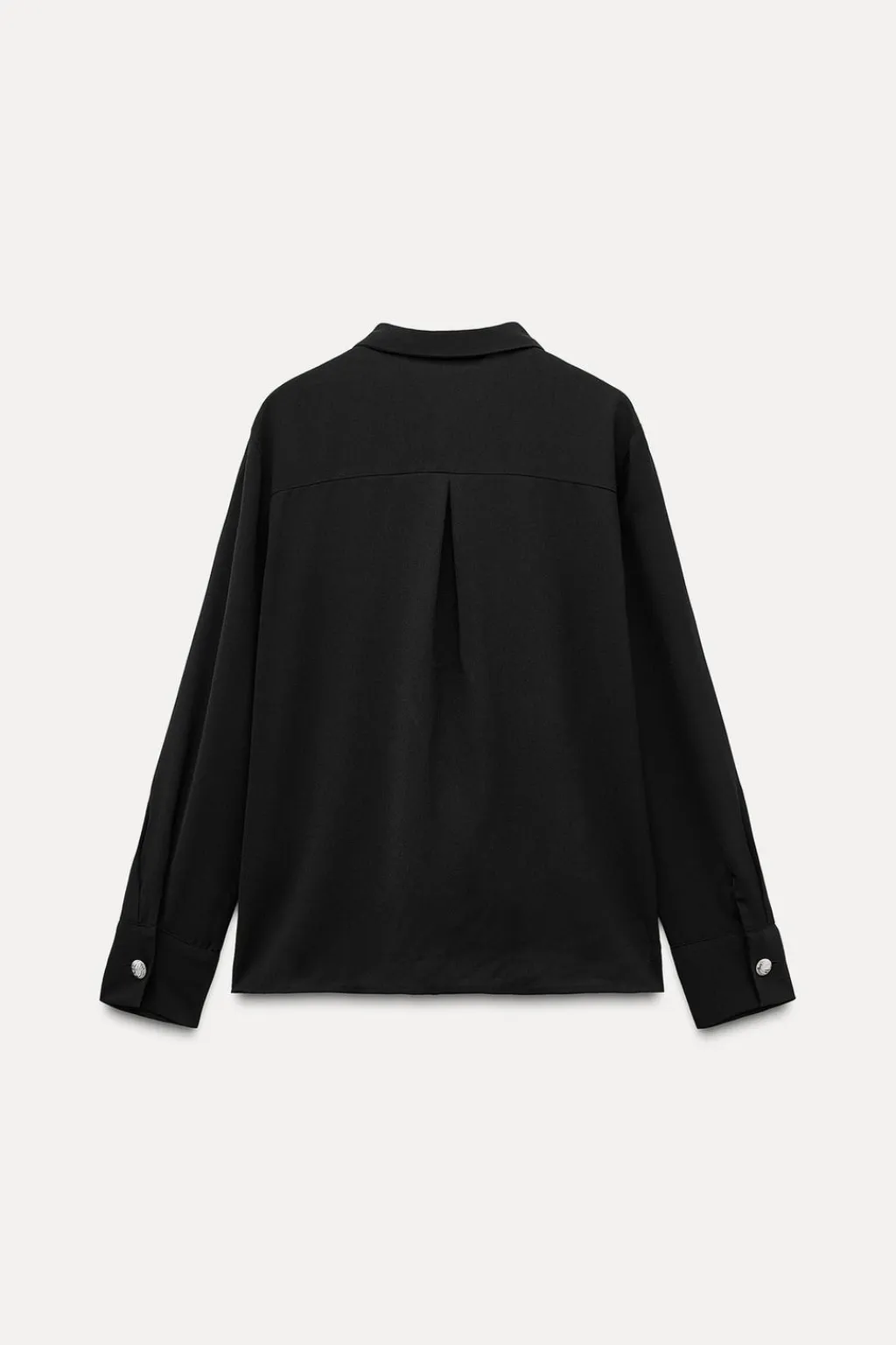 Camisa de cuello solapa y manga larga. Detalle de entredoses delanteros a tono. Cierre frontal con botón dorado y botones ocultos por solapa.