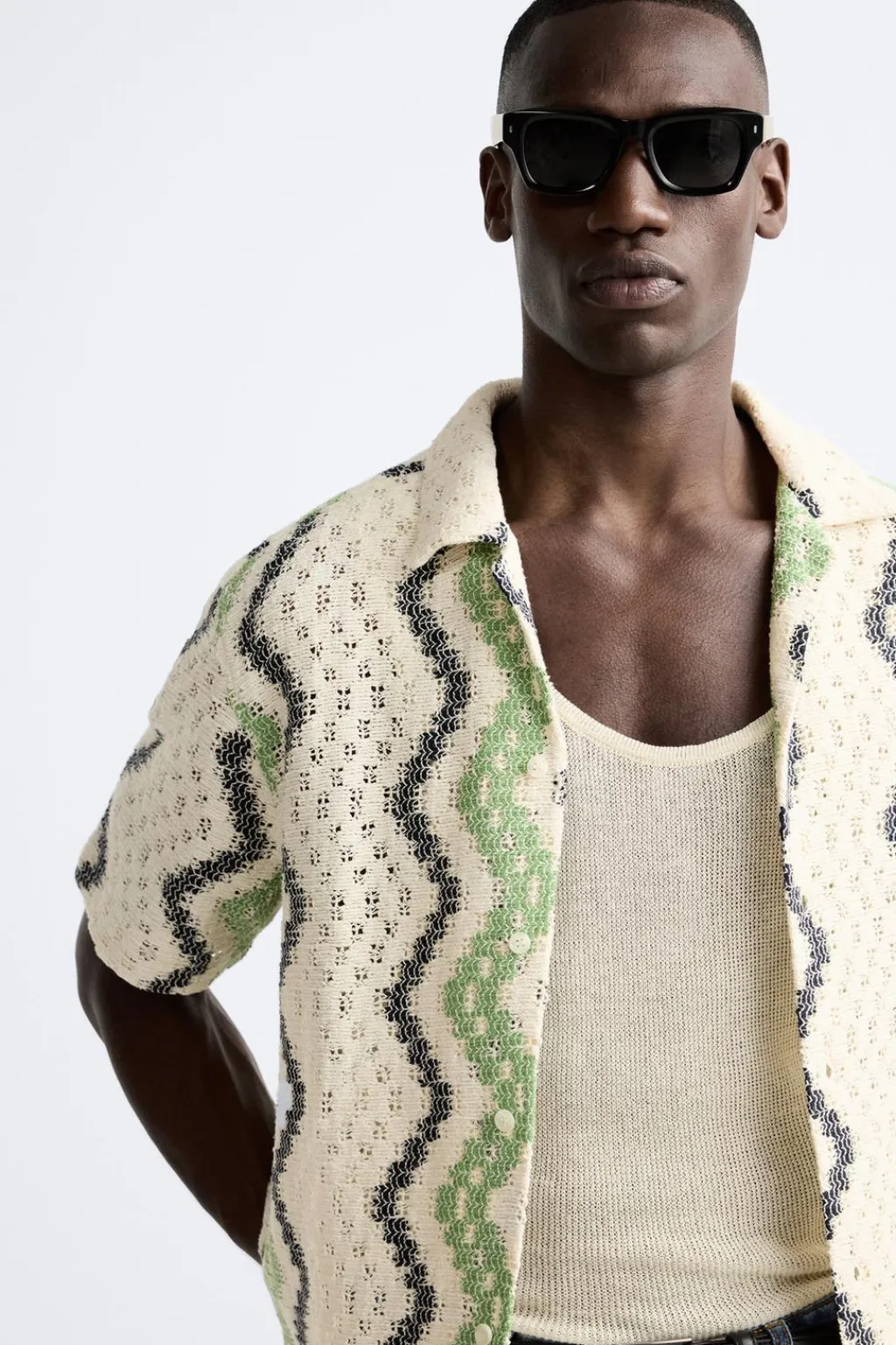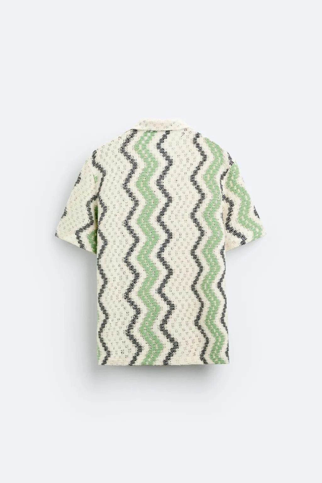 Camisa relaxed fit confeccionada en tejido con estructura abierta. Cuello bowling y manga corta. Cierre frontal de botonadura.