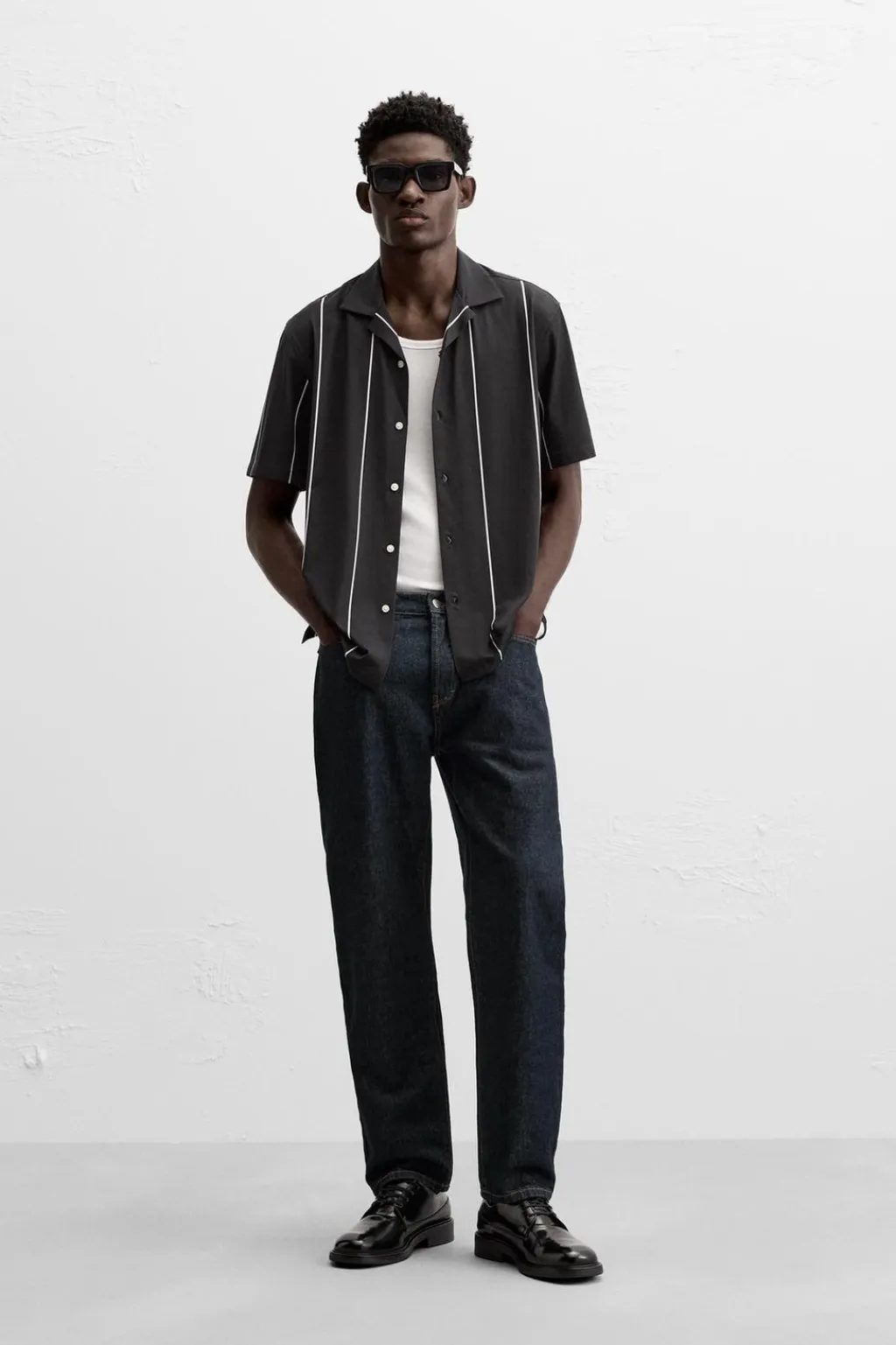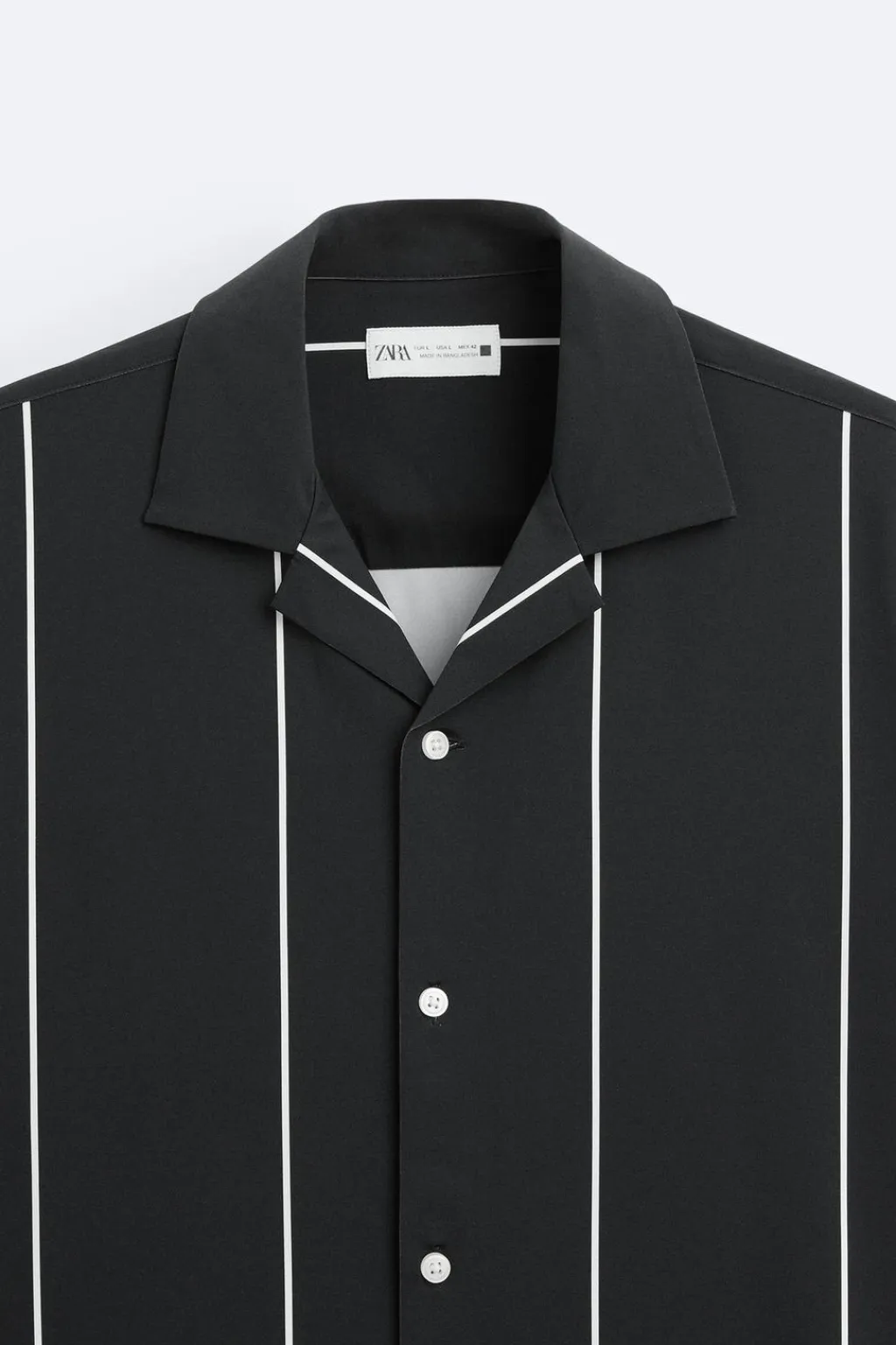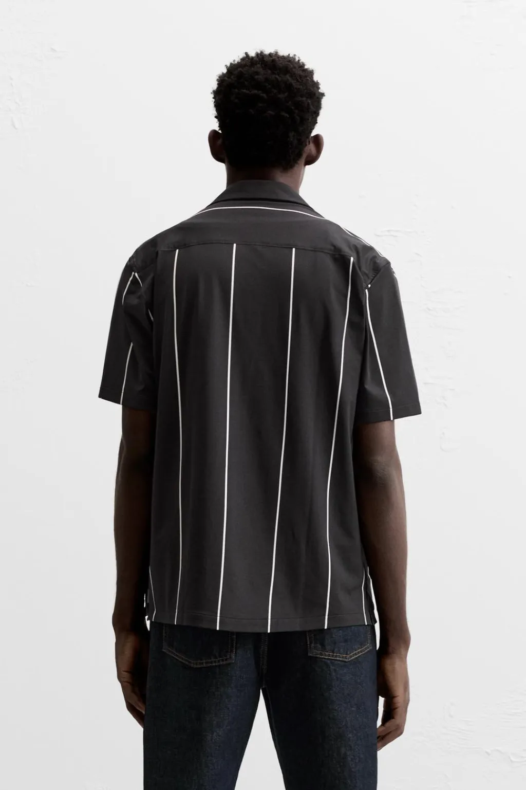 Camisa confeccionada en un tejido que minimiza la necesidad de plancha después del lavado. Cuello bowling y manga corta. Bajo con aberturas laterales. Cierre frontal de botonadura.