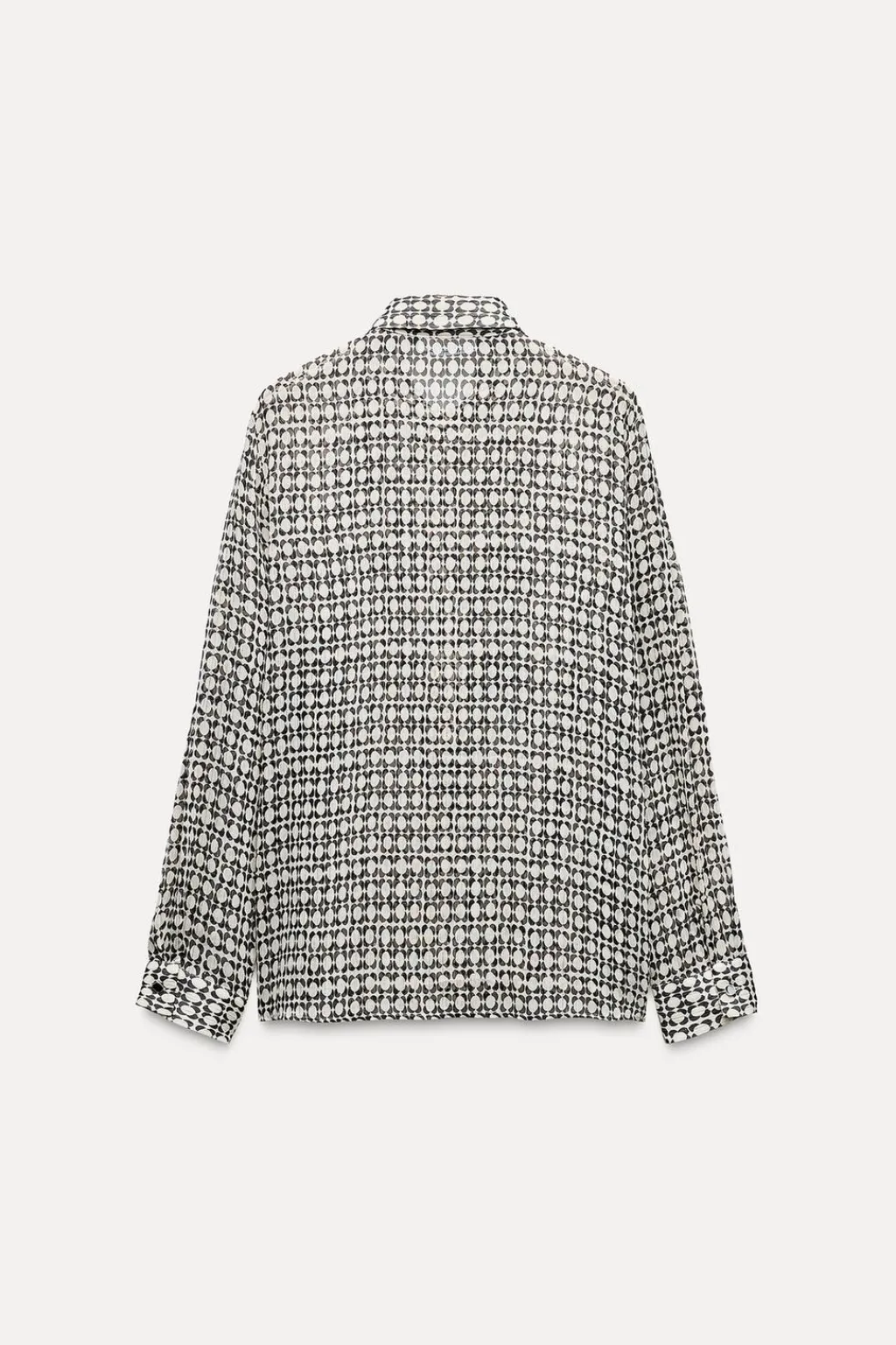 Camisa de cuello solapa y manga larga. Detalle de chorreras delanteras y tejido con hilo metalizado. Cierre frontal con botones ocultos por solapa.