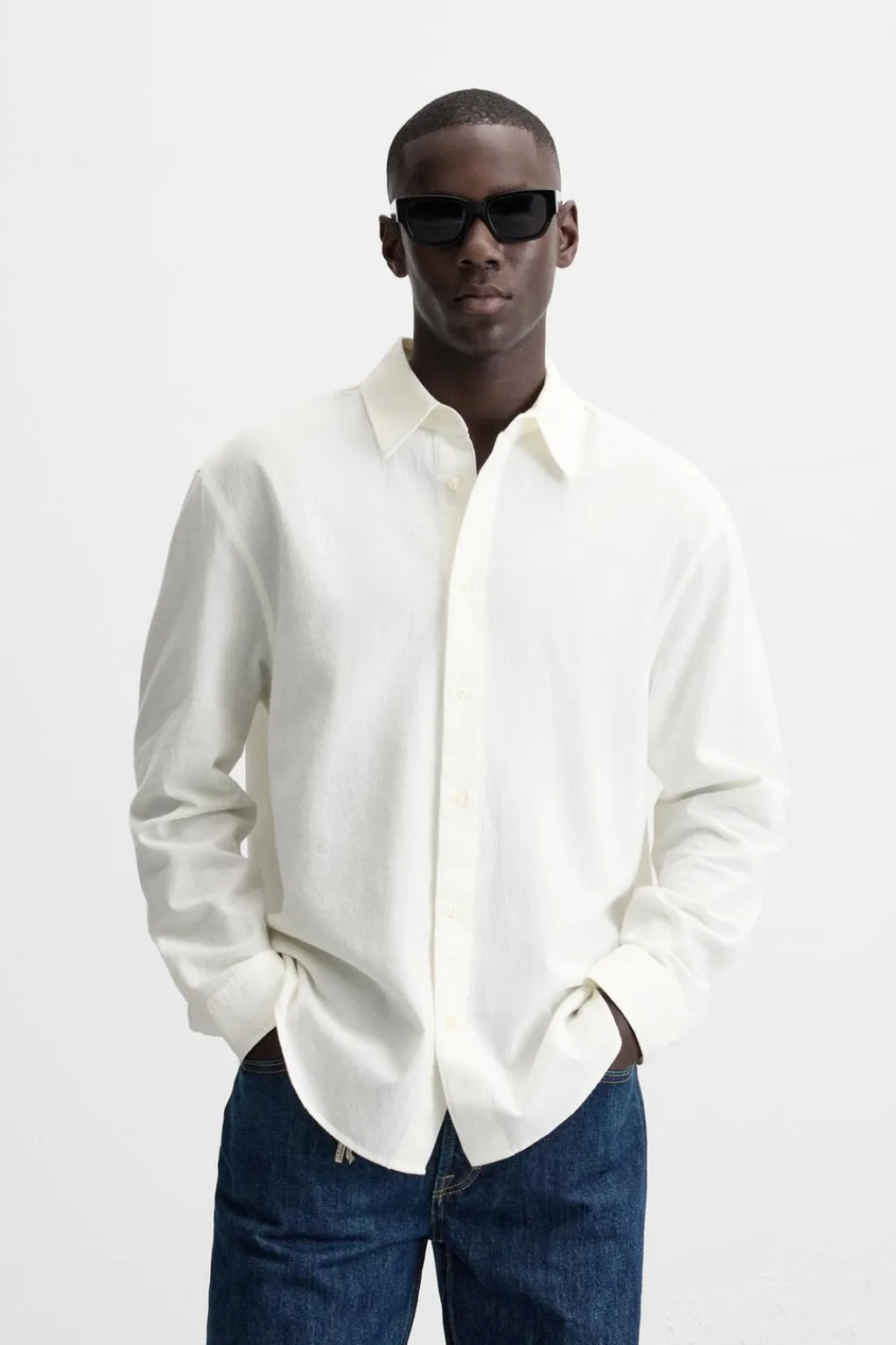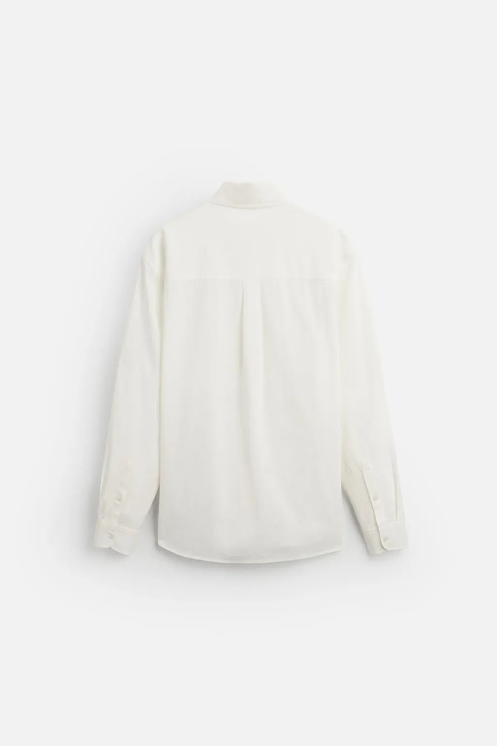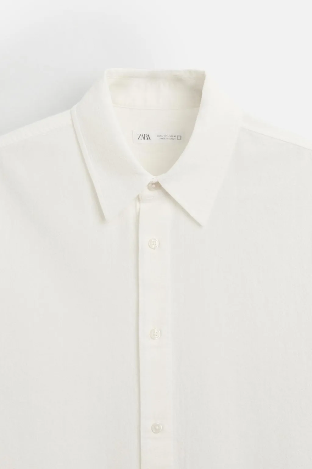 Camisa regular fit confeccionada en tejido de algodón con textura. Cuello solapa y manga larga acabada en puño con botón. Cierre frontal de botonadura.