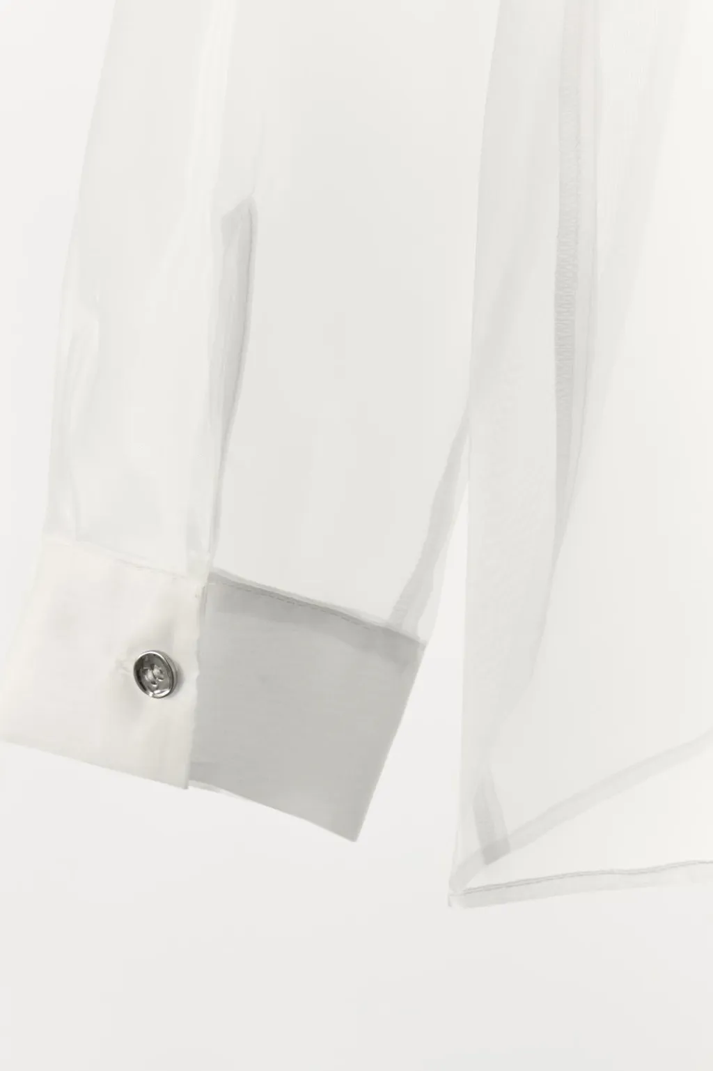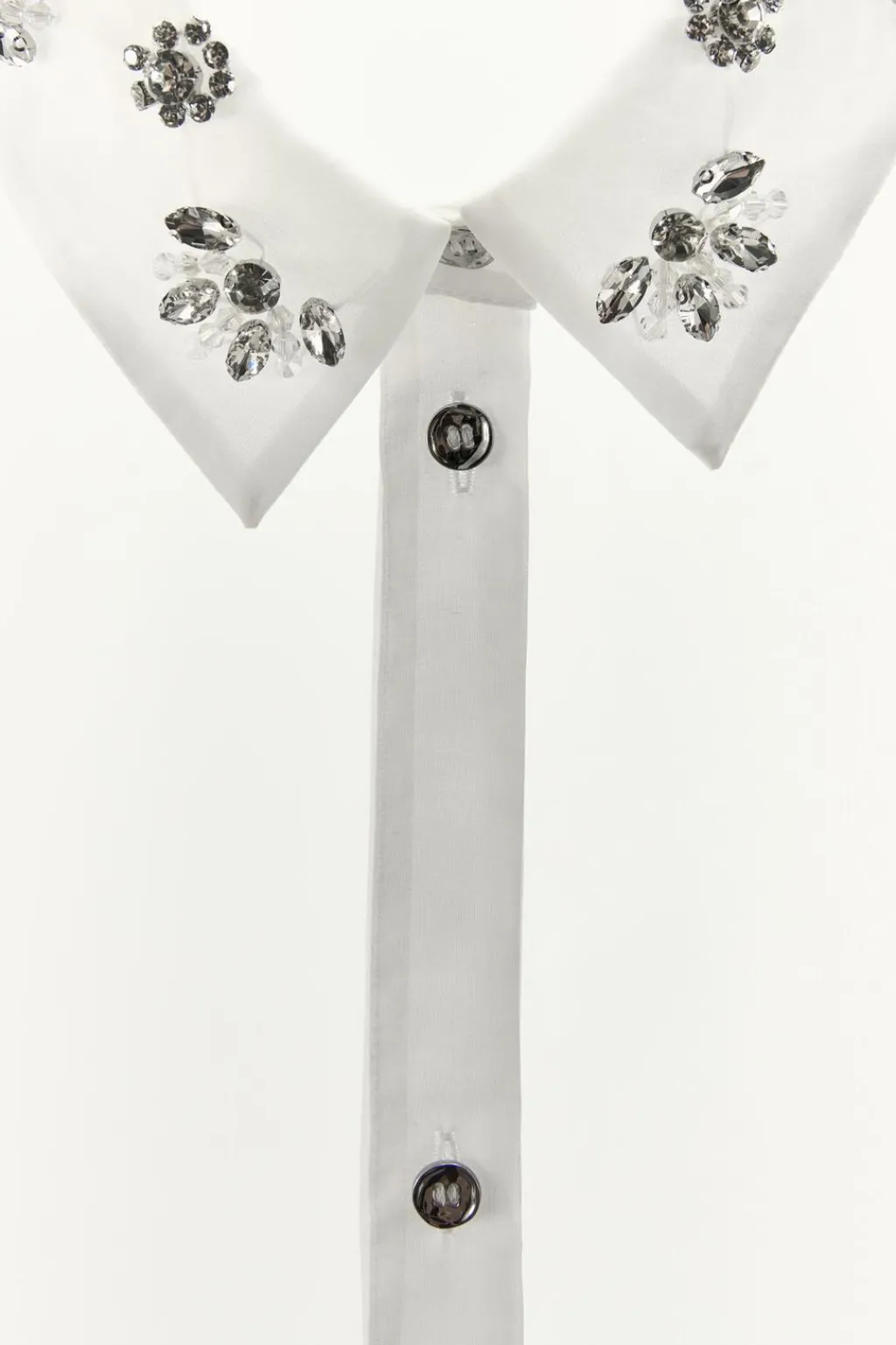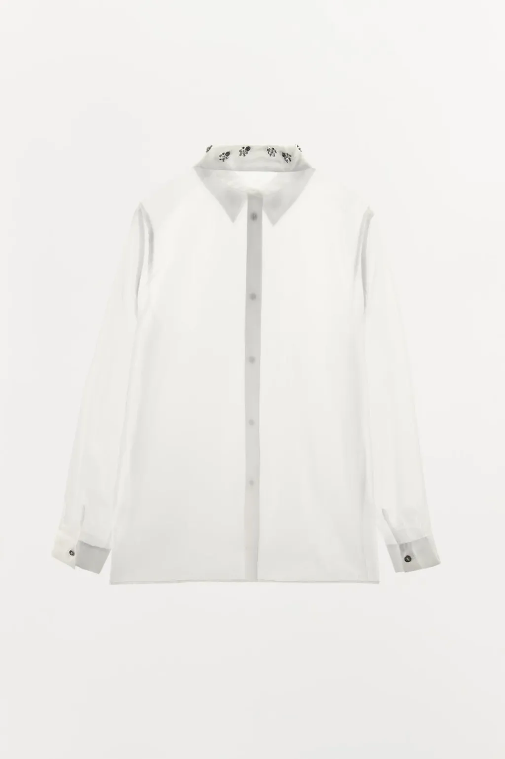 Camisa semitransparente de cuello solapa con aplicación de joyas combinadas a contraste. Manga larga acabada en puño. Cierre frontal con botones.