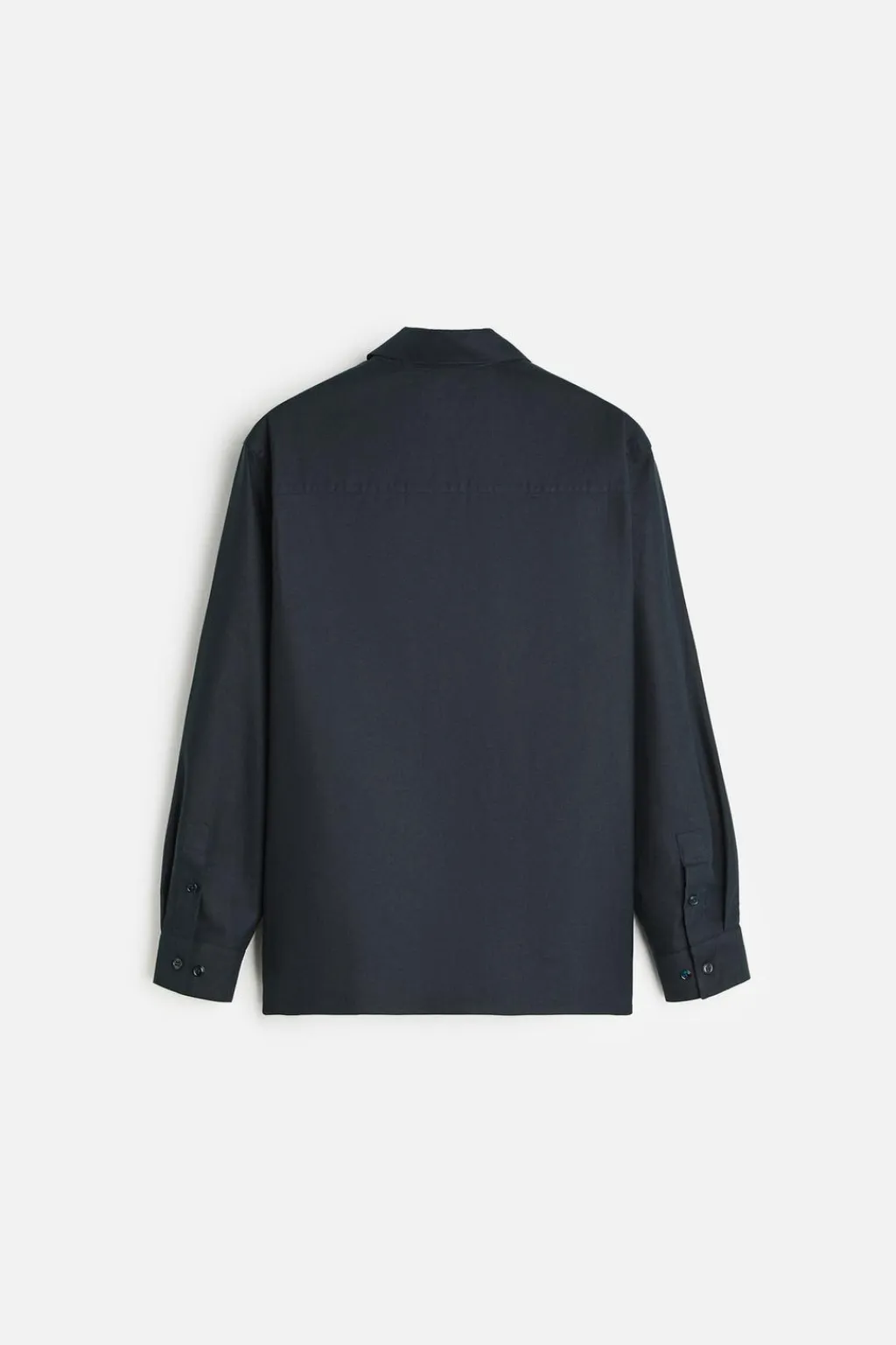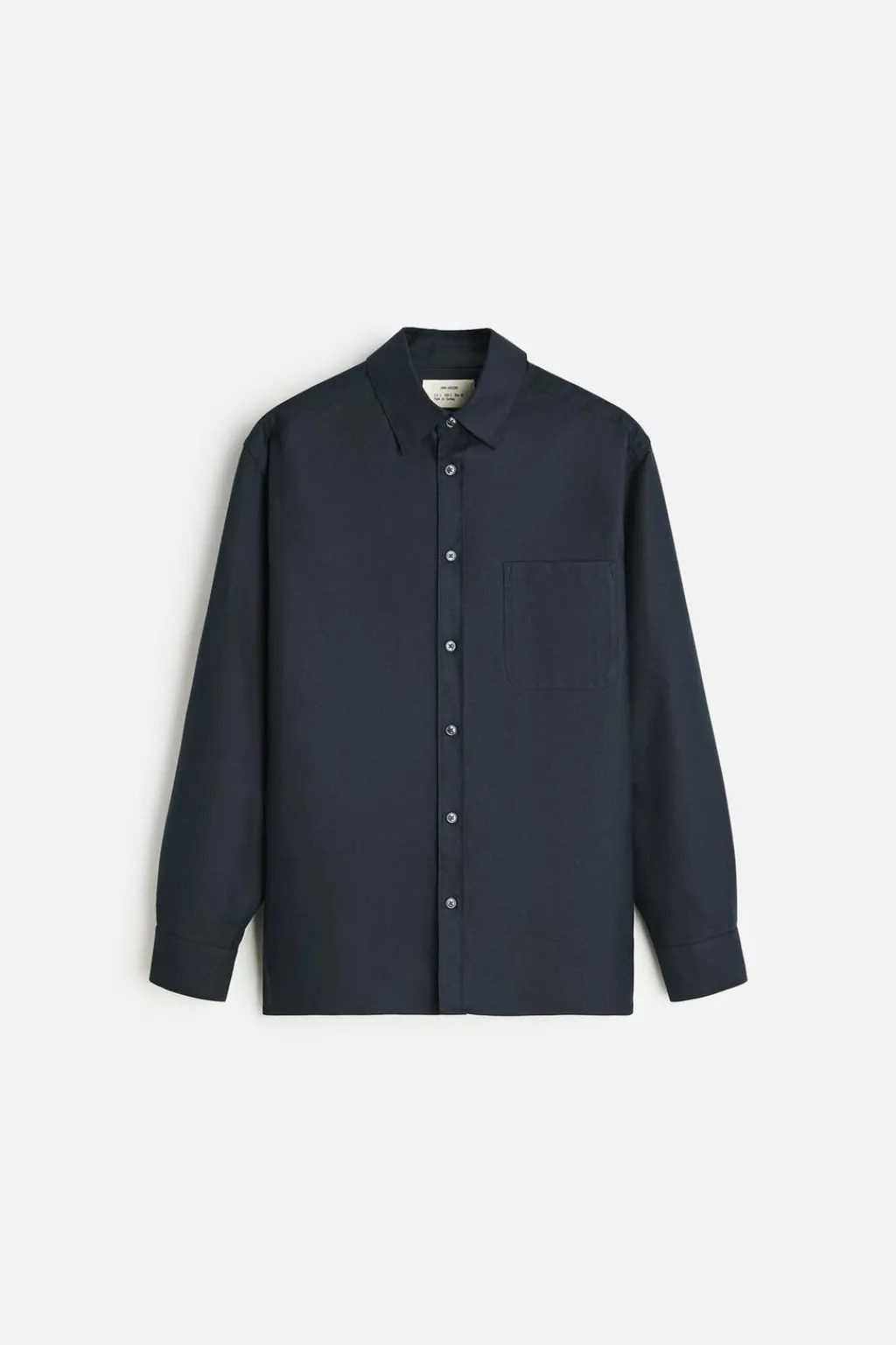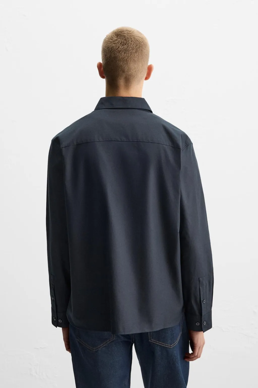 Camisa regular fit confeccionada en oxford de algodón. Cuello bowling y manga larga acabada en puño con botón. Bolsillo plastrón en pecho. Cierre frontal de botonadura.