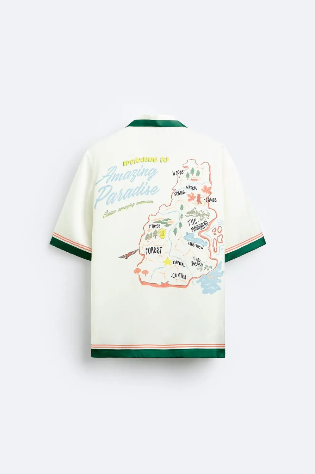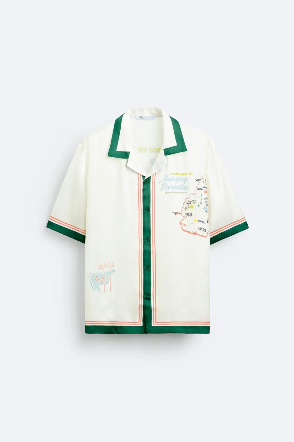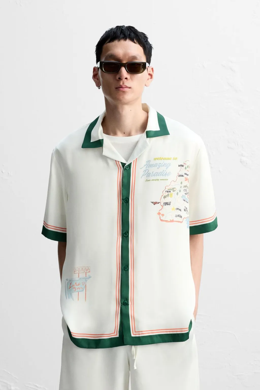 Camisa relaxed fit confeccionada en tejido satinado. Cuello bowling y manga corta. Estampaciones combinadas a contraste en delantero y espalda. Cierre frontal de botonadura.