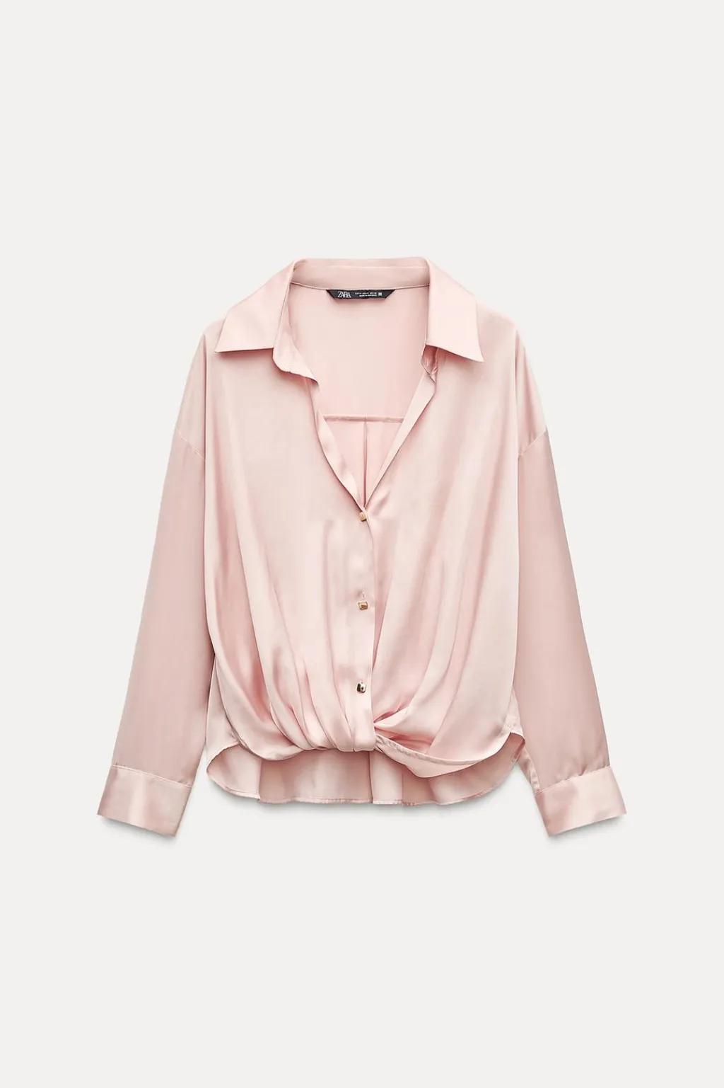 Camisa fluida de cuello solapa con escote pico y manga larga. Detalle de bajo con nudo delantero. Cierre frontal con botones dorados.