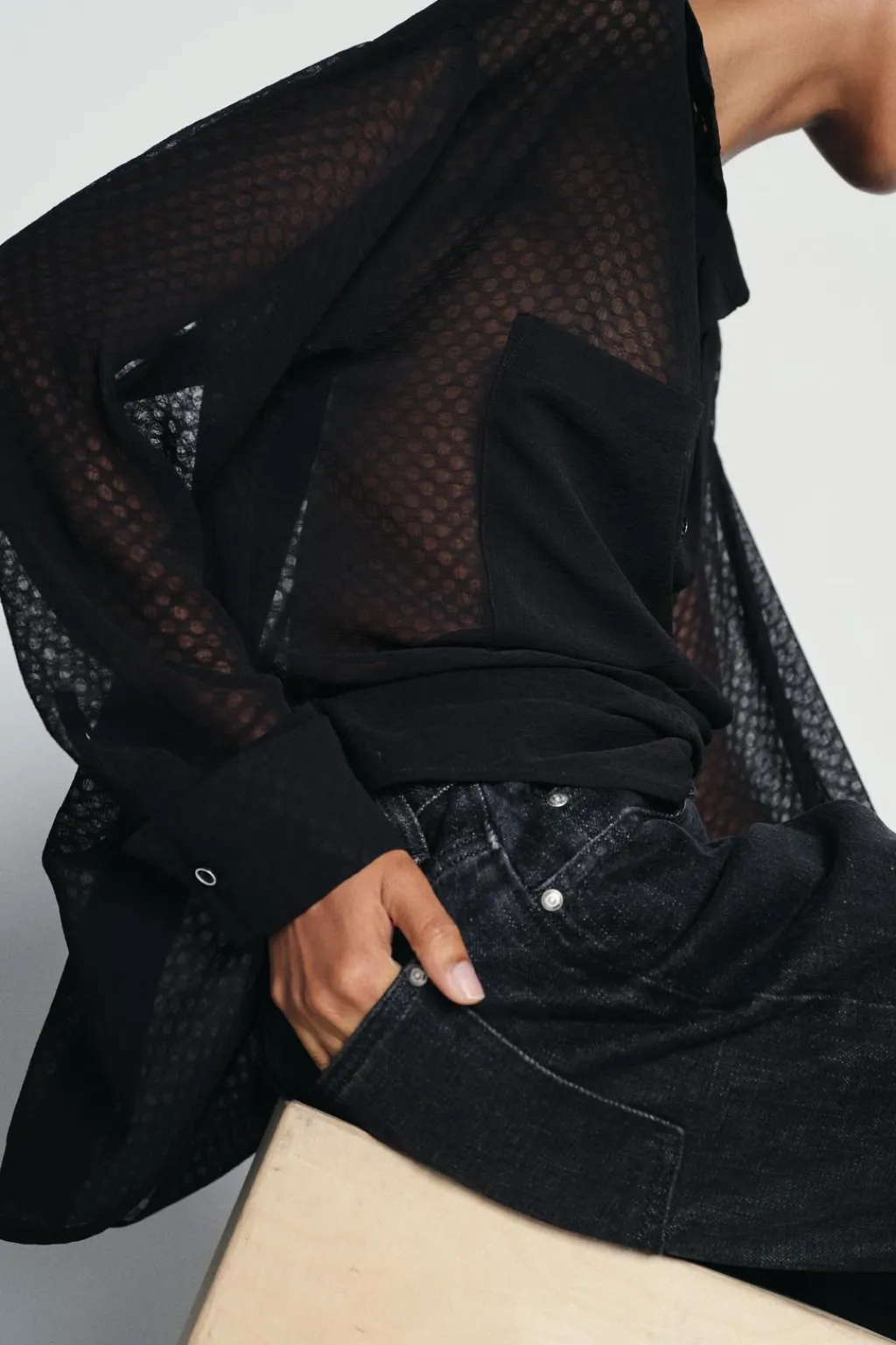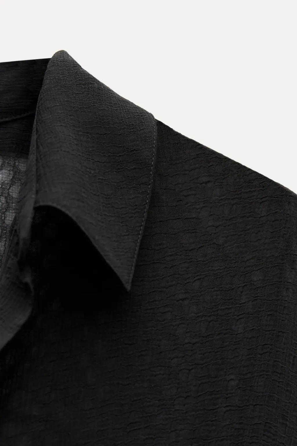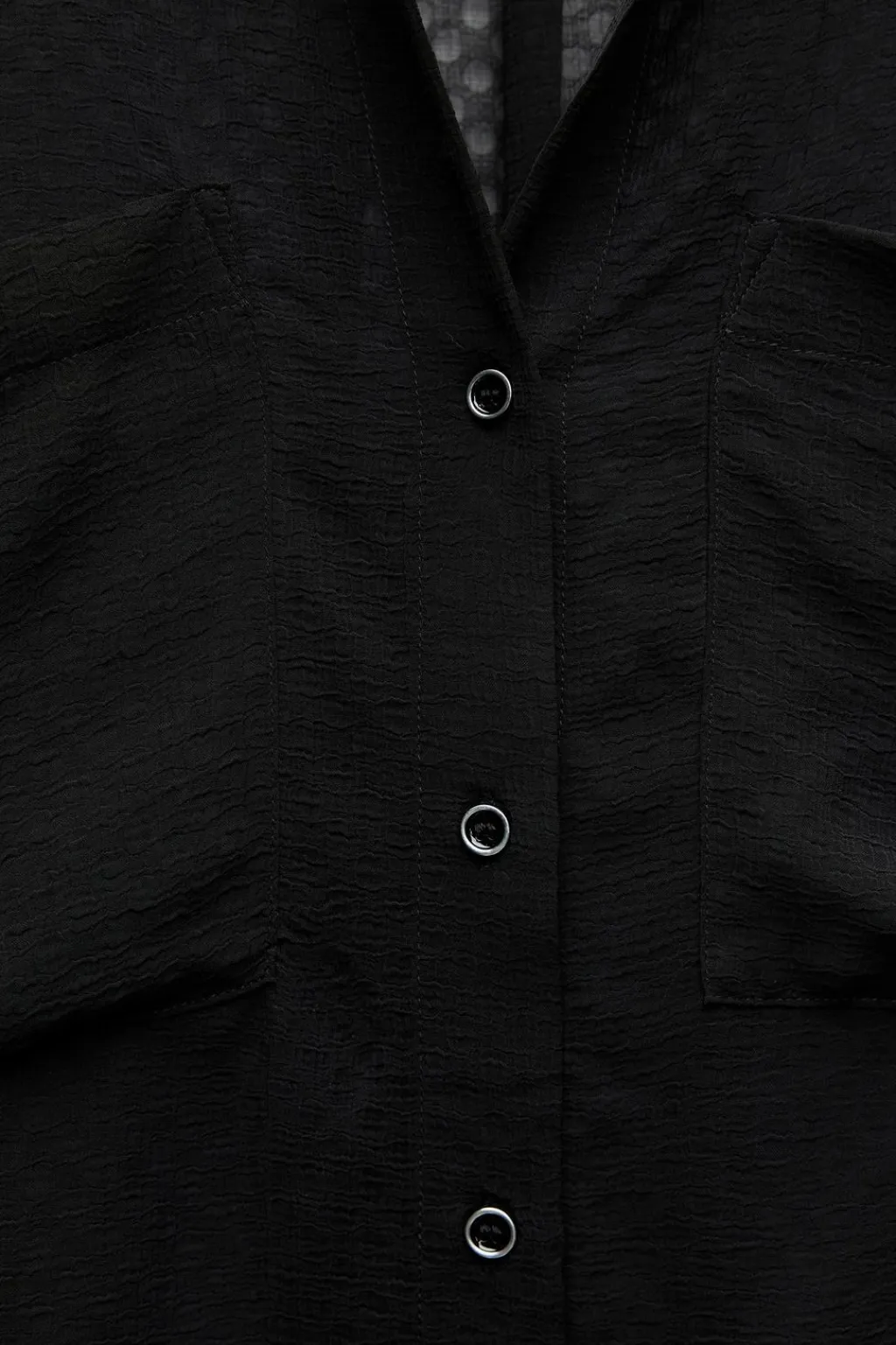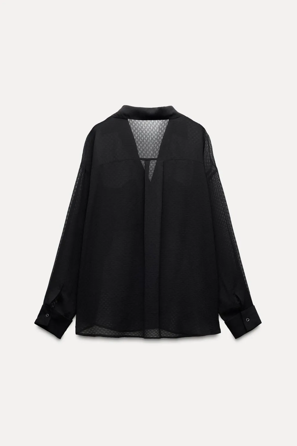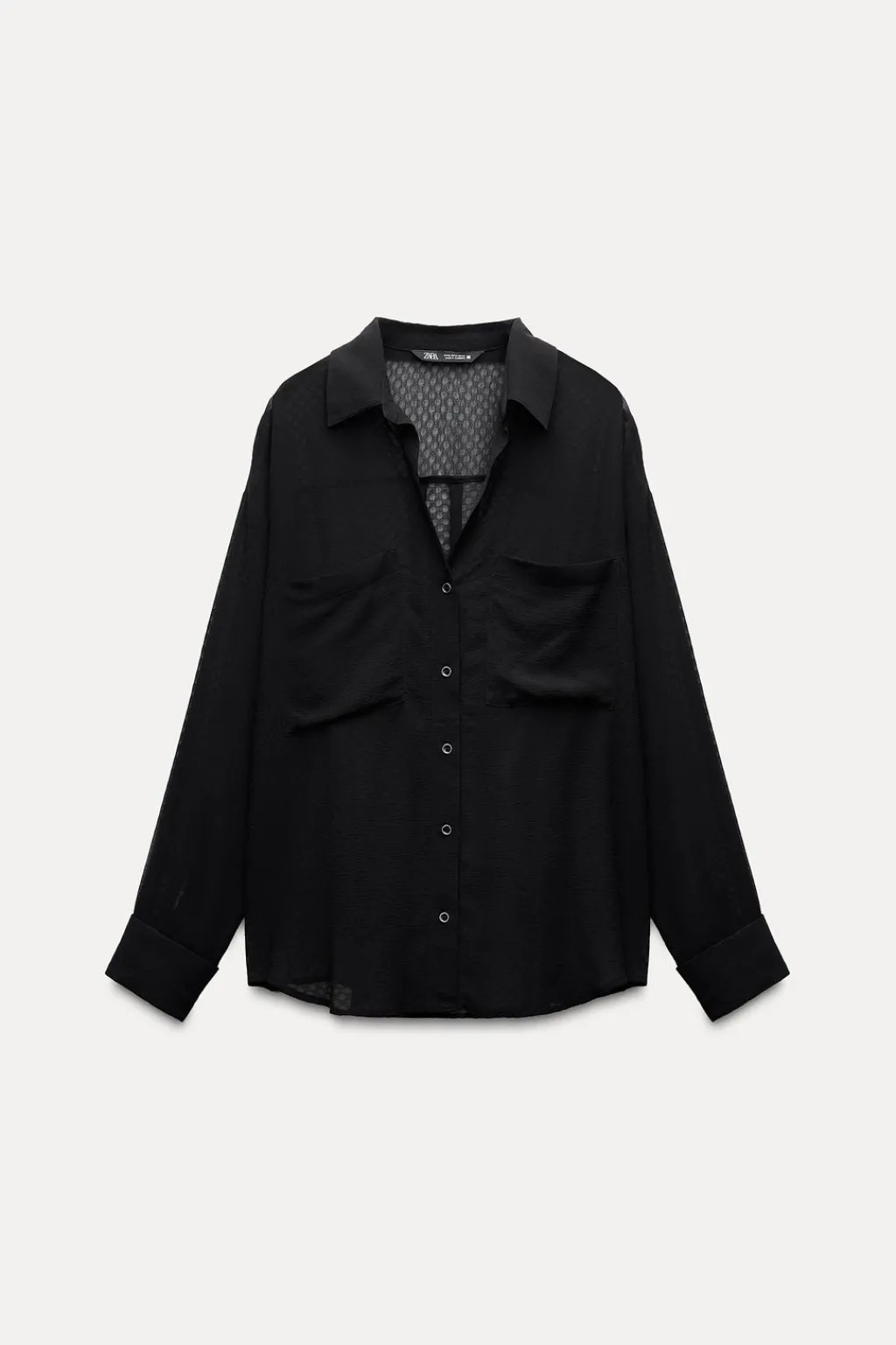 Camisa semitransparente de cuello solapa y escote pico. Manga larga acabada en puño con vuelta. Bolsillos de plastrón en pecho. Cierre frontal con botones.
