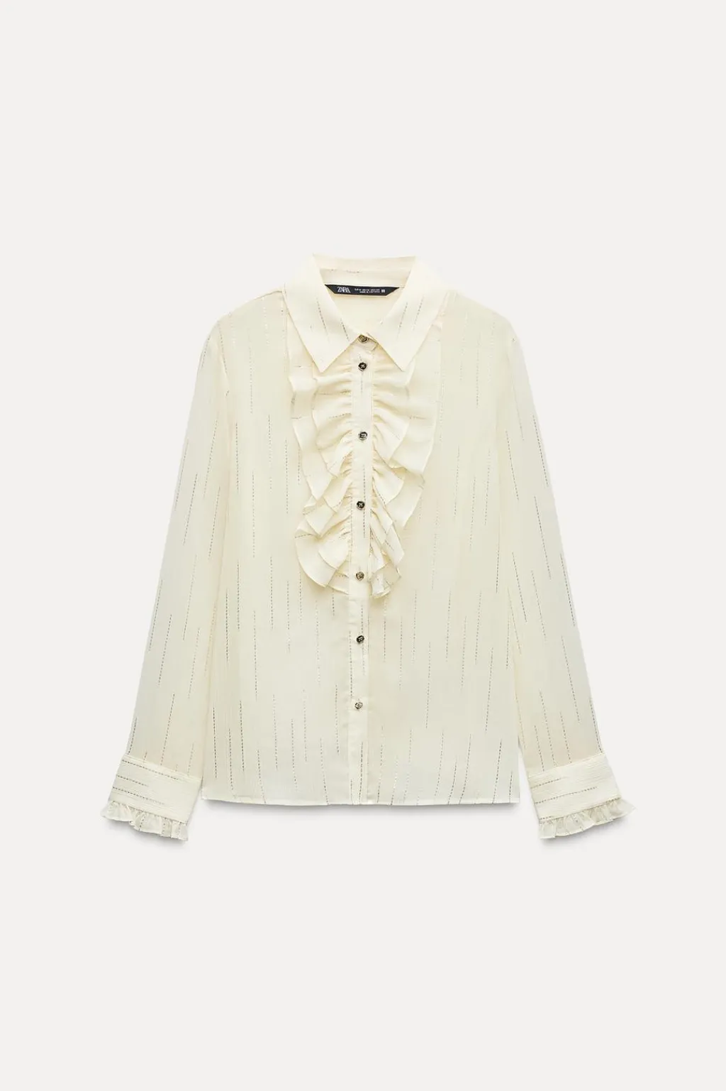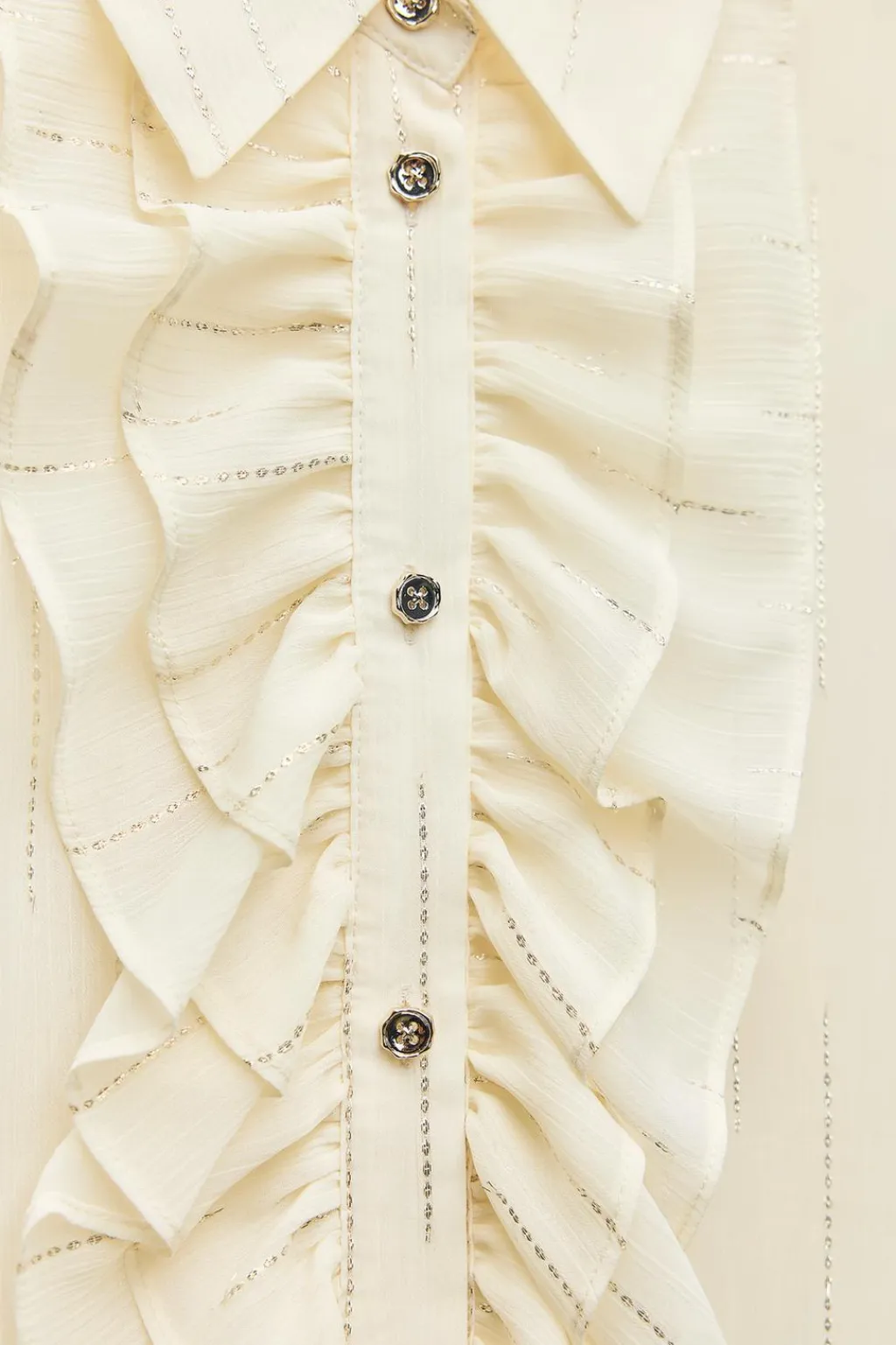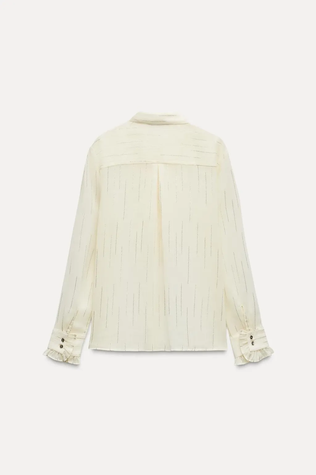 Camisa de cuello solapa y manga larga. Detalle de tejido con hilo metalizado y volantes. Cierre frontal con botones.