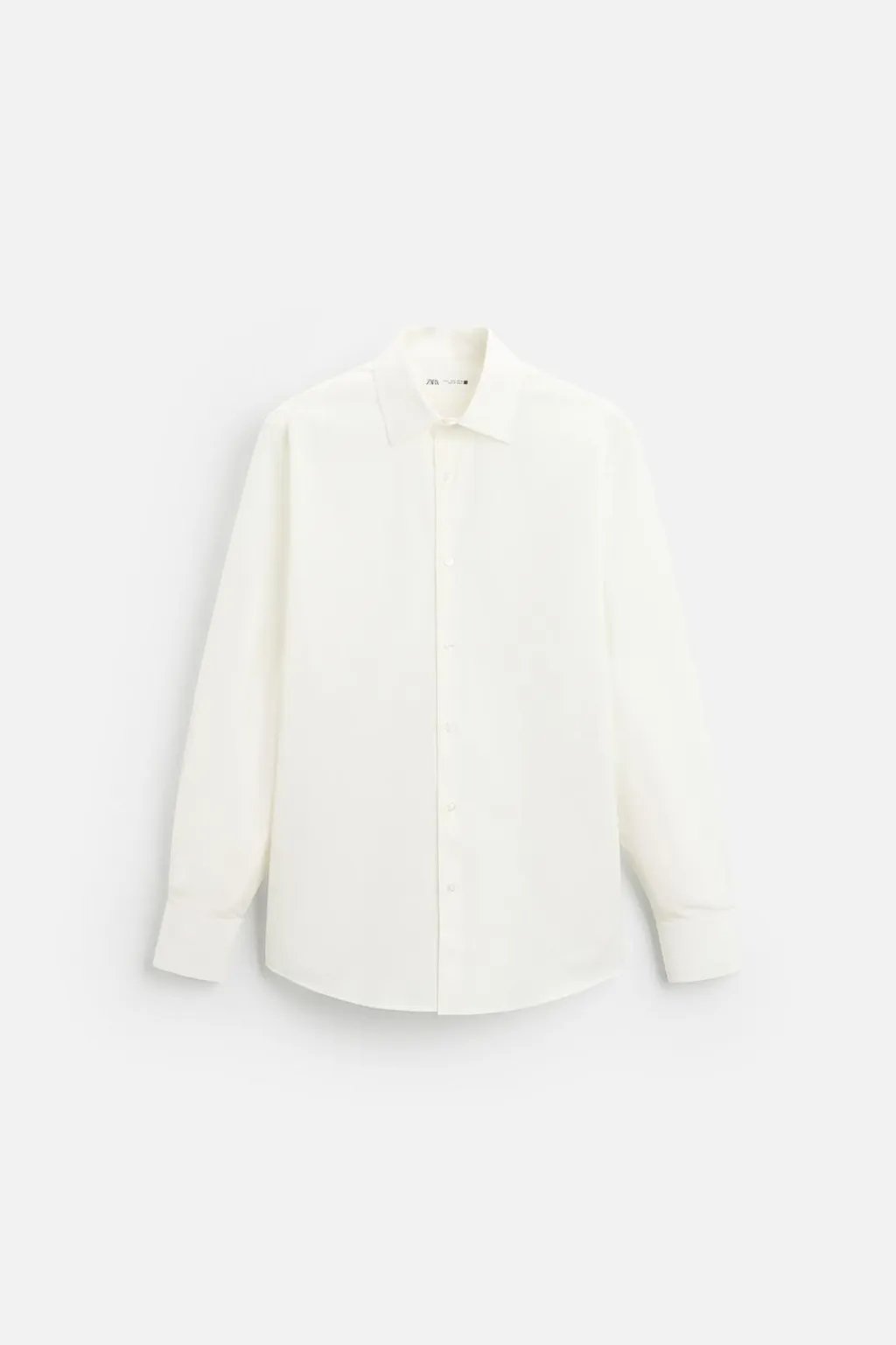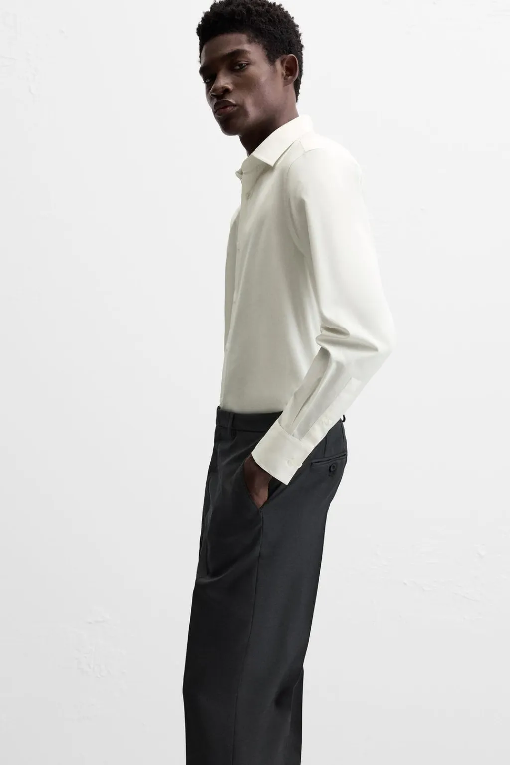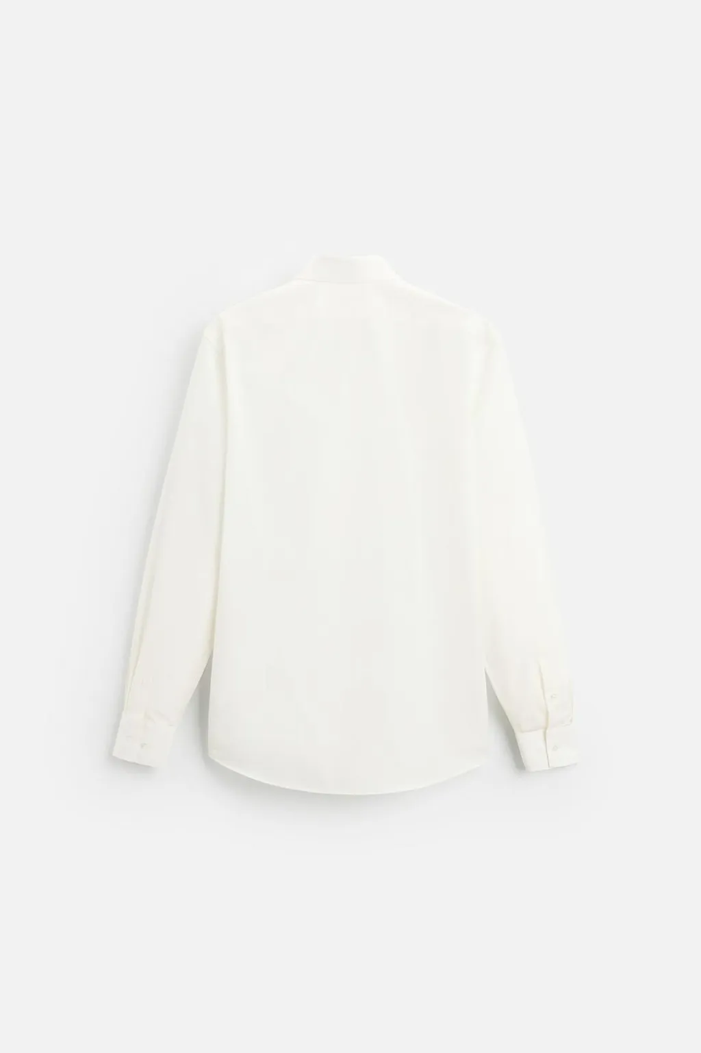Camisa slim fit confeccionada en tejido de algodón. Cuello italiano y manga larga acabada en puño con botón. Cierre frontal de botonadura.
