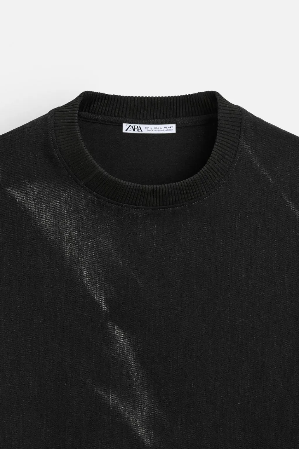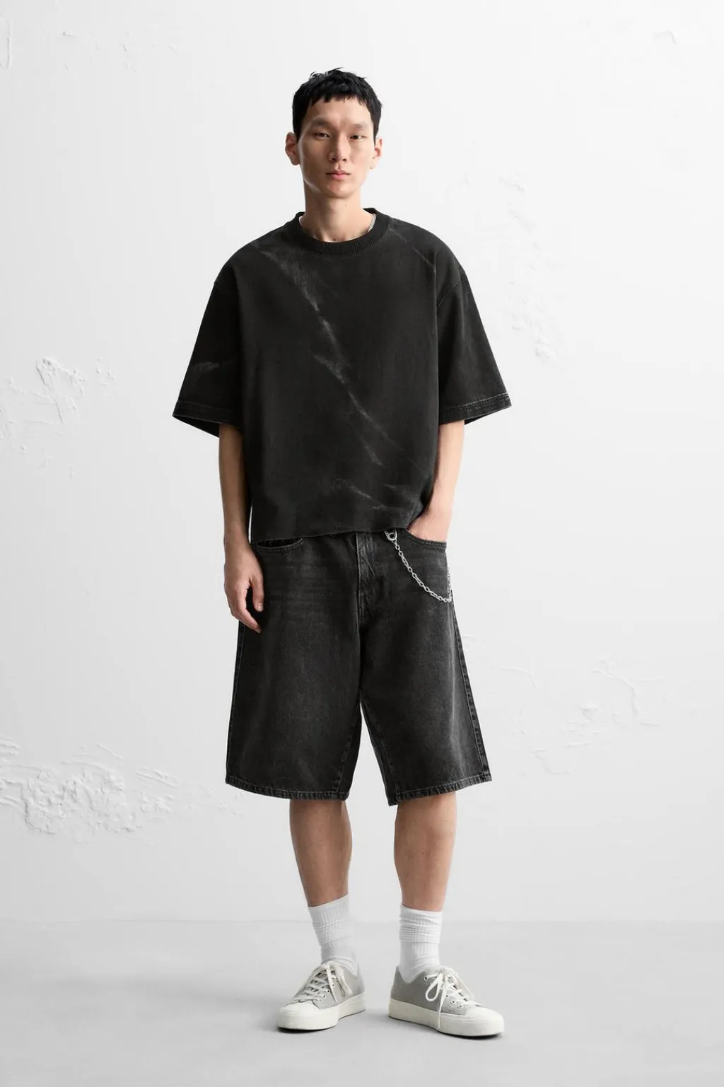 Camiseta relaxed fit confeccionada en denim de algodón. Cuello redondo y manga corta. Efecto lavado. Acabados irregulares.