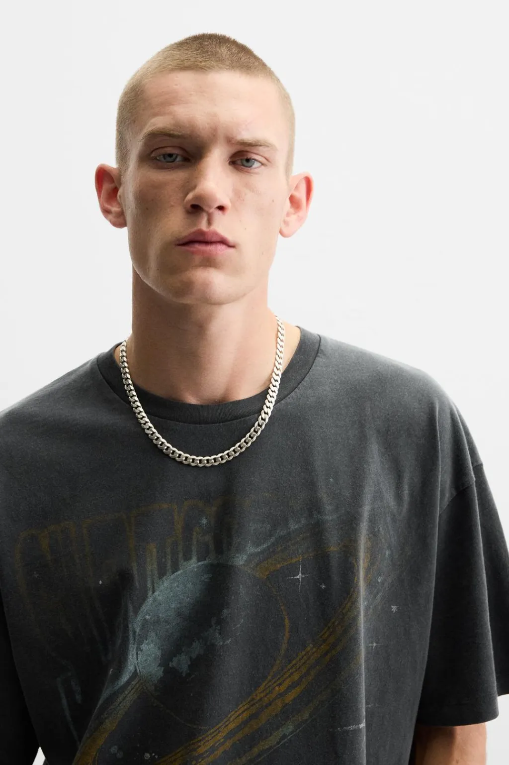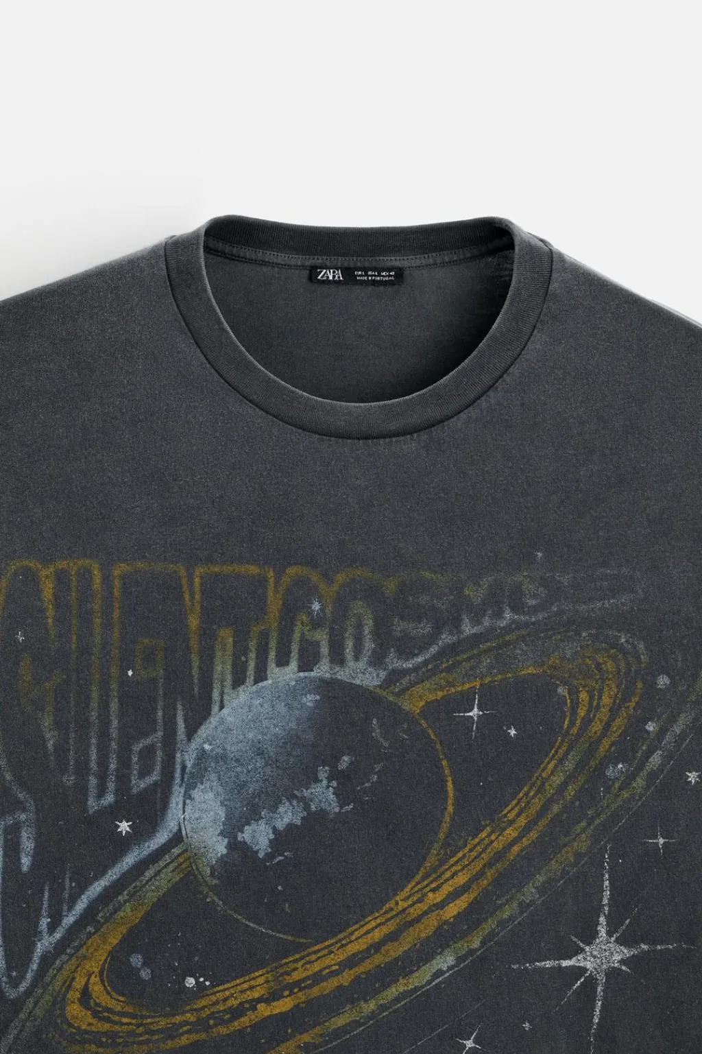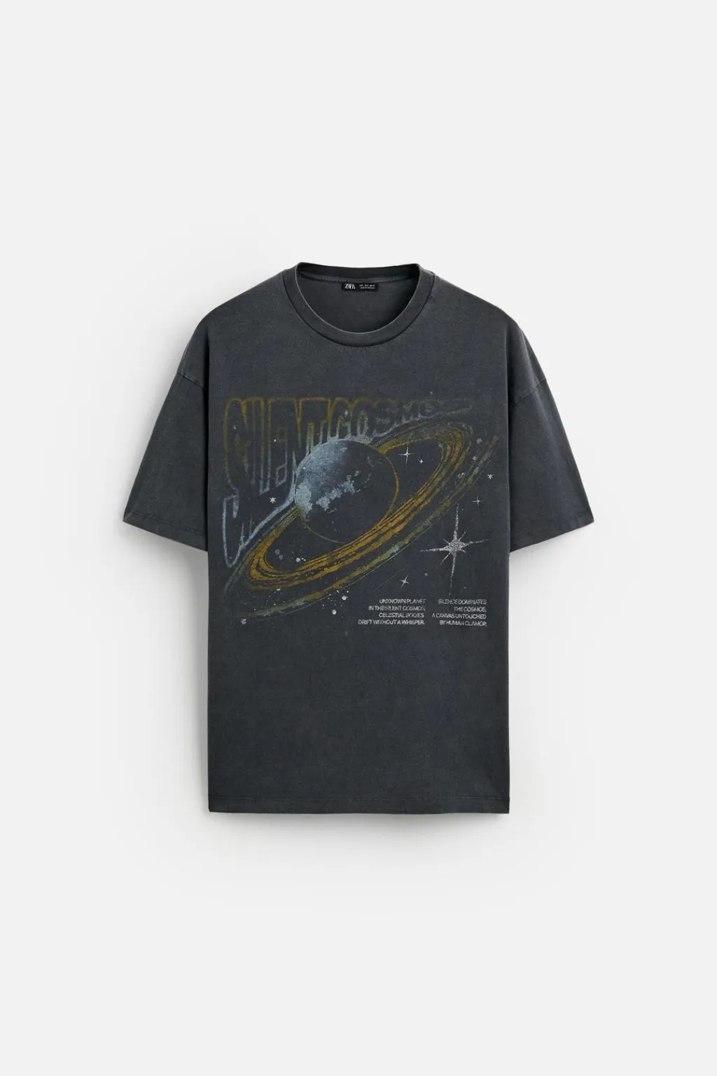 Camiseta relaxed fit con cuello redondo y manga corta. Estampaciones combinadas a contraste en delantero y espalda. Efecto lavado.