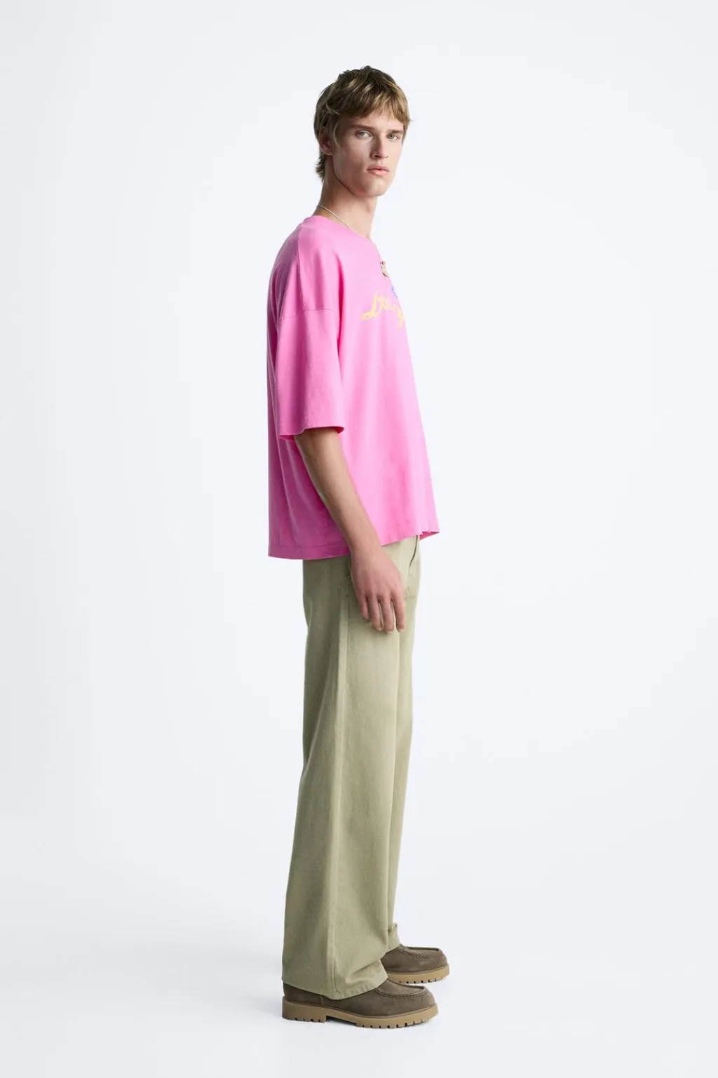 Camiseta amplia con cuello redondo y manga corta. Estampaciones combinadas a contraste. Efecto lavado.