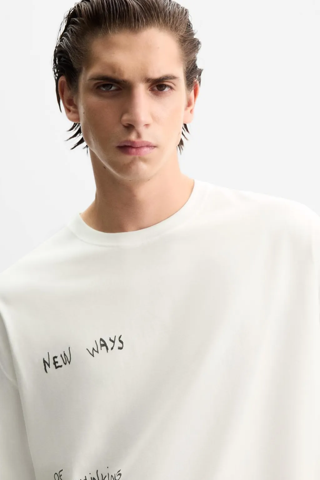 Camiseta relaxed fit. Cuello redondo y manga corta. Estampación frontal de texto combinado a contraste con aplicación de parche en espalda.