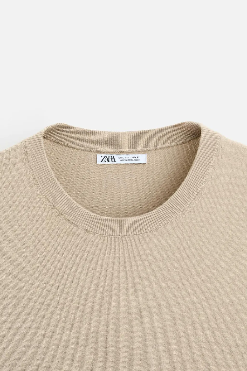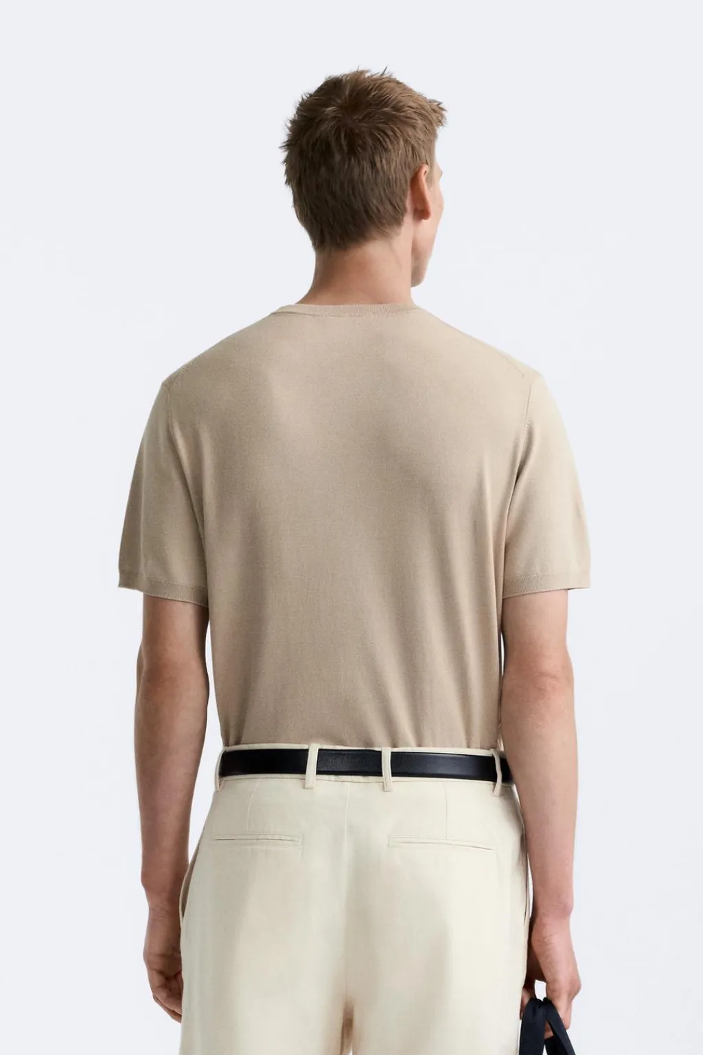 Camiseta de punto tejido en hilatura con mezcla de viscosa. Cuello redondo y manga corta. Acabados en rib.