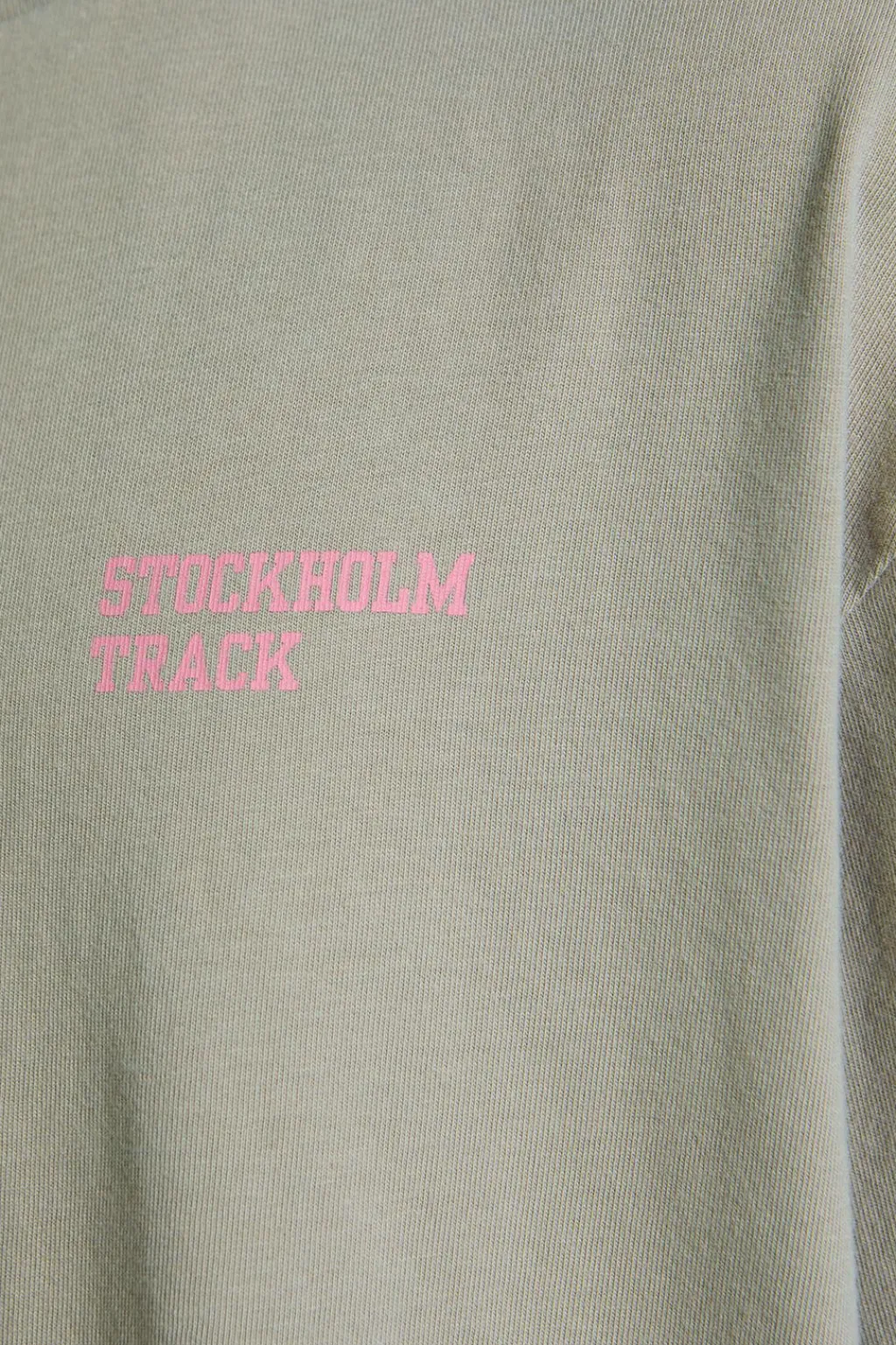 Camiseta amplia confeccionado en tejido de algodón. Cuello redondo y manga corta. Estampaciones combinadas a contraste en delantero y espalda.