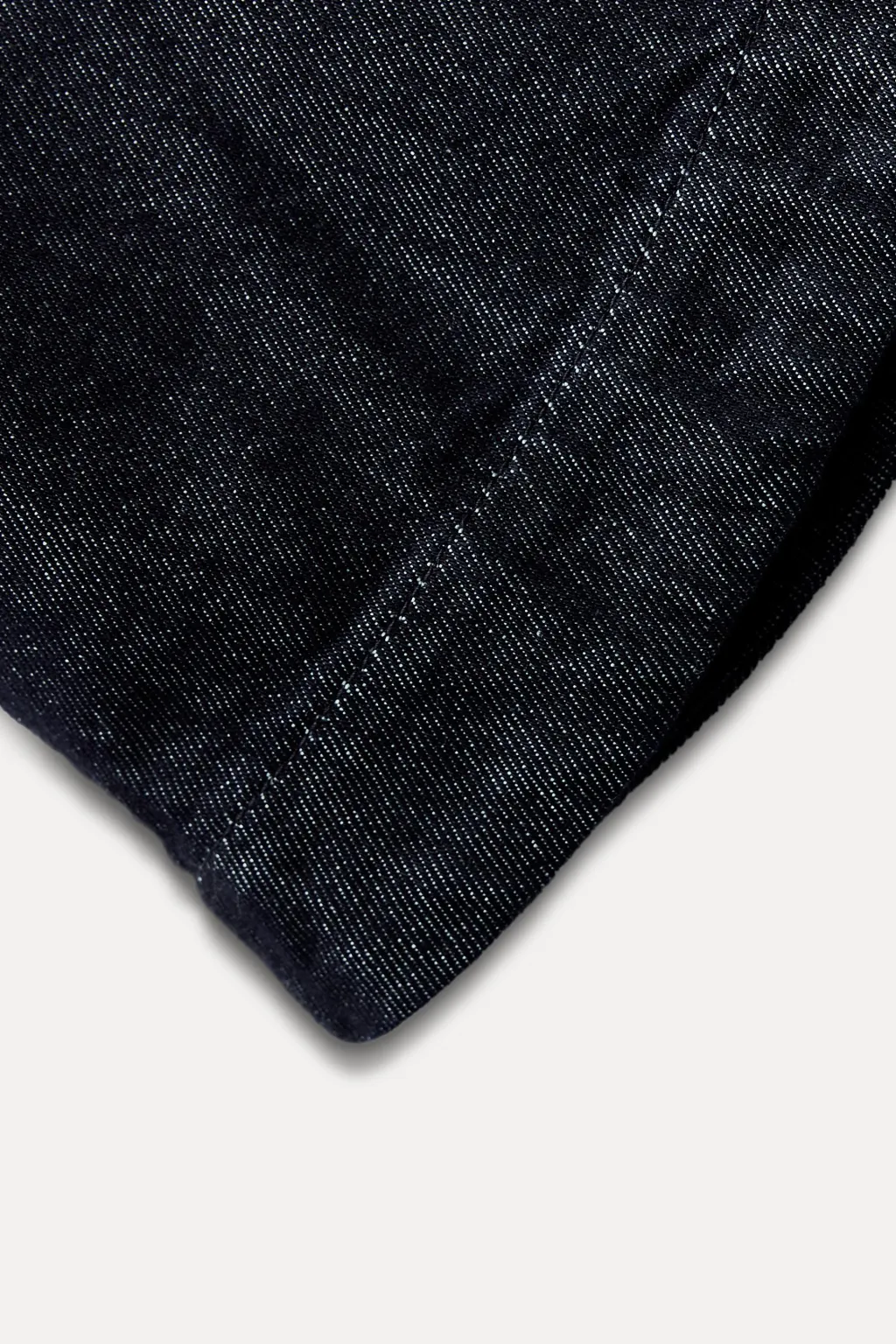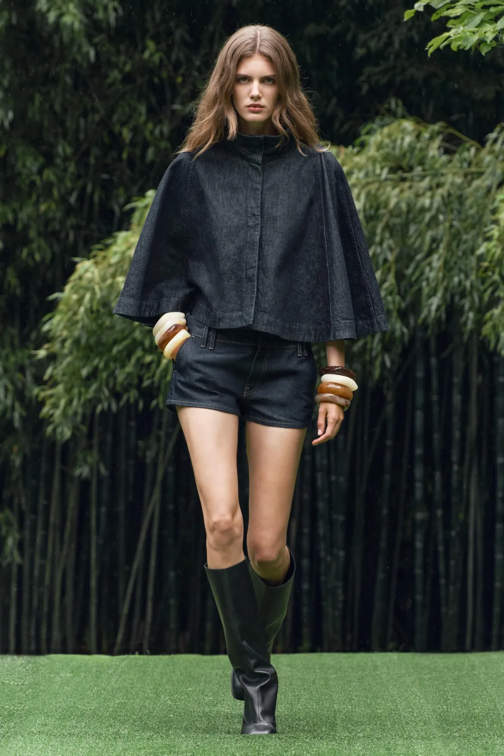 Capa confeccionada en tejido denim de cuello subido. Cierre frontal con botones a presión ocultos por sopata.