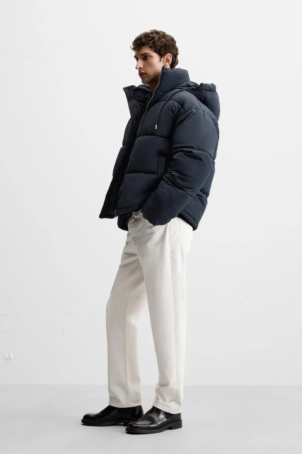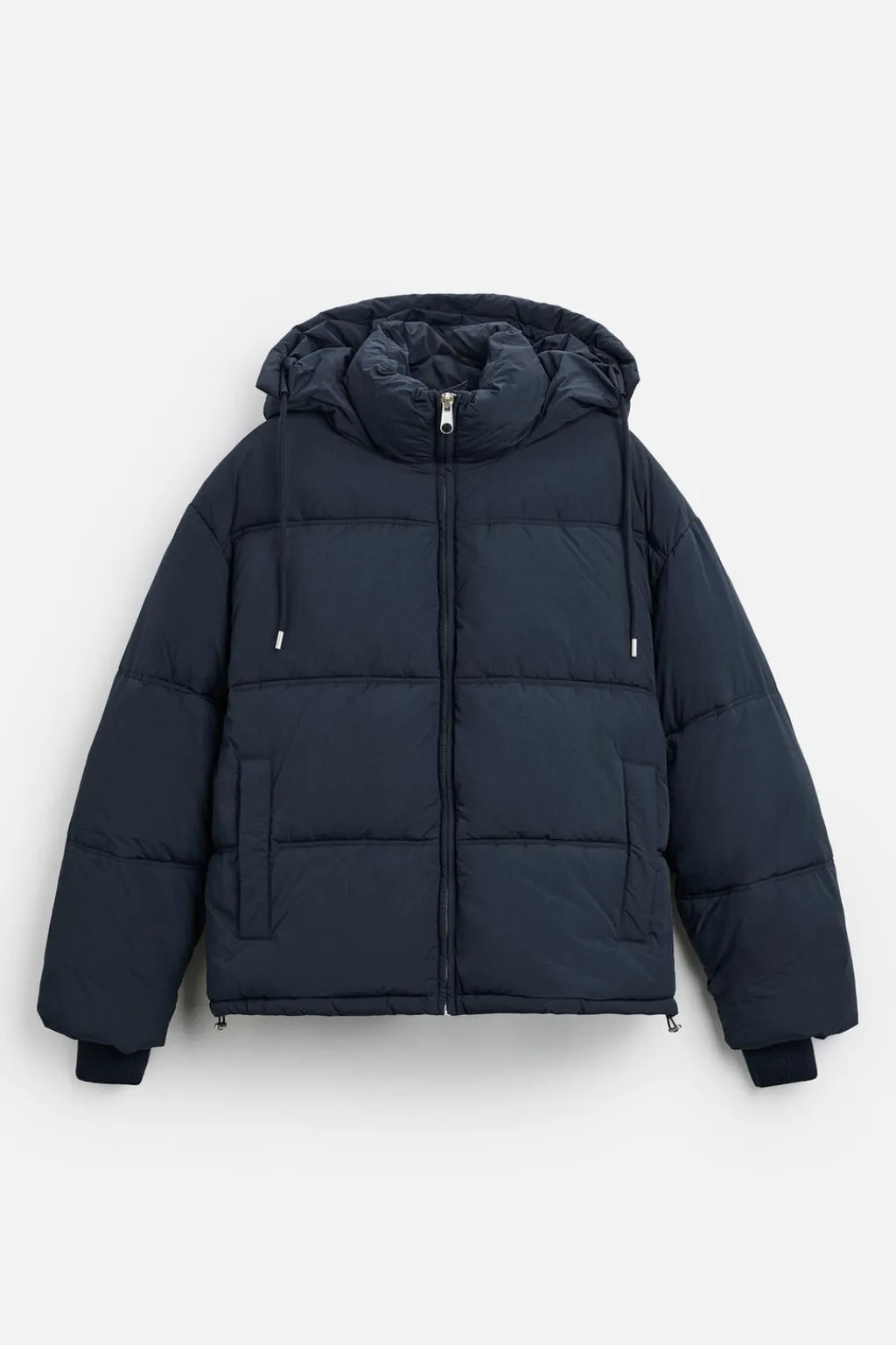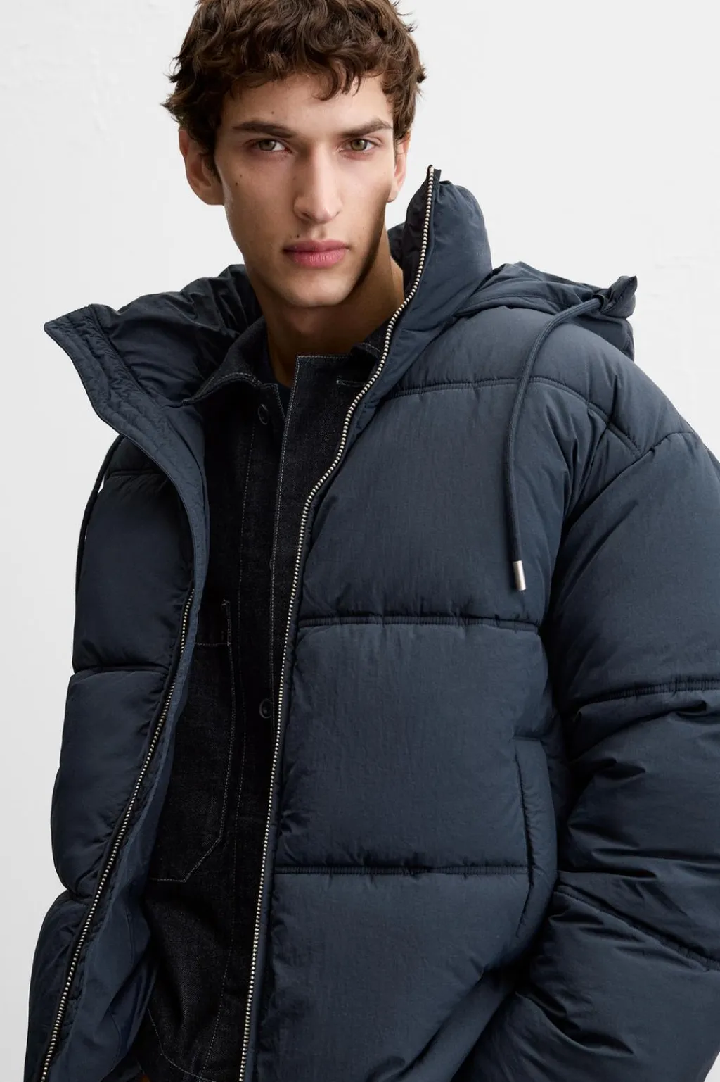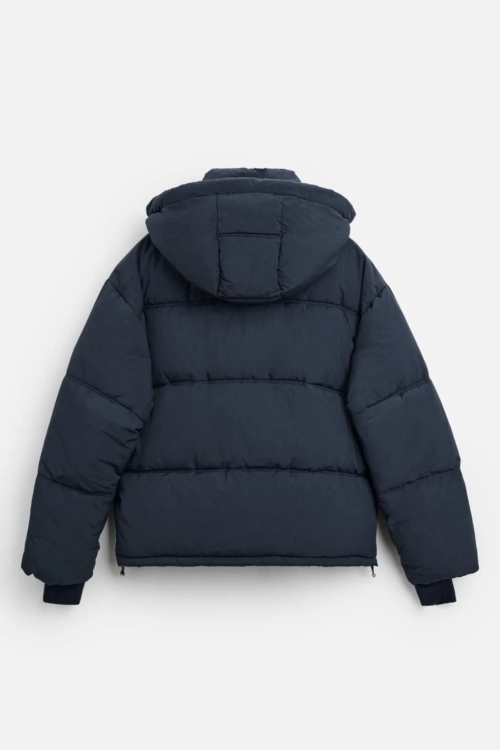 Cazadora relaxed fit confeccionada en tejido técnico. Cuello subido con capucha ajustable. Manga larga acabada en puño con el interior de rib. Bolsillos de vivo en cadera y detalle de bolsillo interior. Cierre frontal con cremallera.