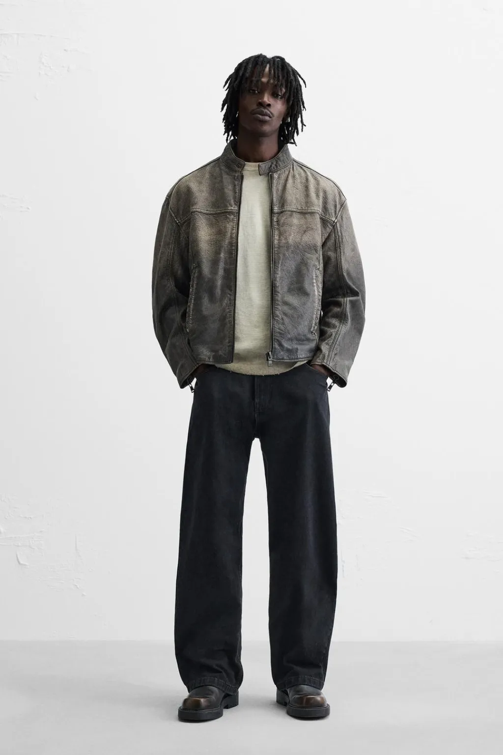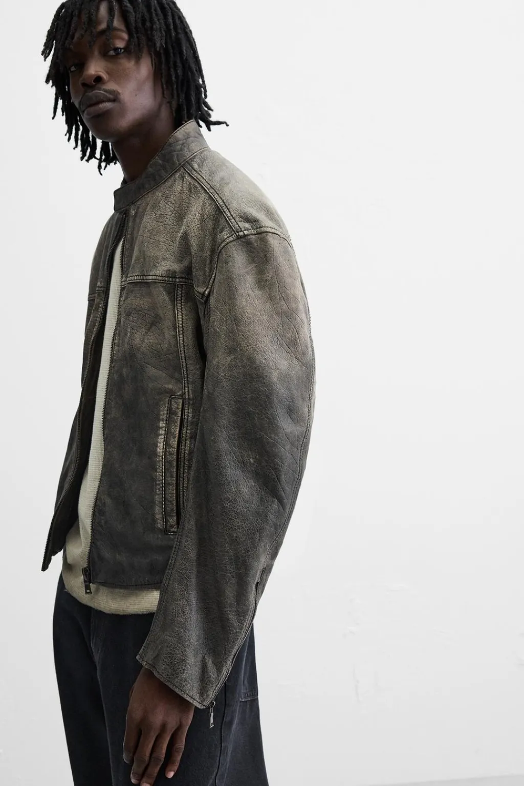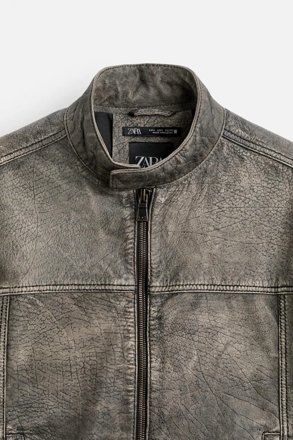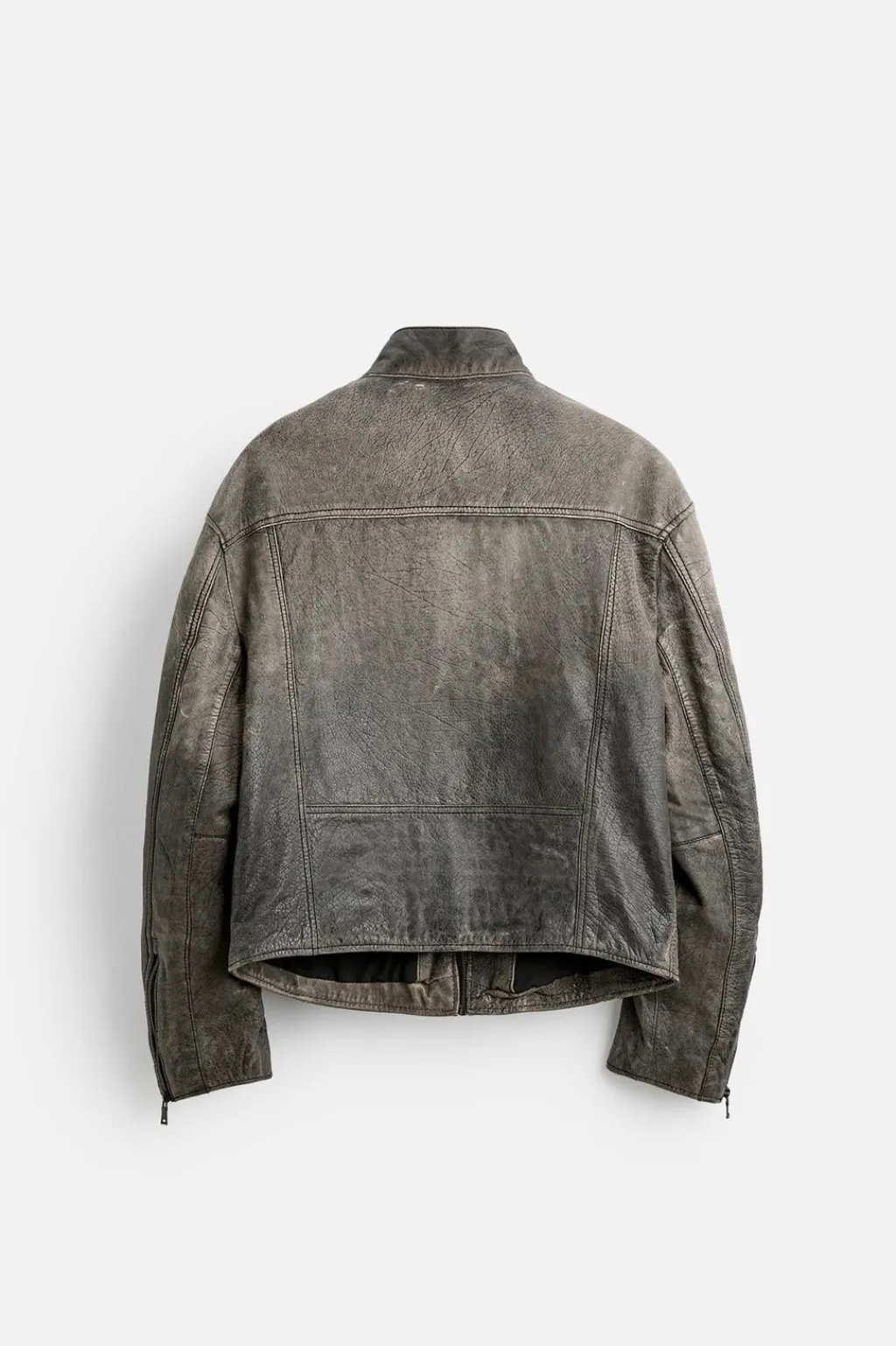Cazadora cropped fit confeccionada en piel con acabado lavado. Cuello tira y manga larga acabada en puño ajustable con cremallera. Bolsillos de vivo en cadera. Cierre frontal con cremallera.