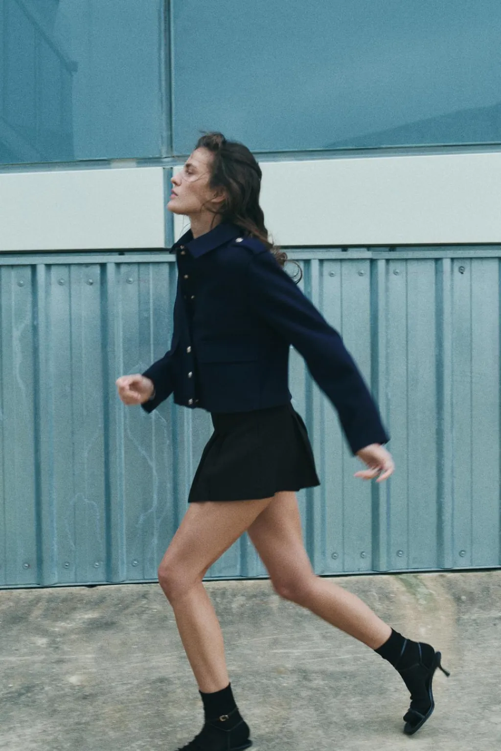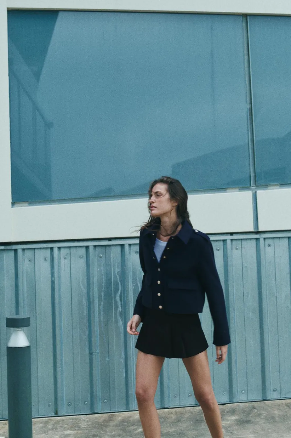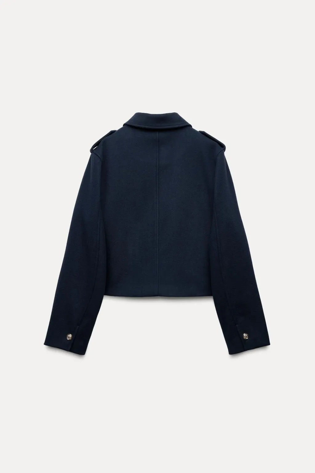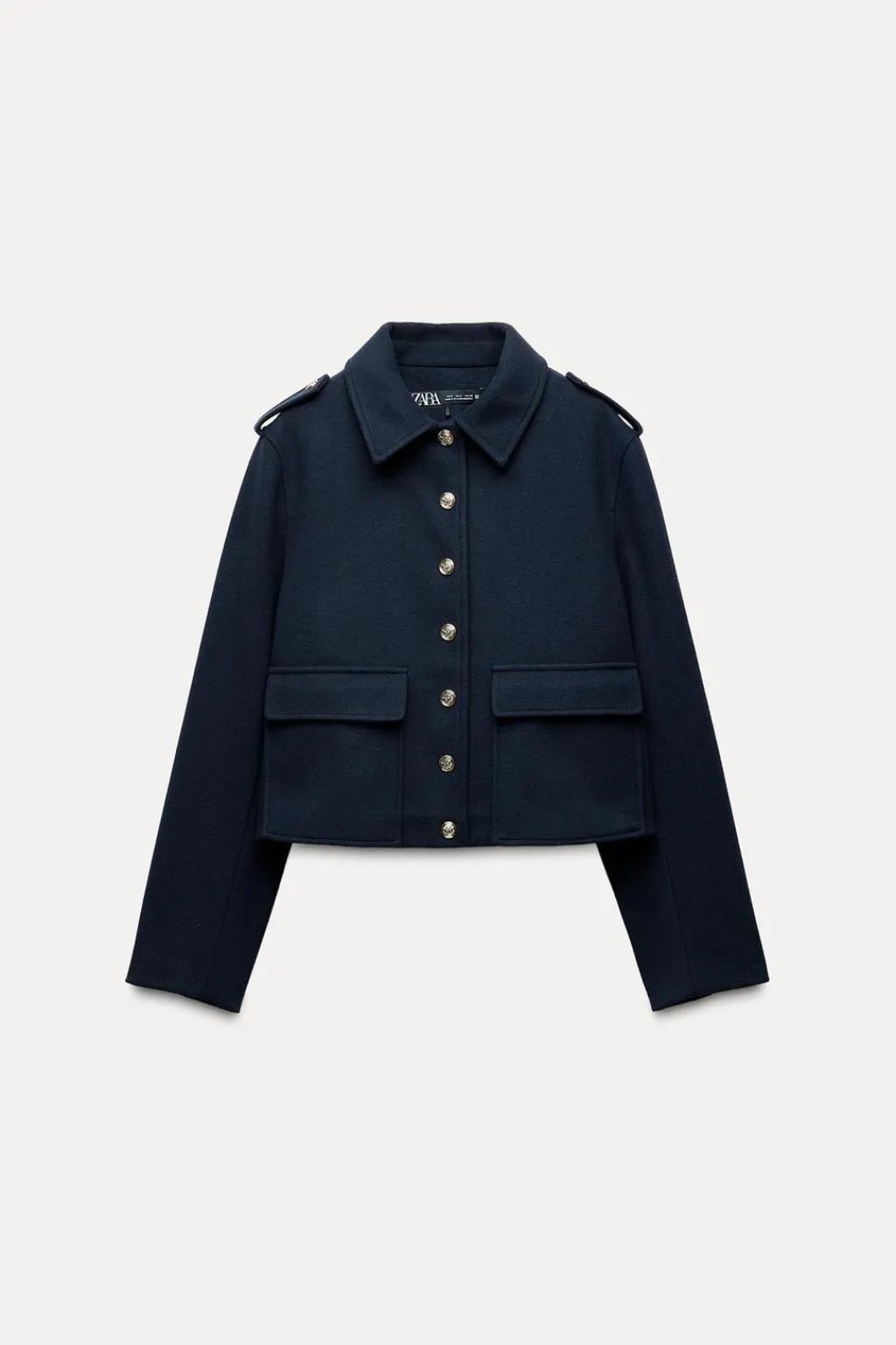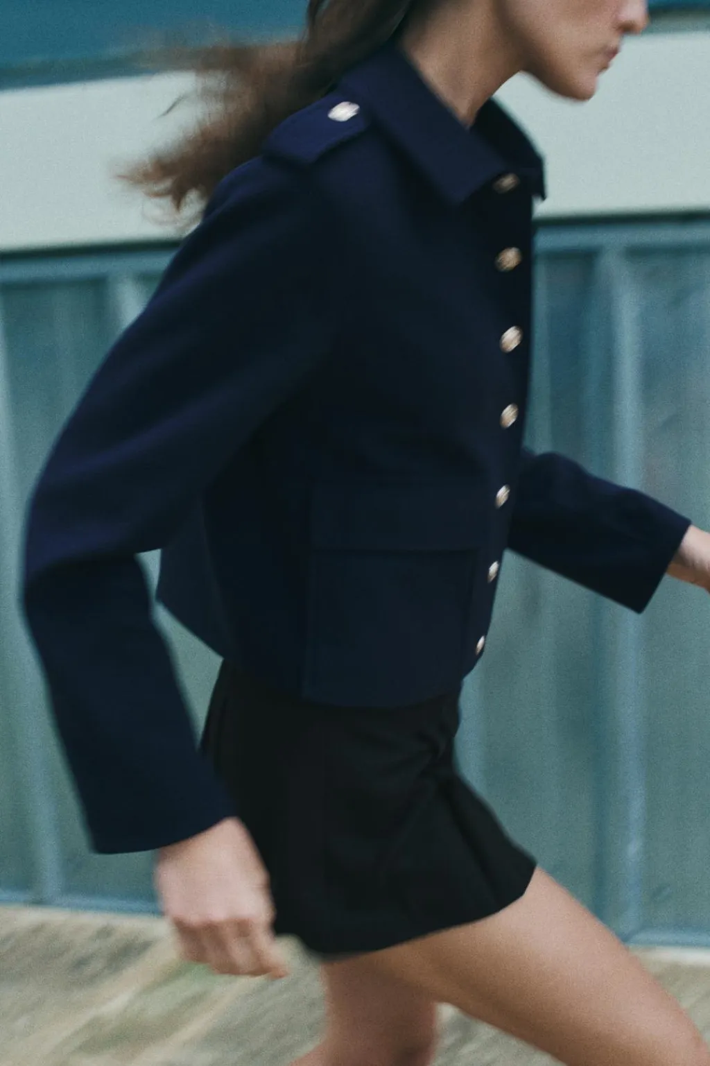 Cazadora de cuello solapa y manga larga con trabillas en hombros. Bolsillos delanteros de plastrón con solapa. Cierre frontal con botones dorados con relieve.