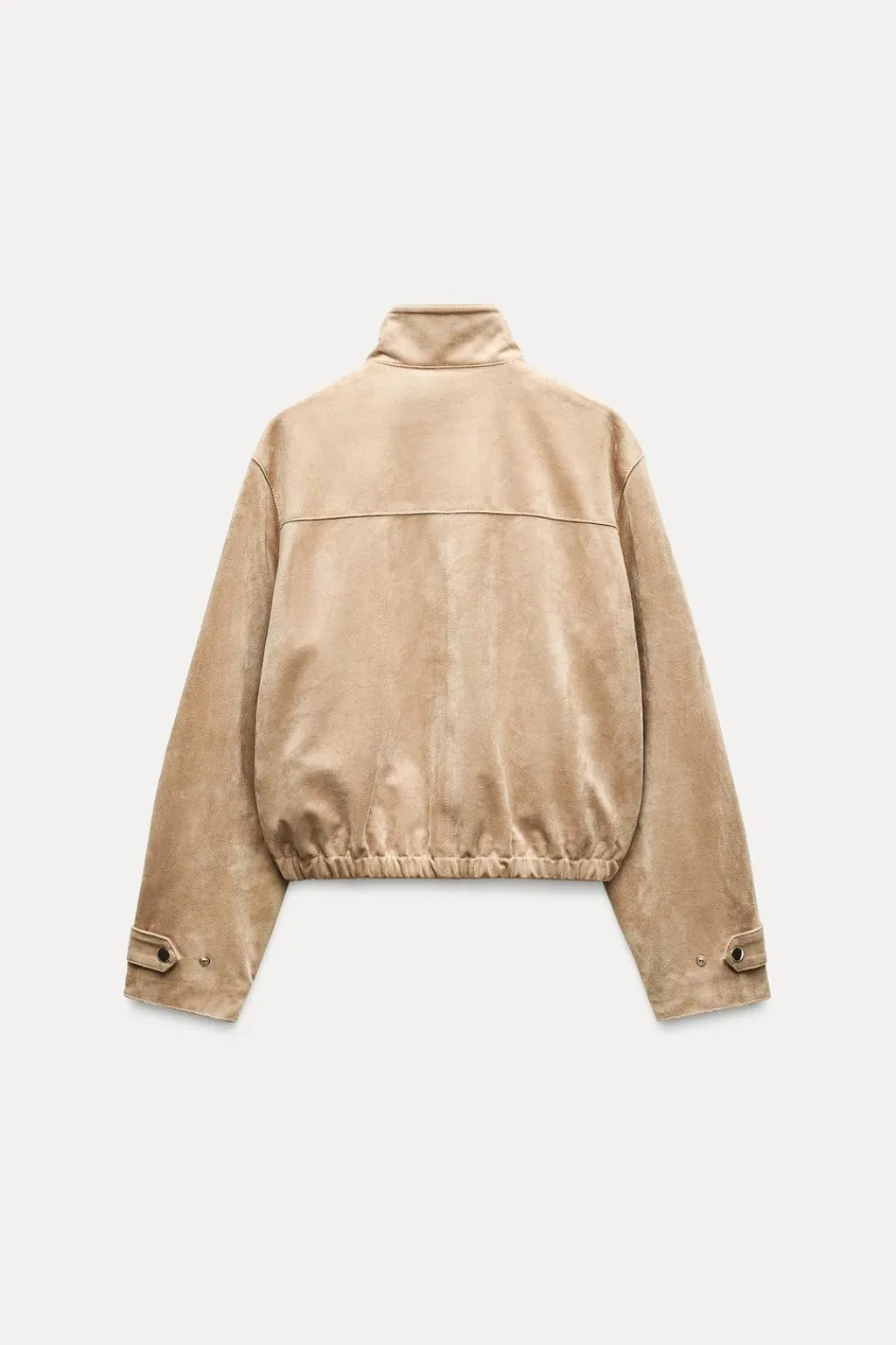 Cazadora de cuello alto y manga larga. Bolsillos delanteros de vivo. Bajo acabado con elástico en espalda. Cierre frontal con cremallera oculta y botones a presión.