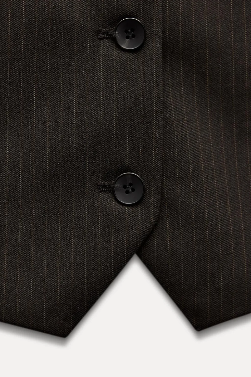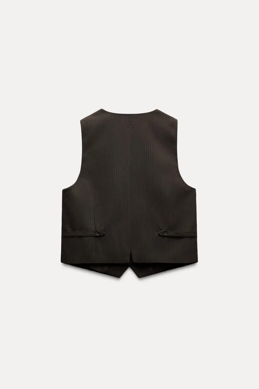 Chaleco de escote pico y manga sisa. Detalle de trabillas ajustables en laterales. Forro interior combinado. Cierre frontal con botones.