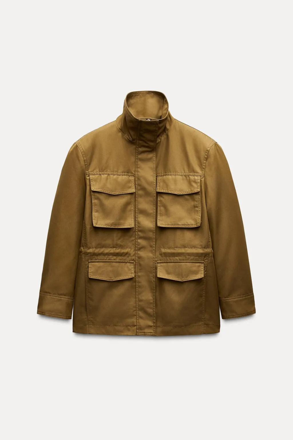Chaqueta confeccionada en hilatura con mezcla de algodón. Cuello alto y manga larga acabada en puño- Bolsillos de plastrón con solapa en delantero. Cintura ajustable con cordones. Cierre frontal con cremallera metálica oculta por solapa.