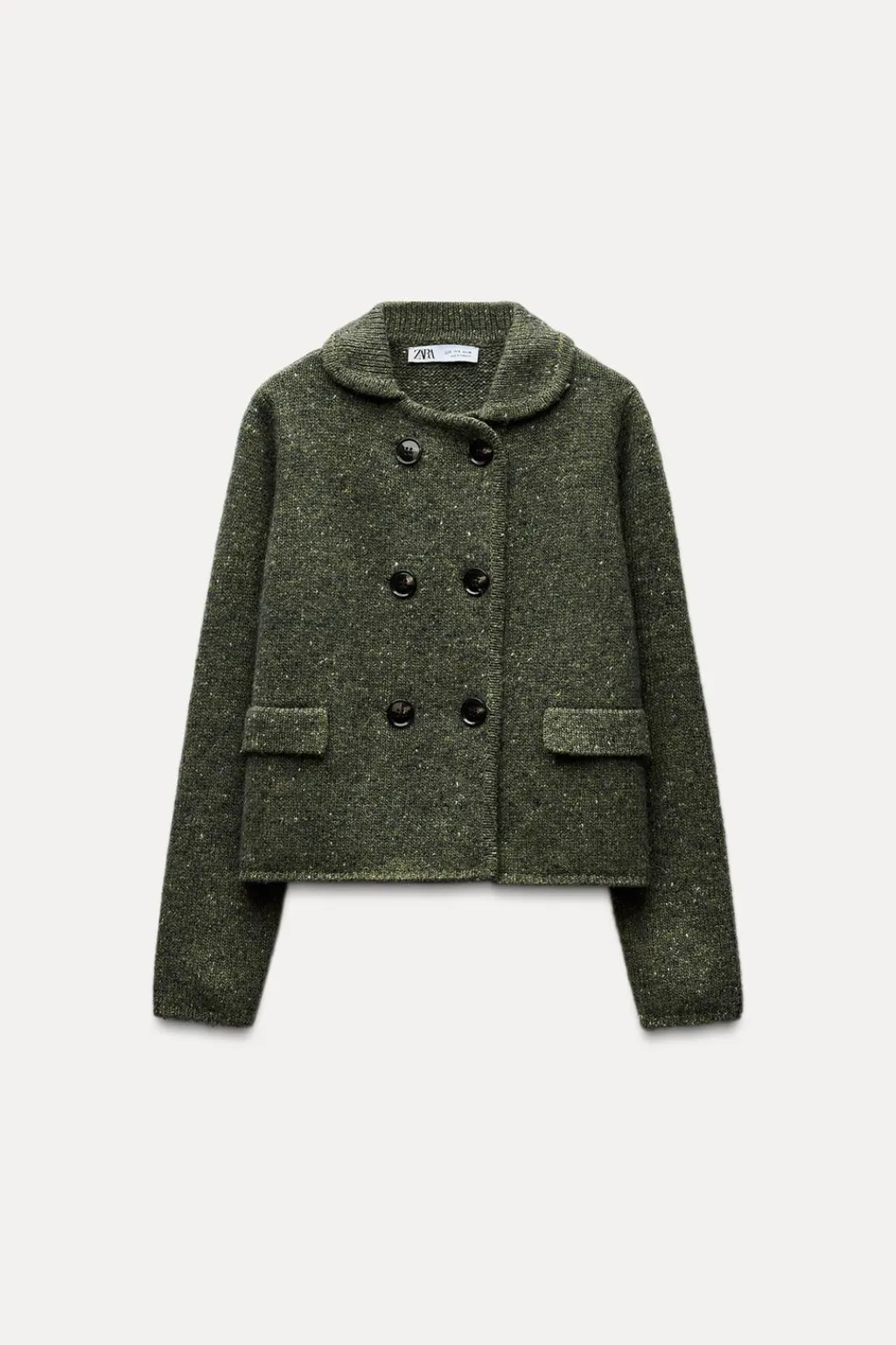 Chaqueta confeccionada con lana. Cuello solapa y manga larga. Detalle de tapetas delanteras. Cierre frontal cruzado con botones.