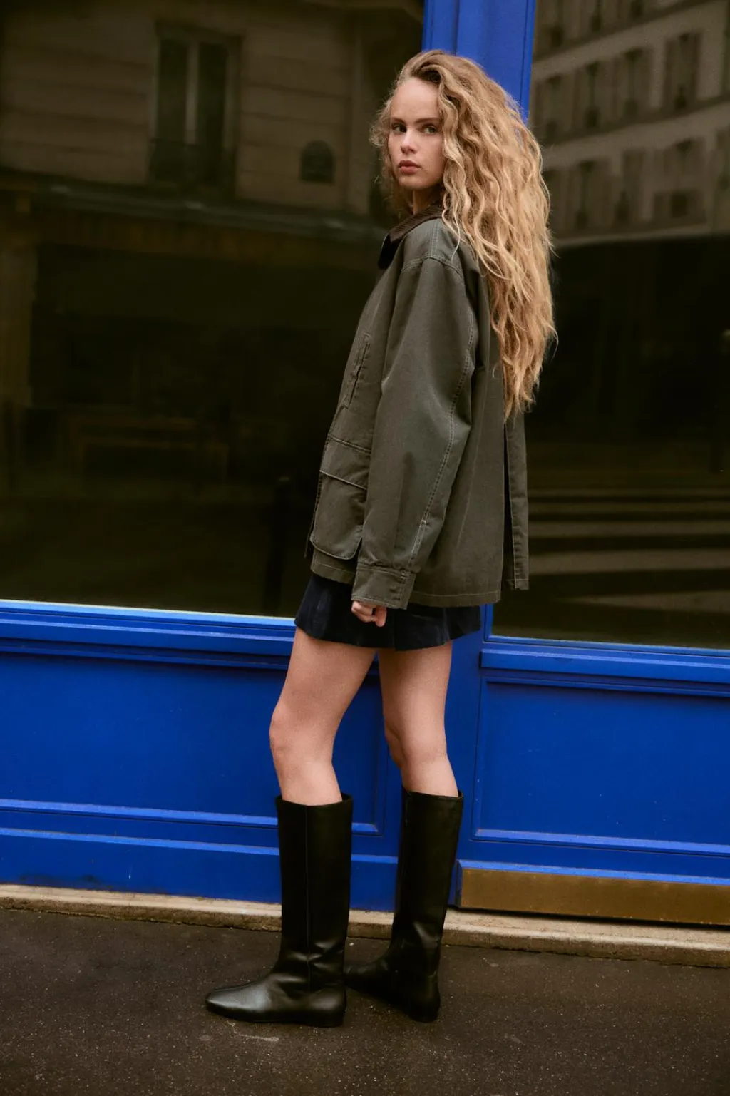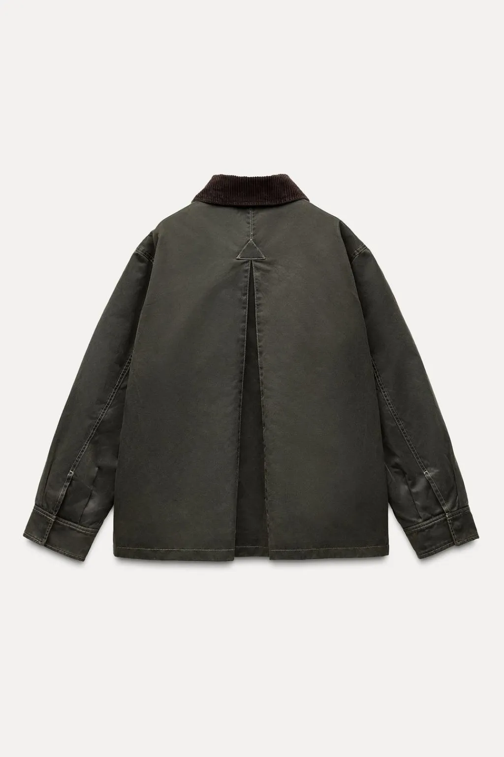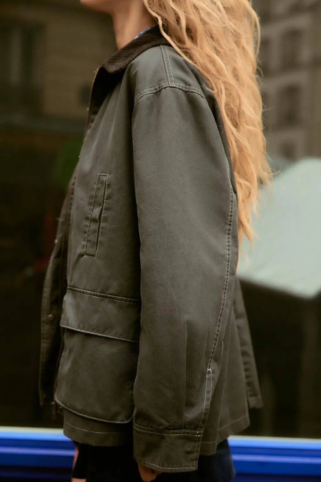 Chaqueta con cuello solapa acabado en pana a contraste. Manga larga acabada en puño. Bolsillos de plastrón y vivo en delantero. Detalle de pinza en espalda. Cierre frontal con cremallera y botones a presión.