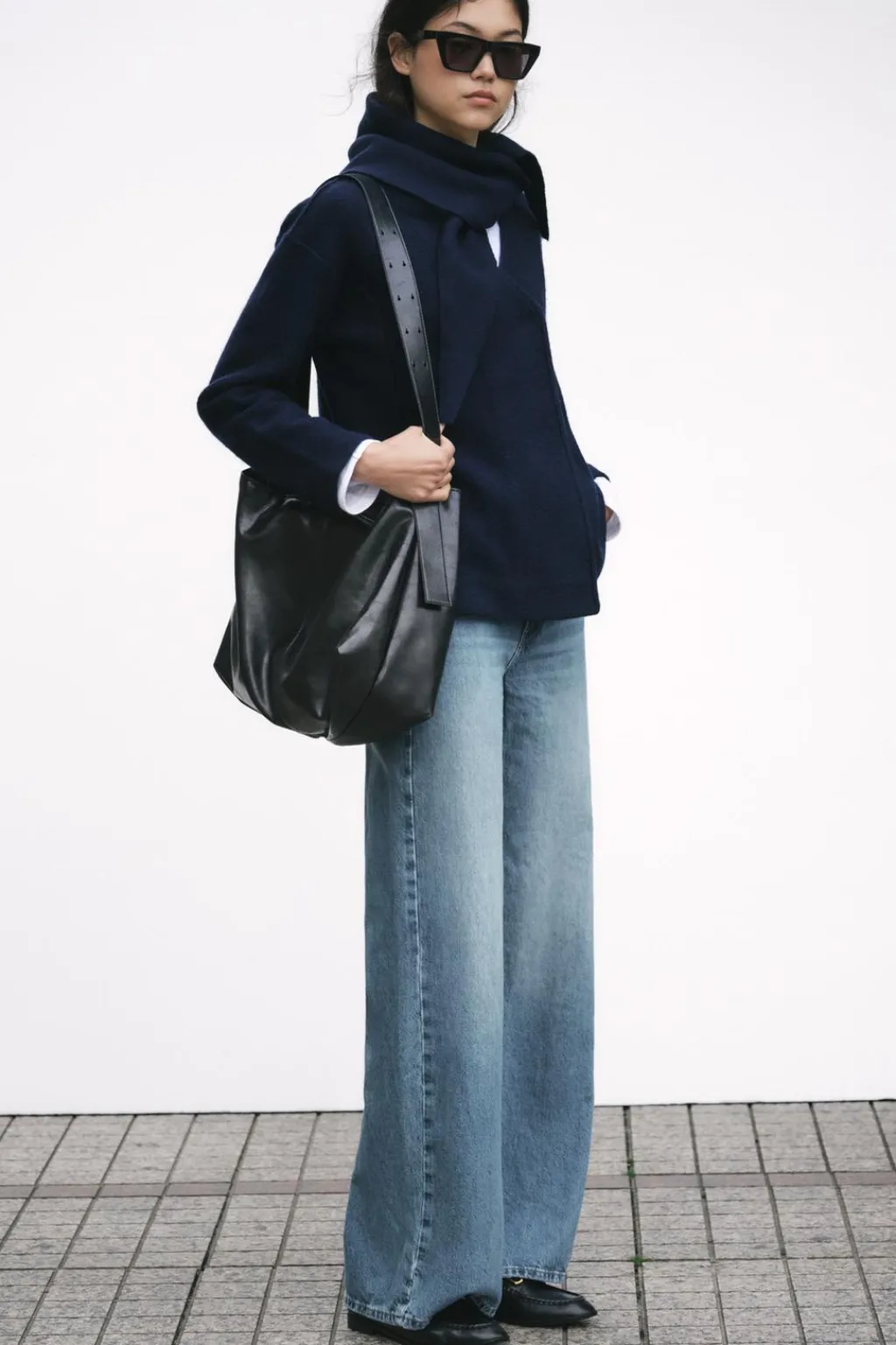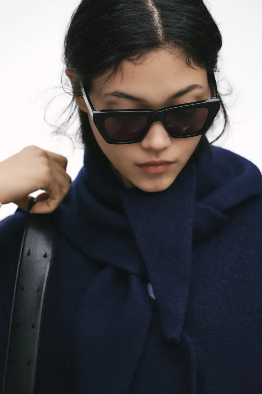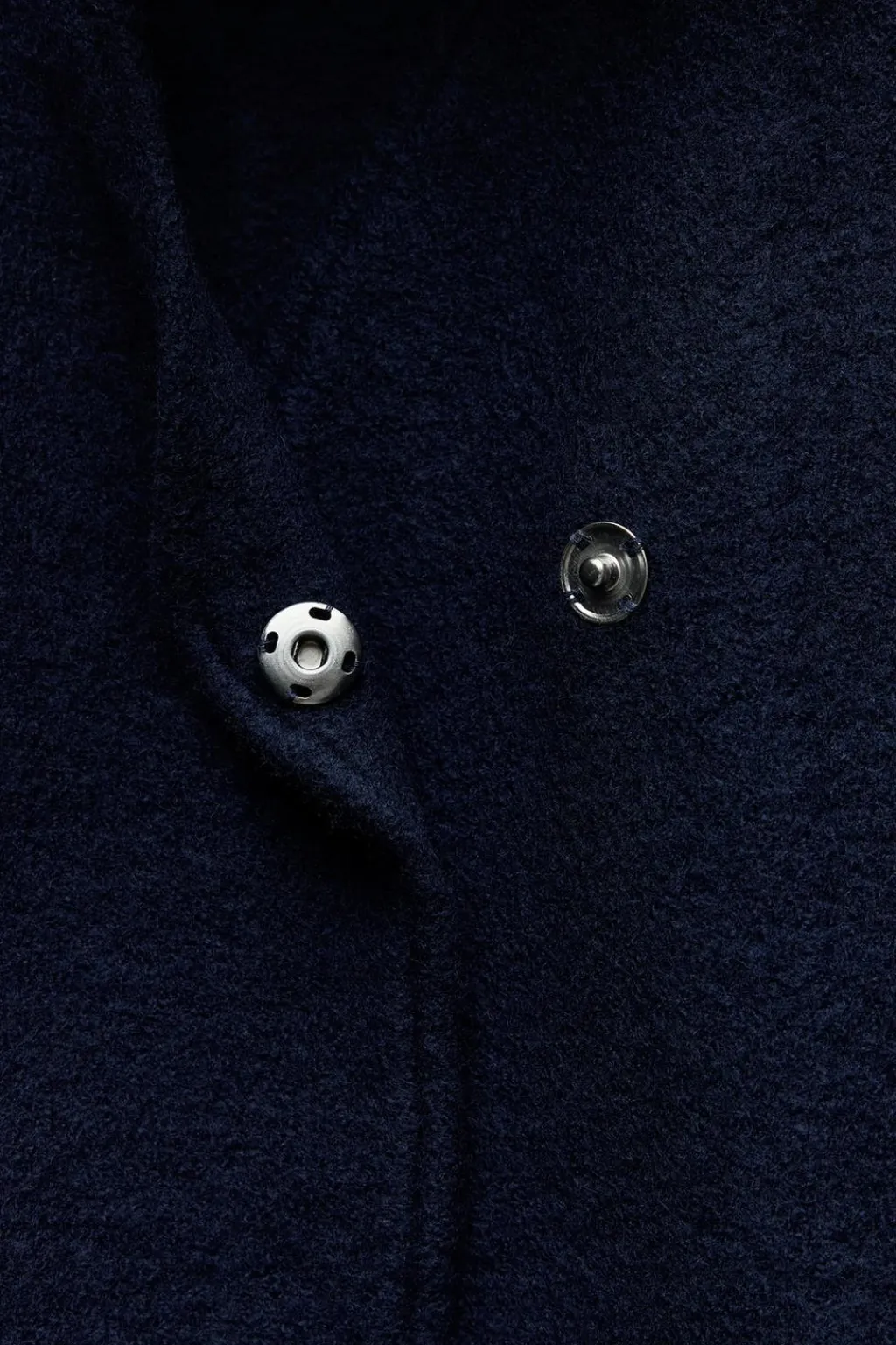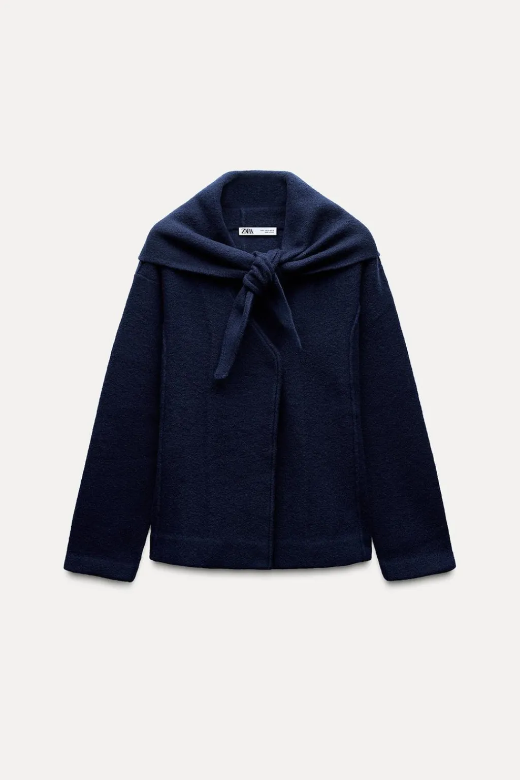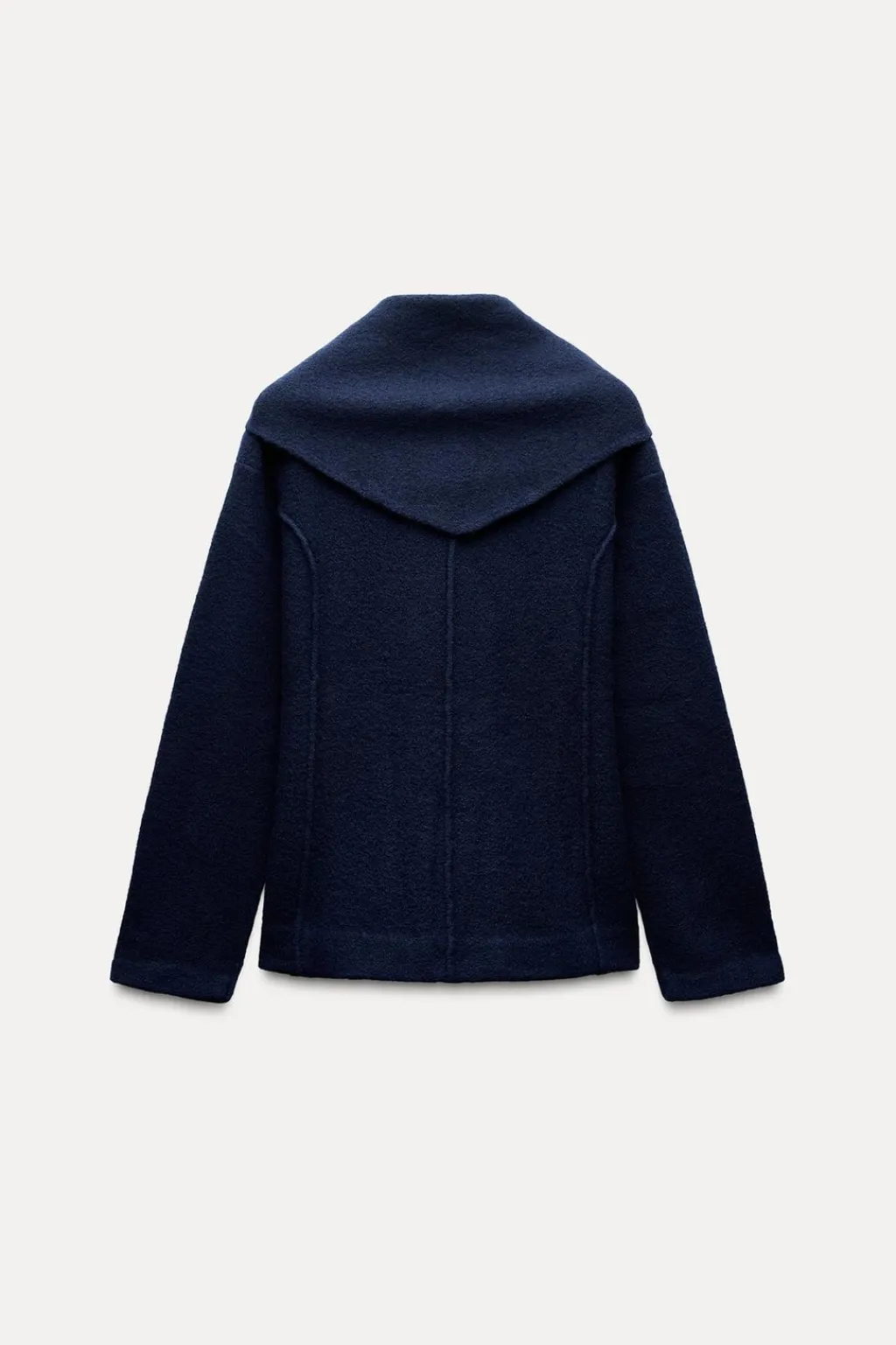 Chaqueta confeccionada en 100% lana. Cuello pico con pañuelo a tono y manga larga. Cierre frontal cruzado con botones.