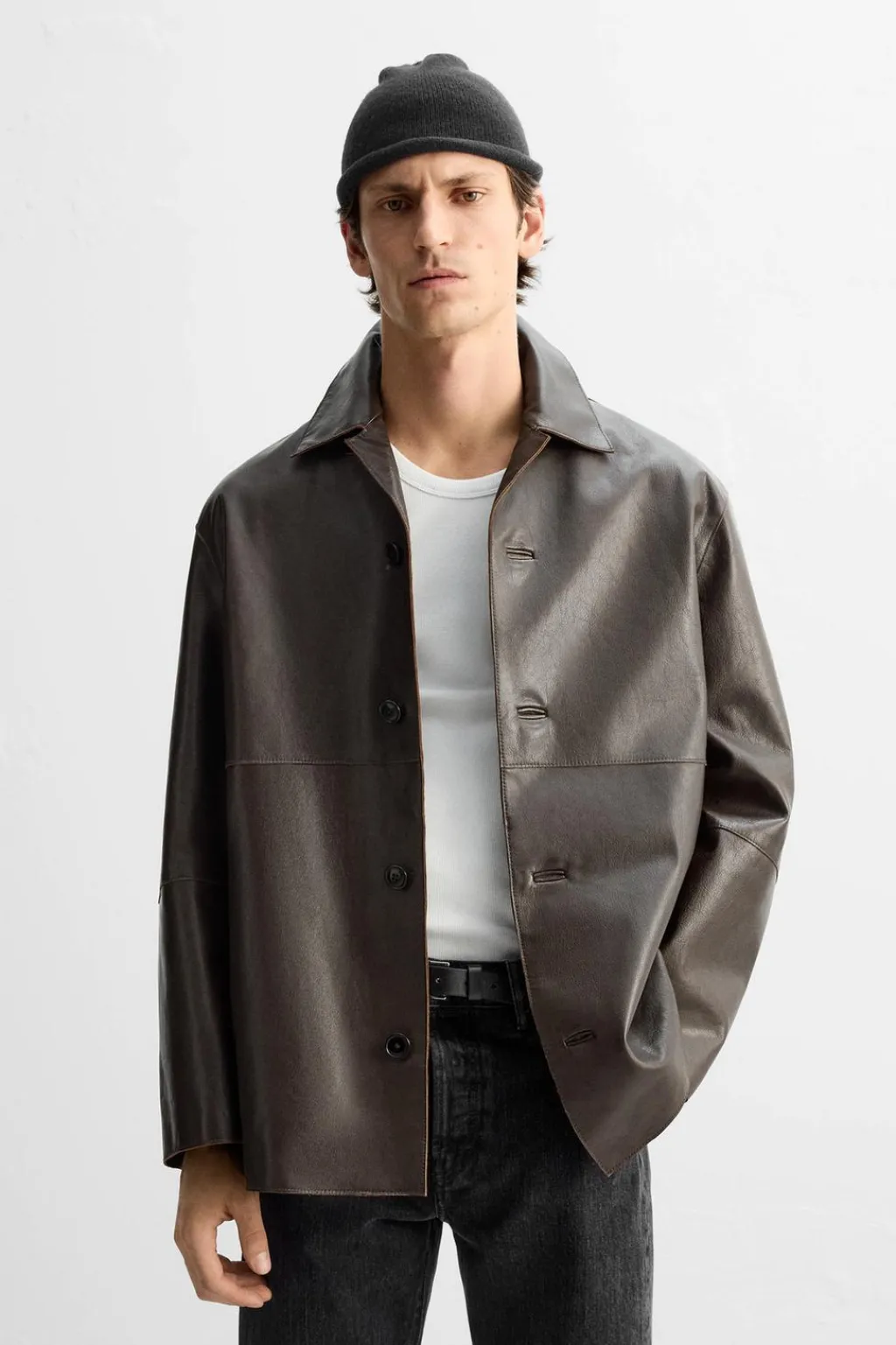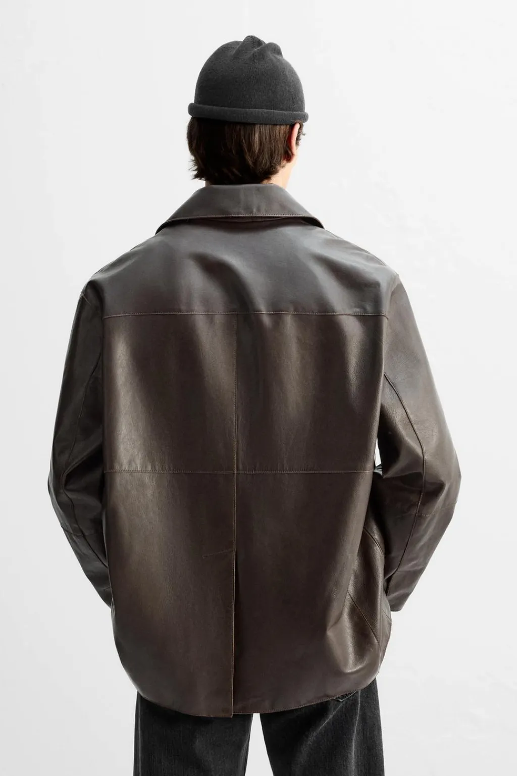 Chaqueta relaxed fit confeccionada en piel. Cuello solapa y manga larga. Bolsillos de vivo en cadera y detalle de bolsillo interior. Bajo con abertura en centro espalda. Acabados irregulares. Cierre frontal de botonadura.