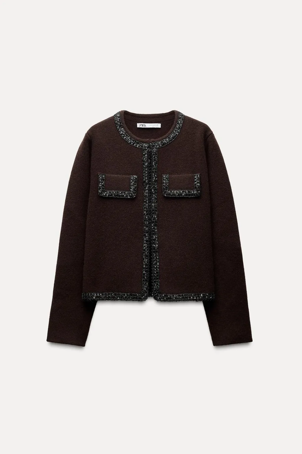 Chaqueta confeccionada en 100% lana. Cuello redondo y manga larga. Detalle de acabados con abalorios y tapetas delanteras. Cierre frontal con corchetes ocultos.
