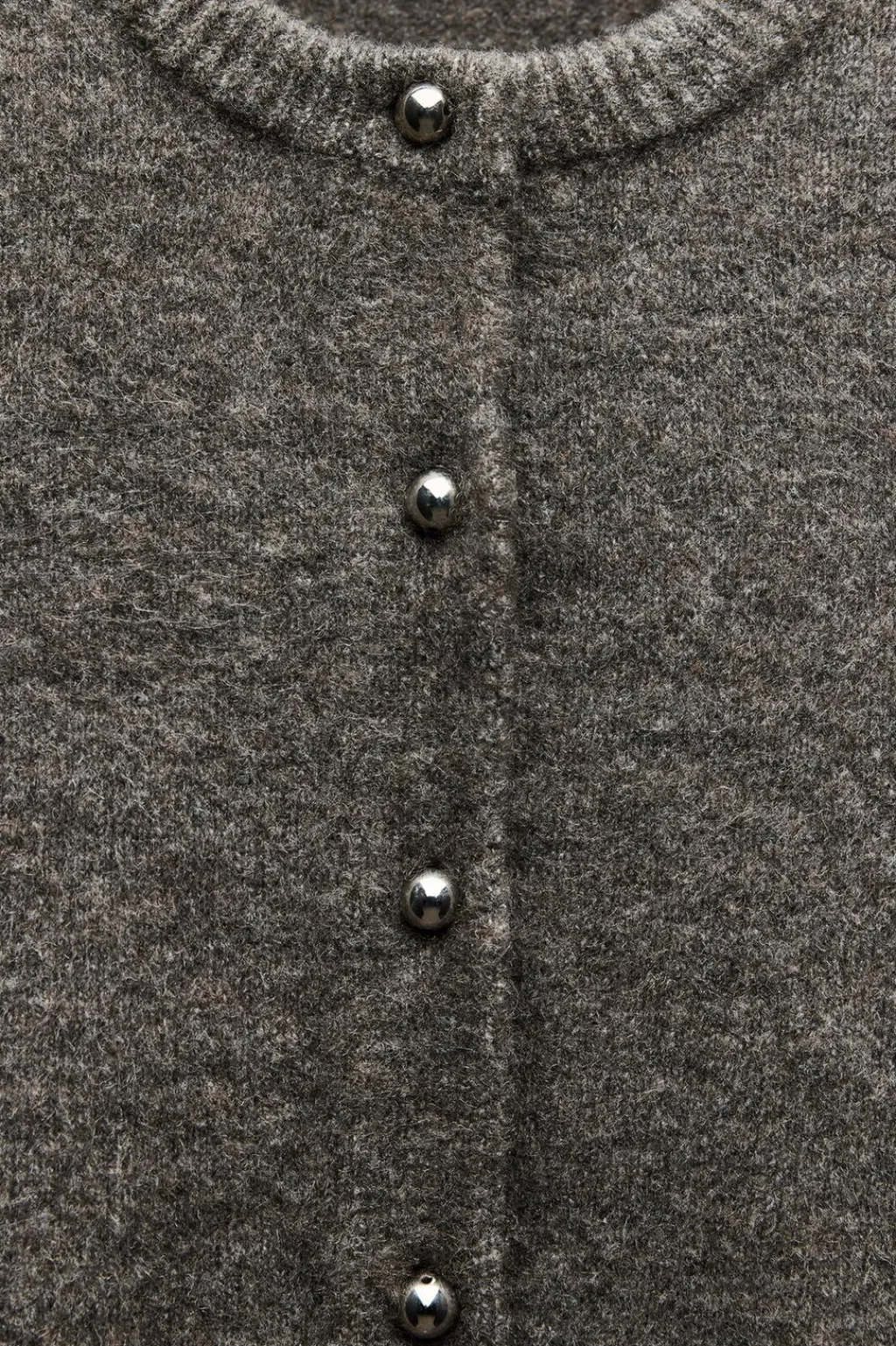 Chaqueta de cuello redondo y manga larga. Cierre frontal con botones metálicos en forma de bola.
