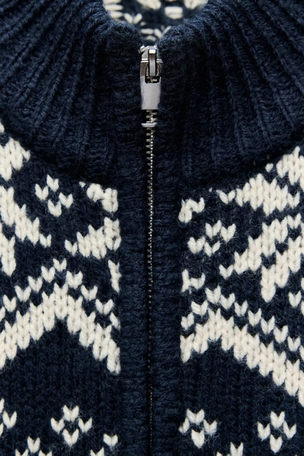 Chaqueta confeccionada con lana. Cuello redondo y manga larga. Detalle de tejido combinado con jacquard y ochos. Cierre frontal con cremallera.