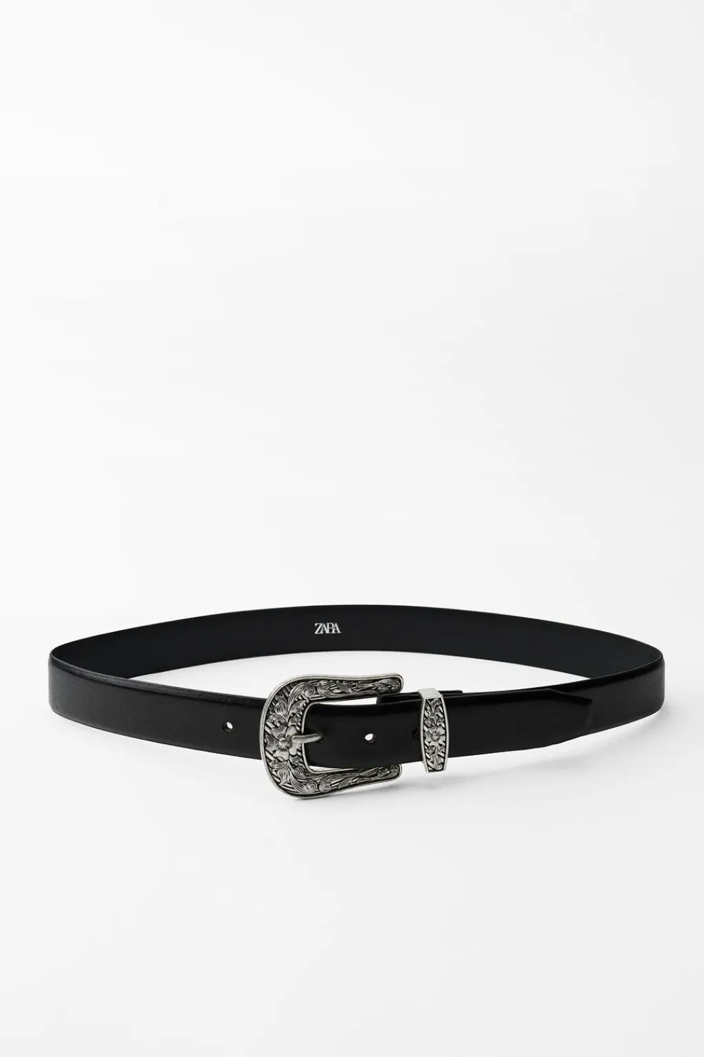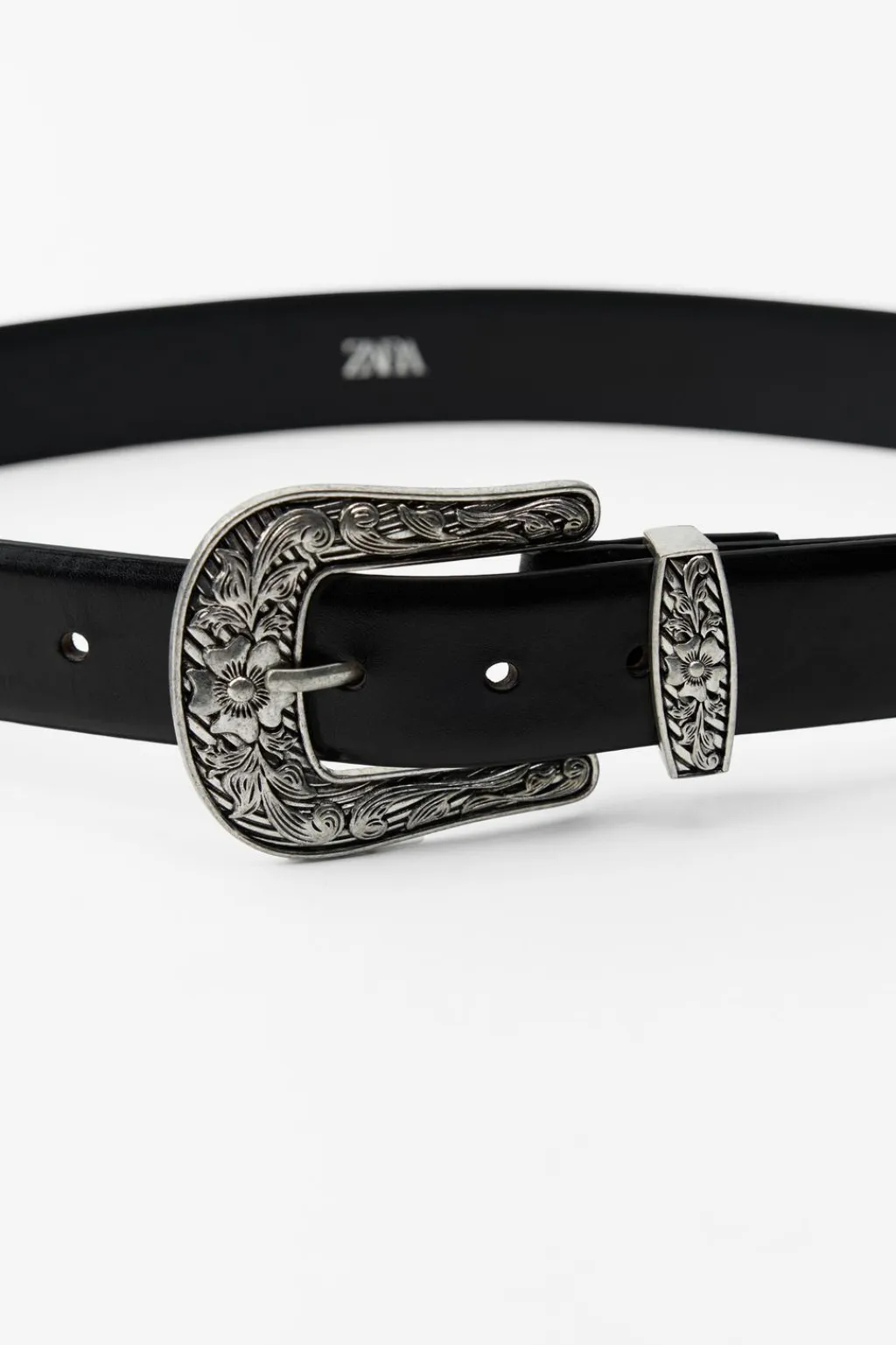 Cinturón de 3 cm de ancho realizado en piel. Hebilla metálica labrada en forma rectangular.