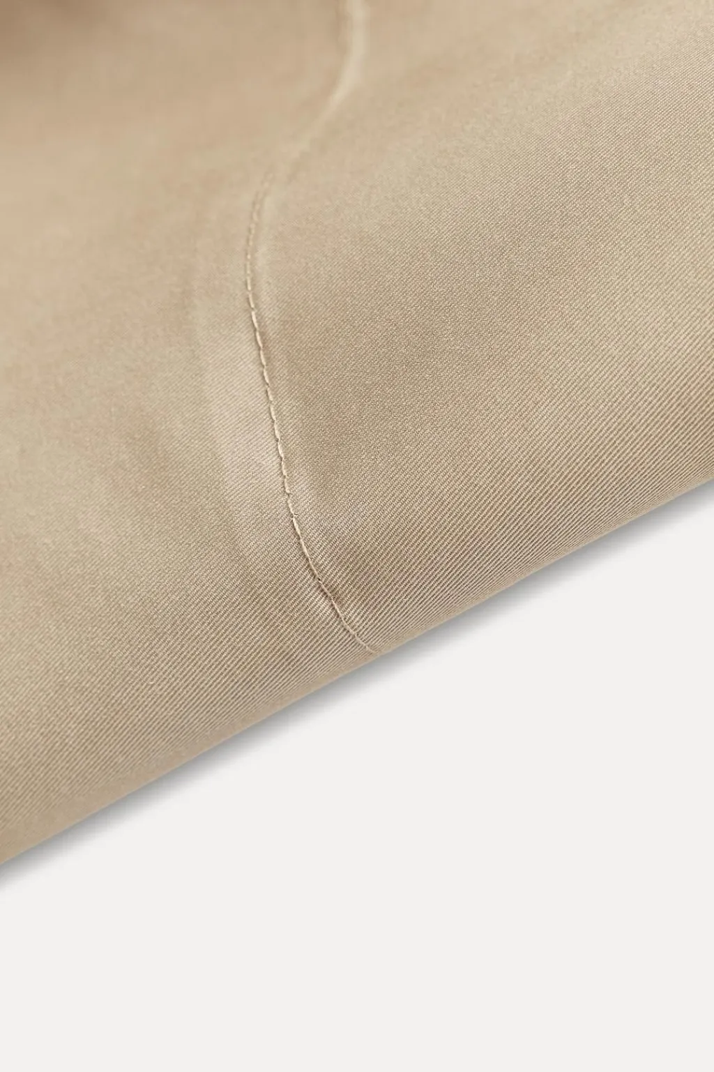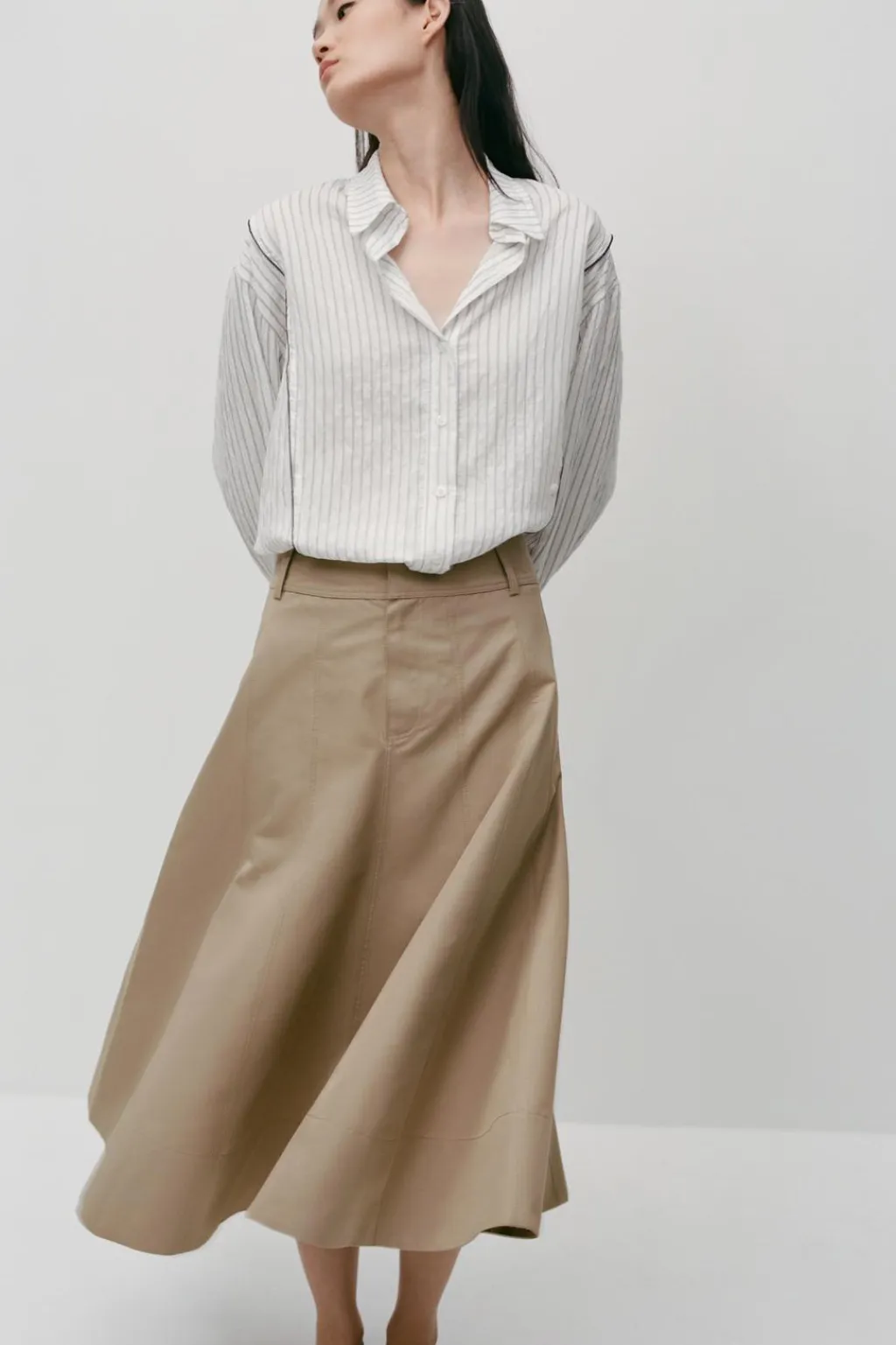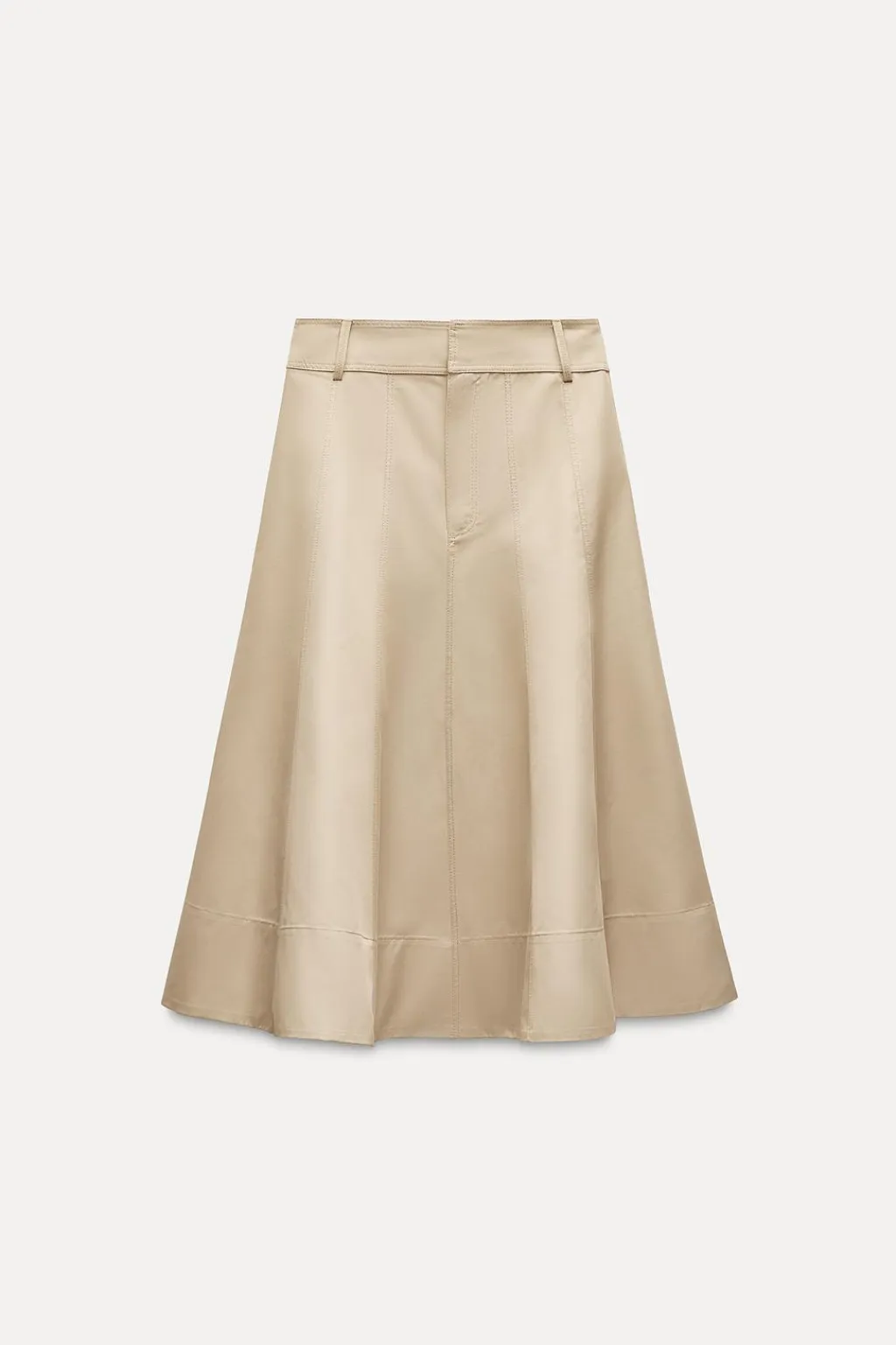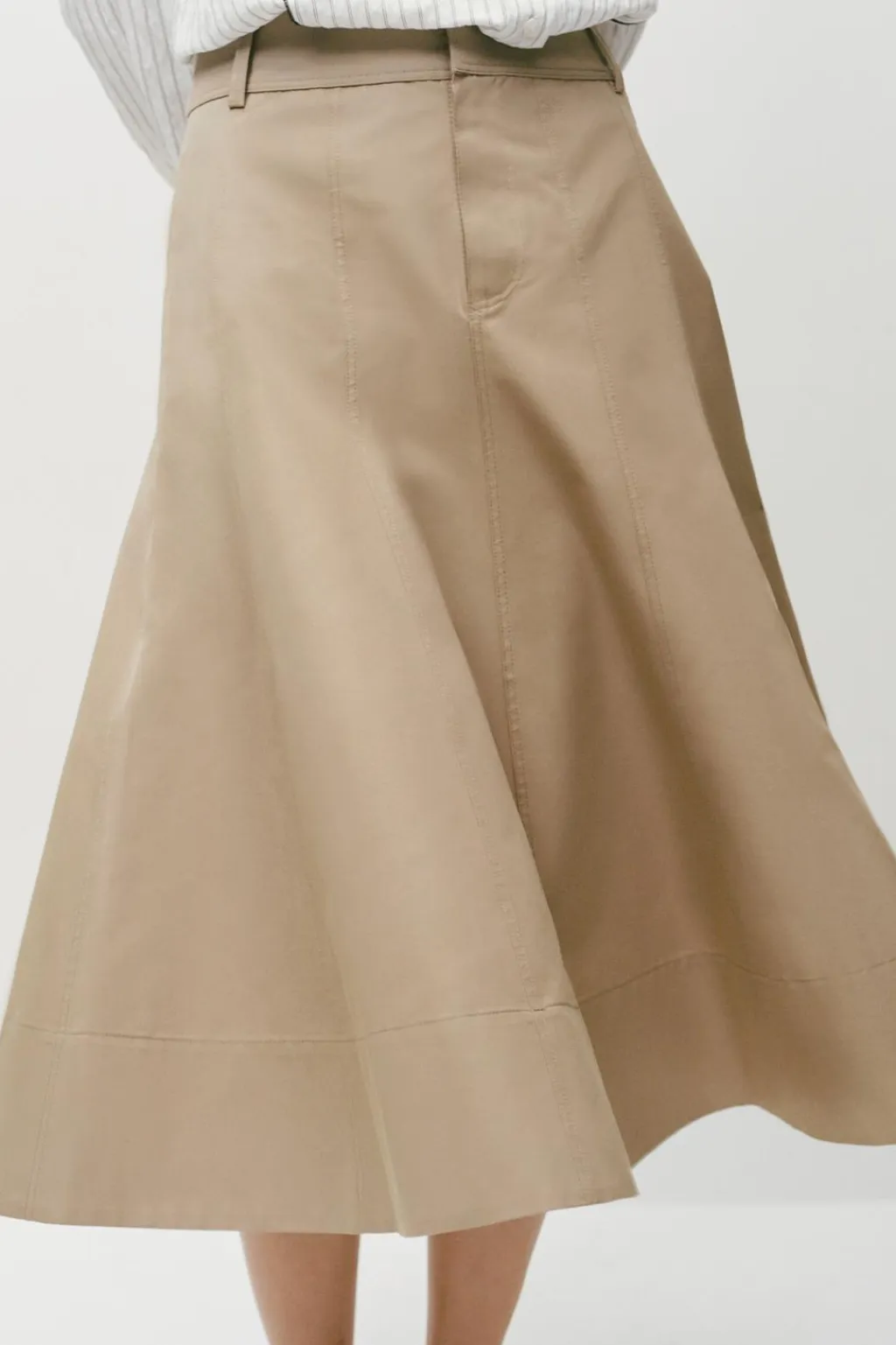 Falda midi confeccionada en tejido tipo gabardina. Tiro medio y cintura con trabillas. Bajo acabado en godets. Cierre frontal con cremallera, botón y ganchos metálicos.