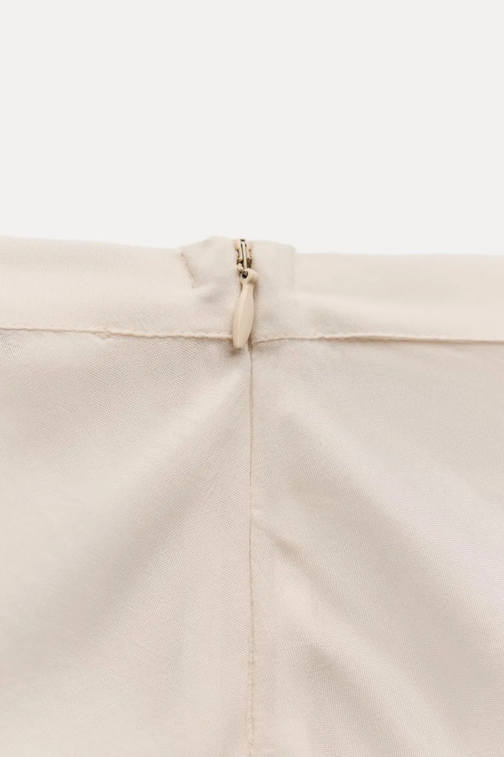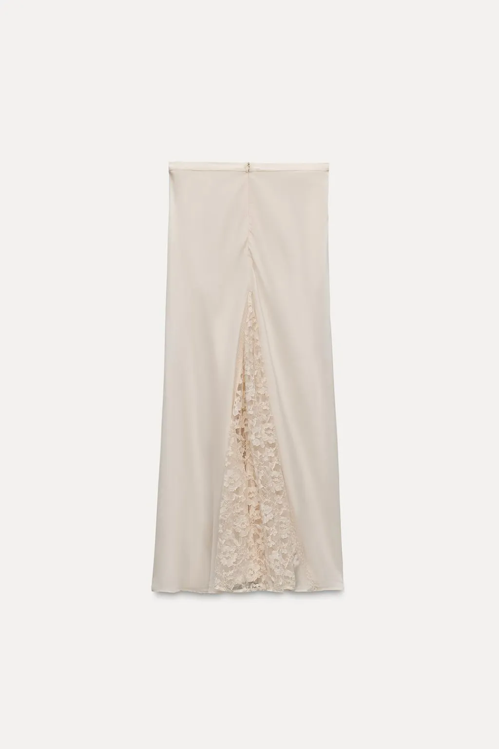 Falda midi confeccionada en hilatura de viscosa 100% y tiro medio. Detalle aplicación de encaje combinado a tono. Cierre lateral con cremallera oculta en costura.