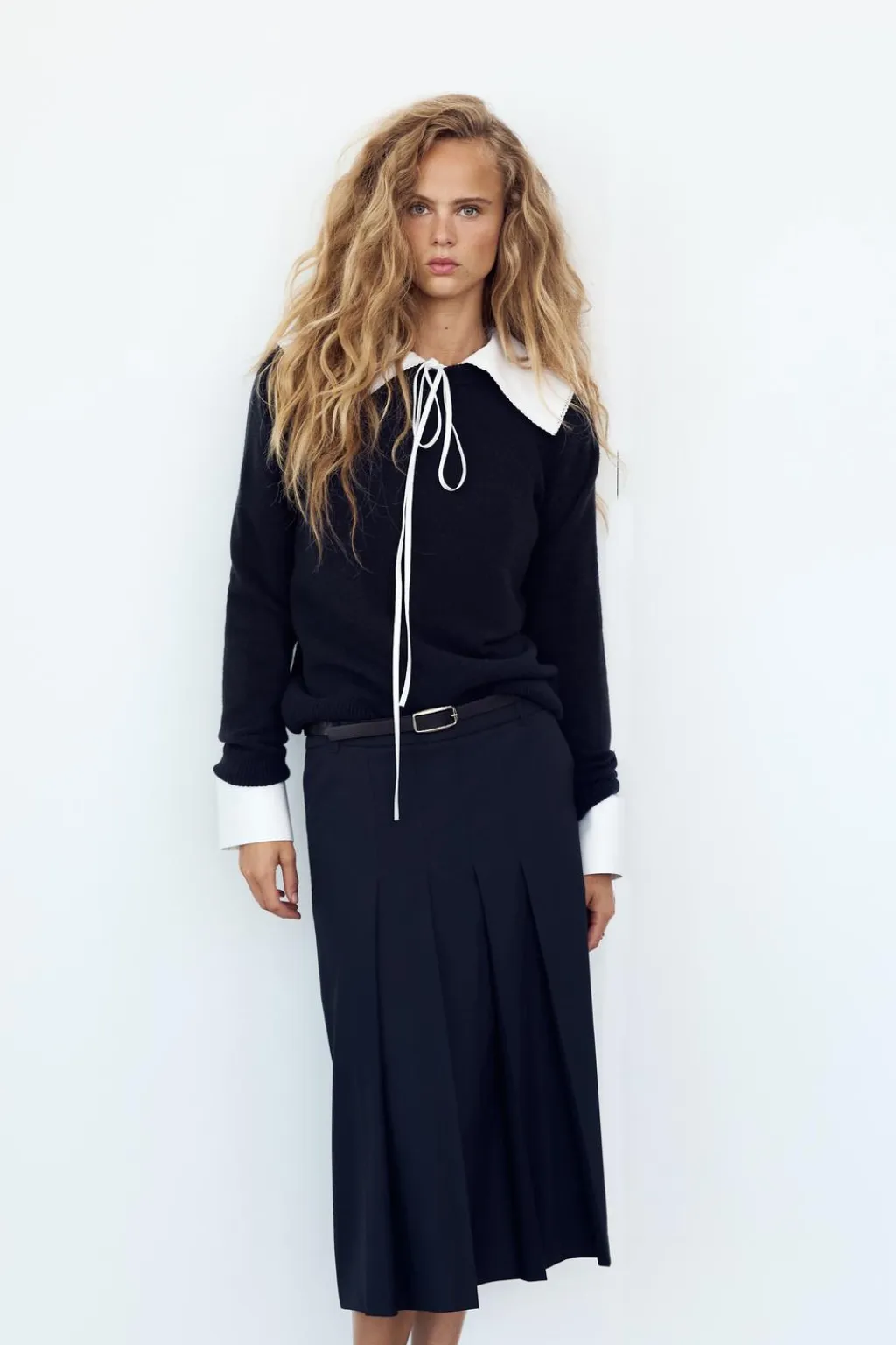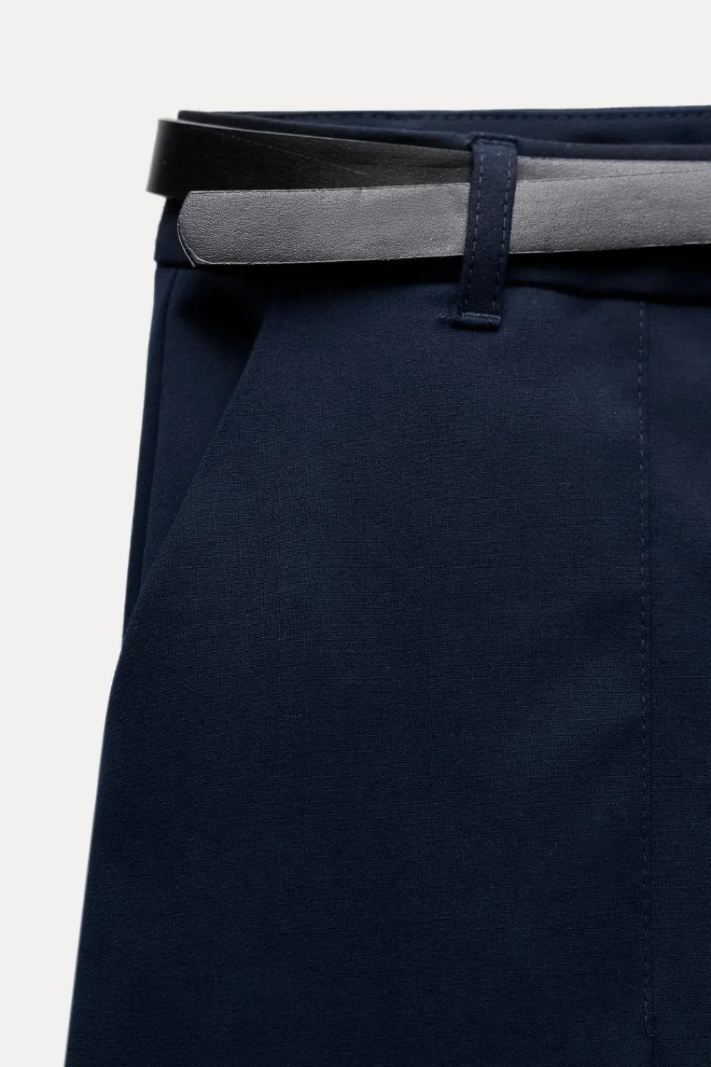Falda midi de tiro medio. Boslillos laterales. Cinturón combinado a contraste con hebilla metálica. Detalle de tablas. Cierre lateral con cremallera oculta en costura.