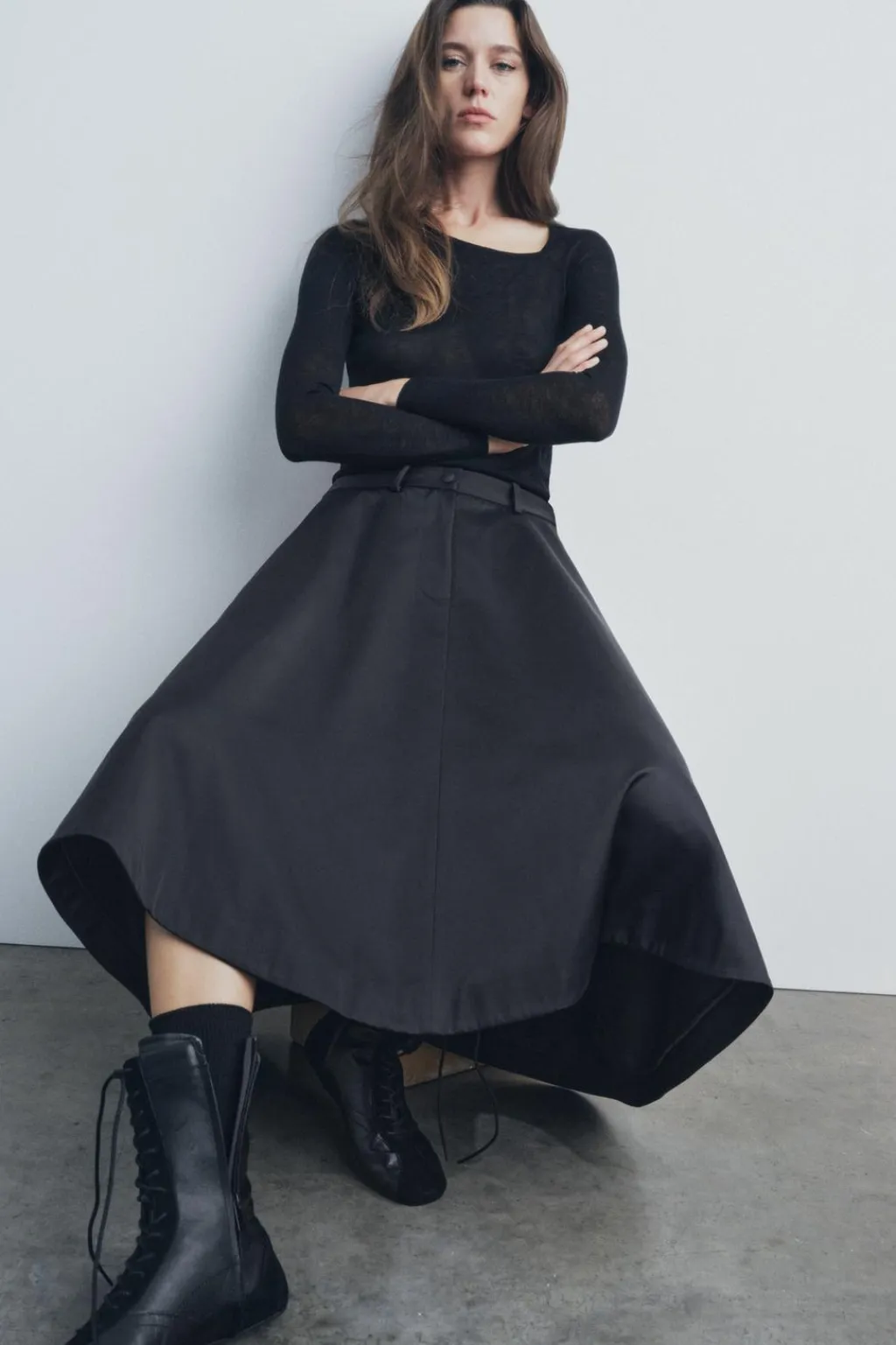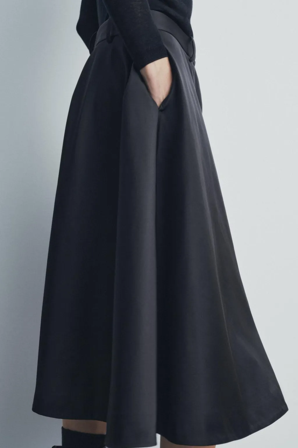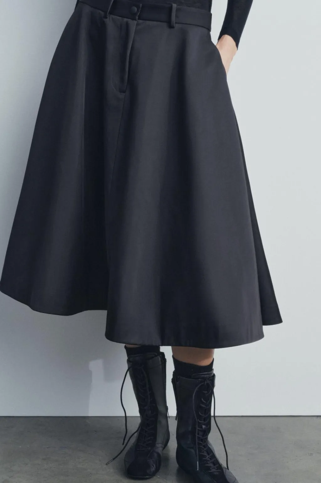 Falda midi confeccionada en tejido tipo gabardina. Tiro medio y cintura con trabillas. Bajo acabado en línea evasé con volumen. Cierre frontal con cremallera y botón.