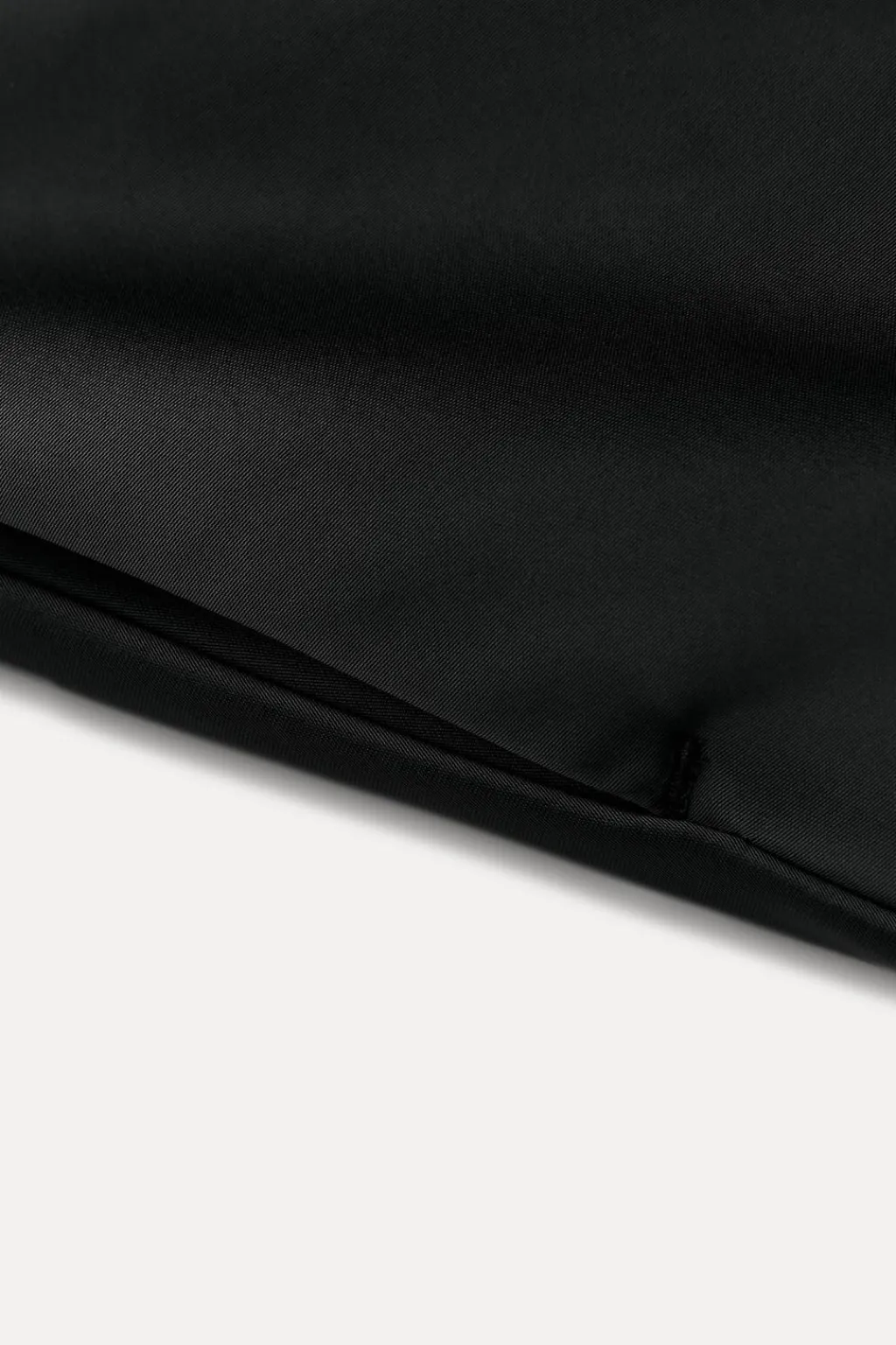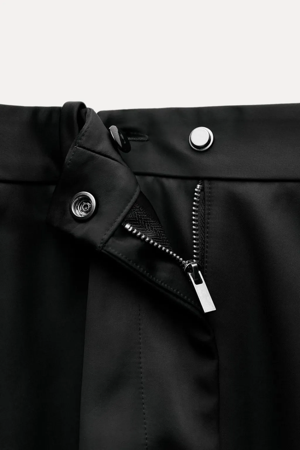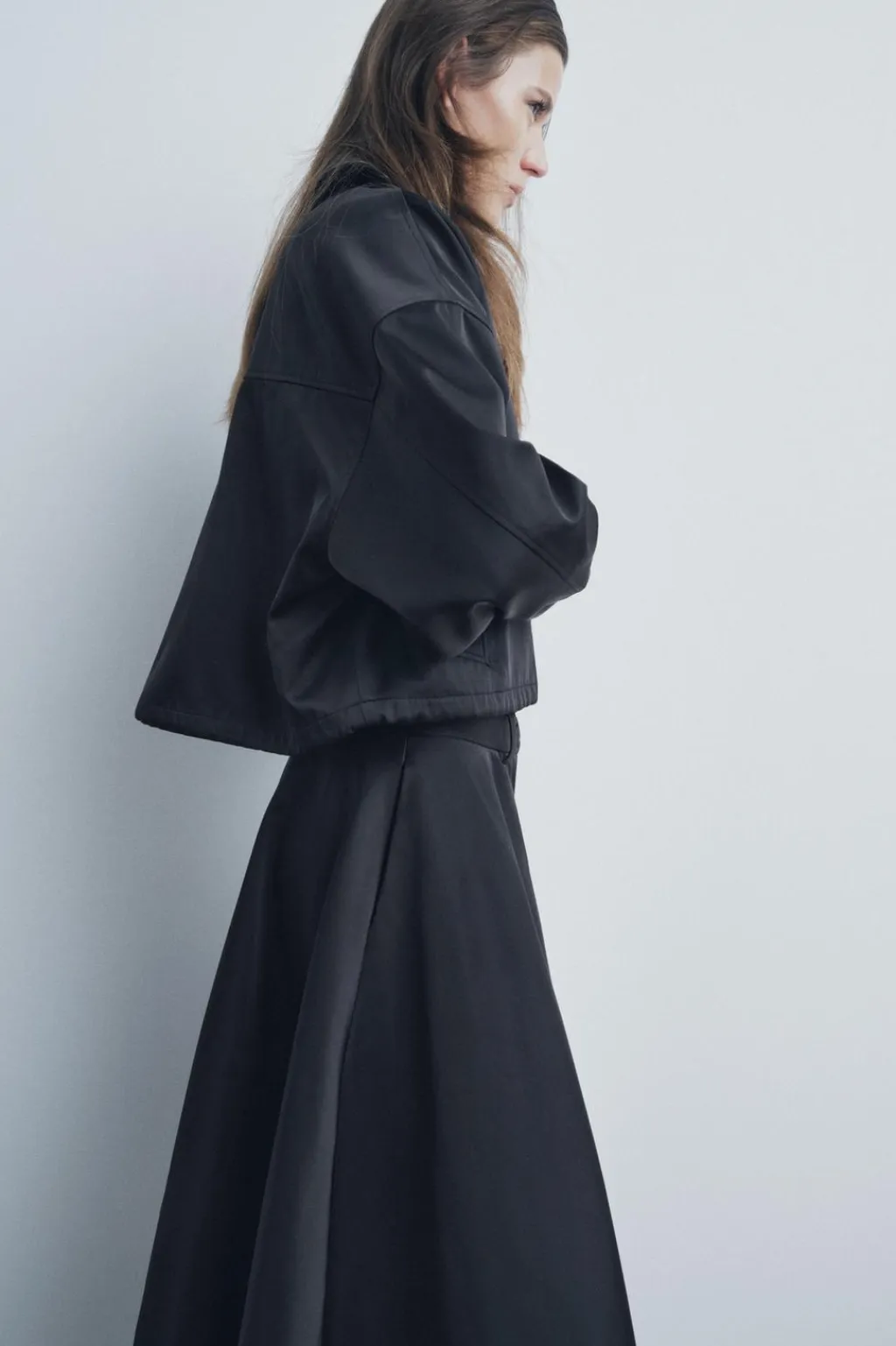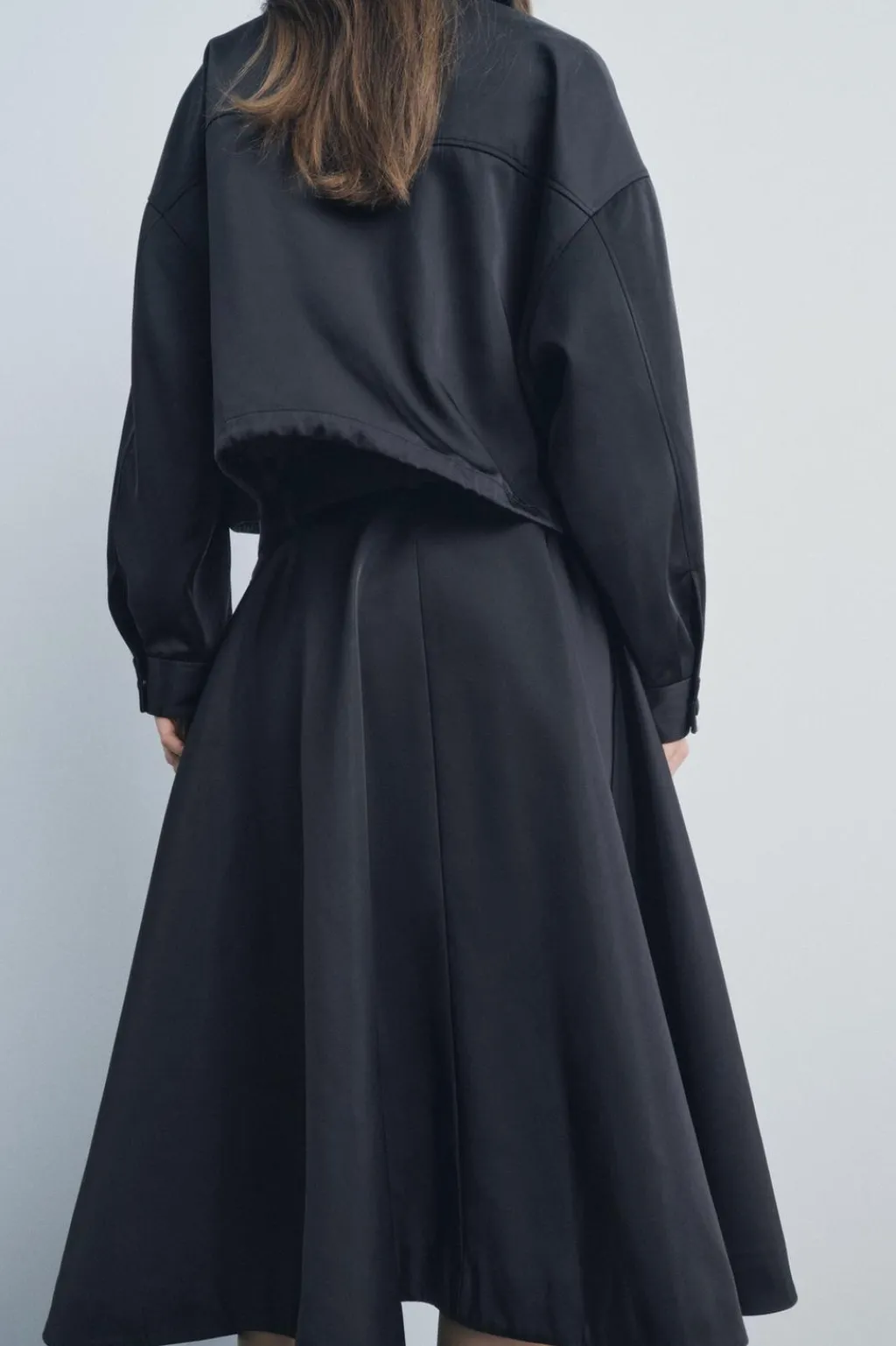 Falda midi confeccionada en tejido tipo gabardina. Tiro medio y cintura con trabillas. Bajo acabado en línea evasé con volumen. Cierre frontal con cremallera y botón.