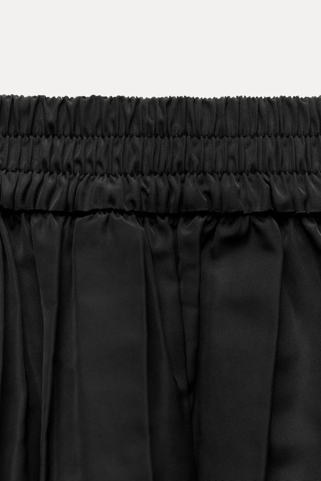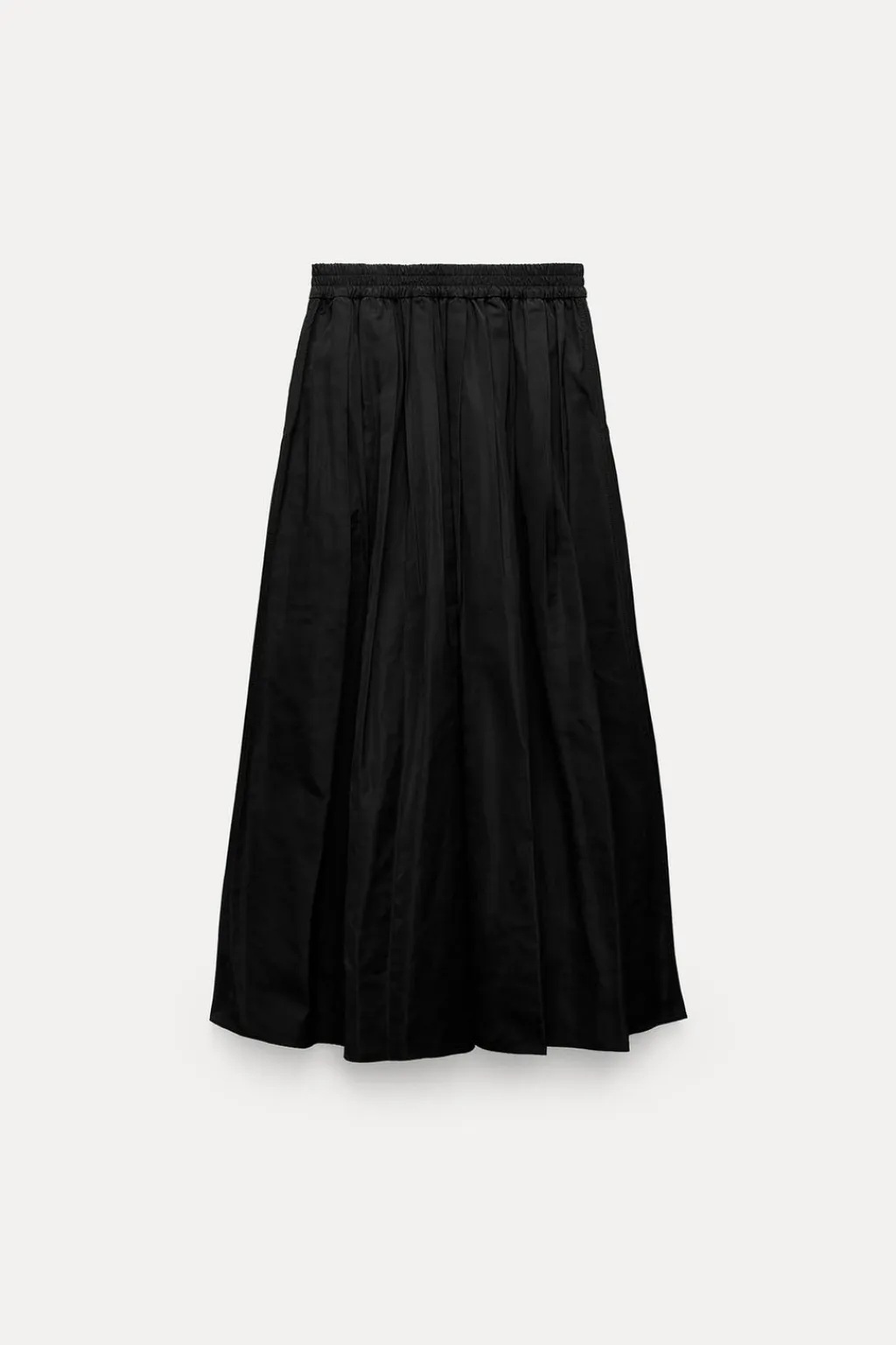 Falda midi de tiro alto y cintura con elástico. Detalle de pliegues en cintura. Bajo acabado con volumen.