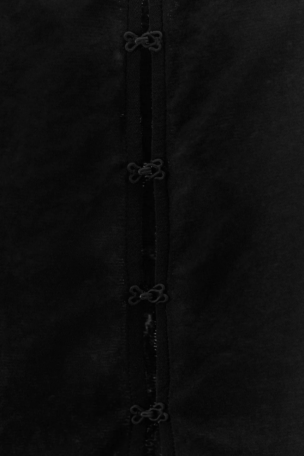 Falda mini semitransparente de tiro medio y cintura elástica. Detalle de aberturas y alamares combinados a tono en delantero. Forro interior. Bajo acabado sin costuras.