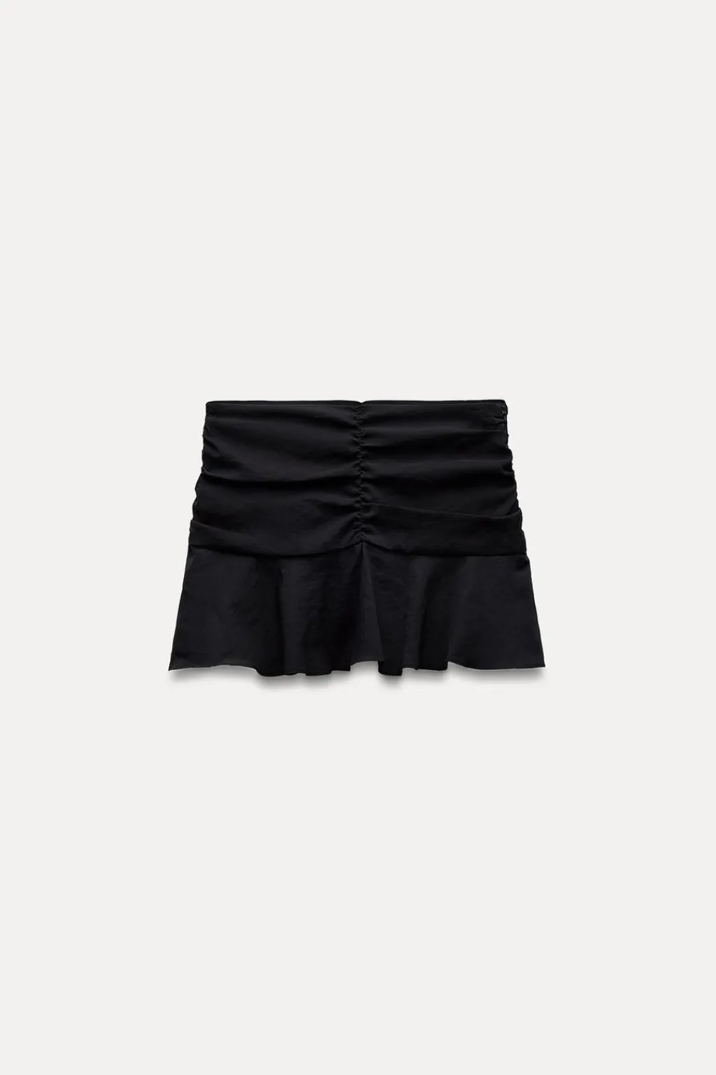 Falda pantalón de tiro medio. Bajo acabado en volantes. Detalle de frunces. Cierre lateral con cremallera oculta en costura.