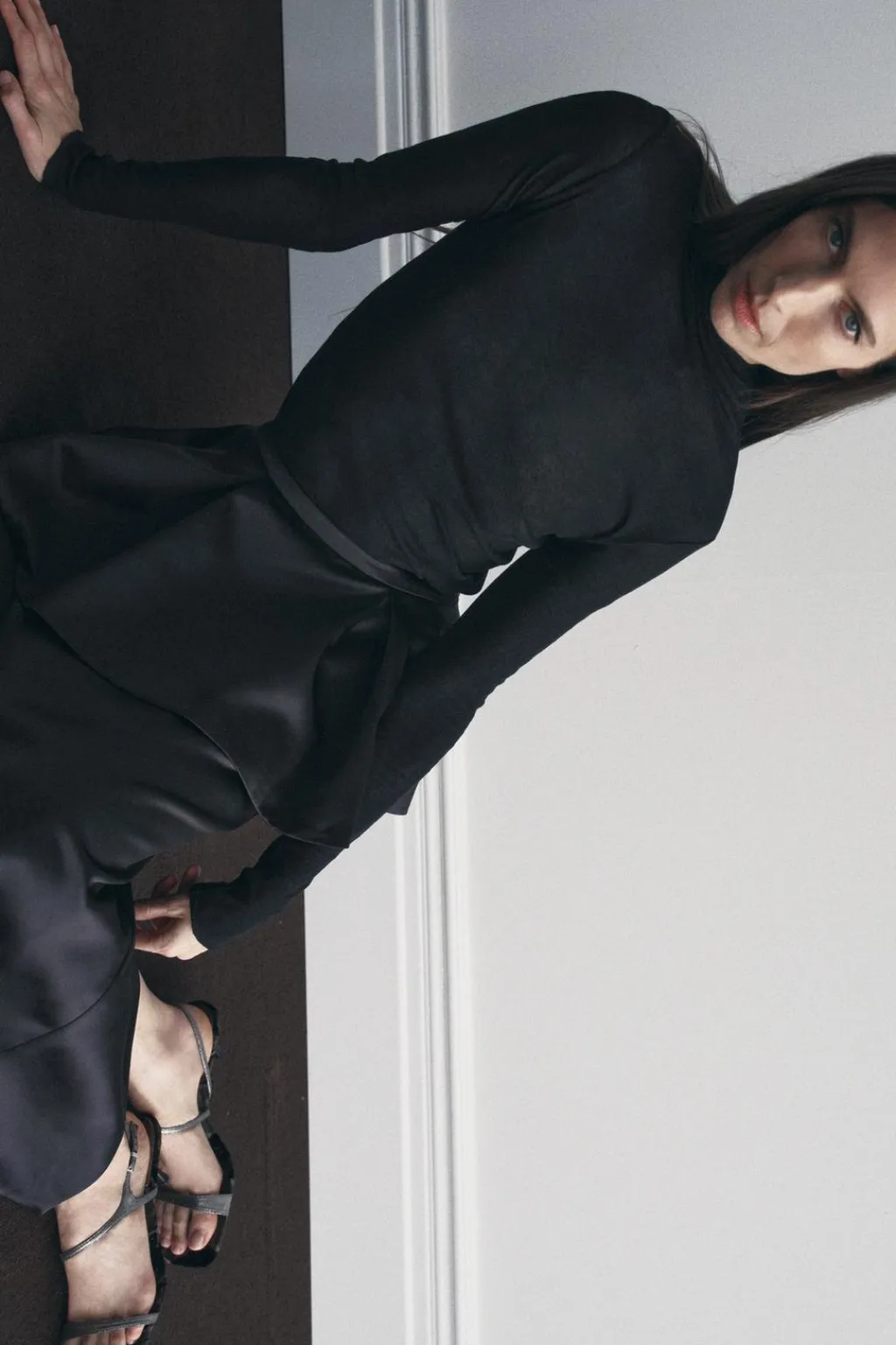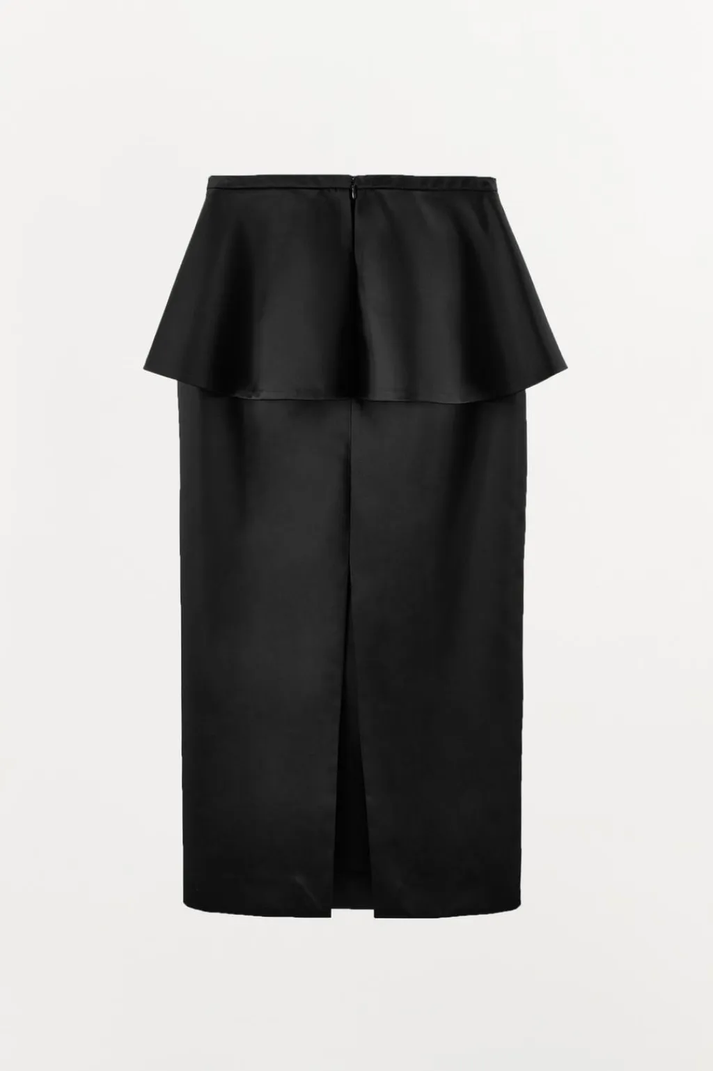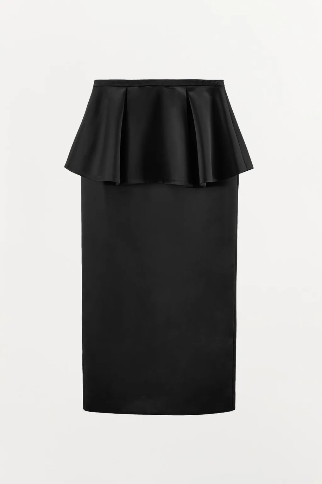 Falda midi de tiro medio confeccionada en satén pesado. Detalle de peplum a tono. Cierre en espalda con cremallera oculta en costura.