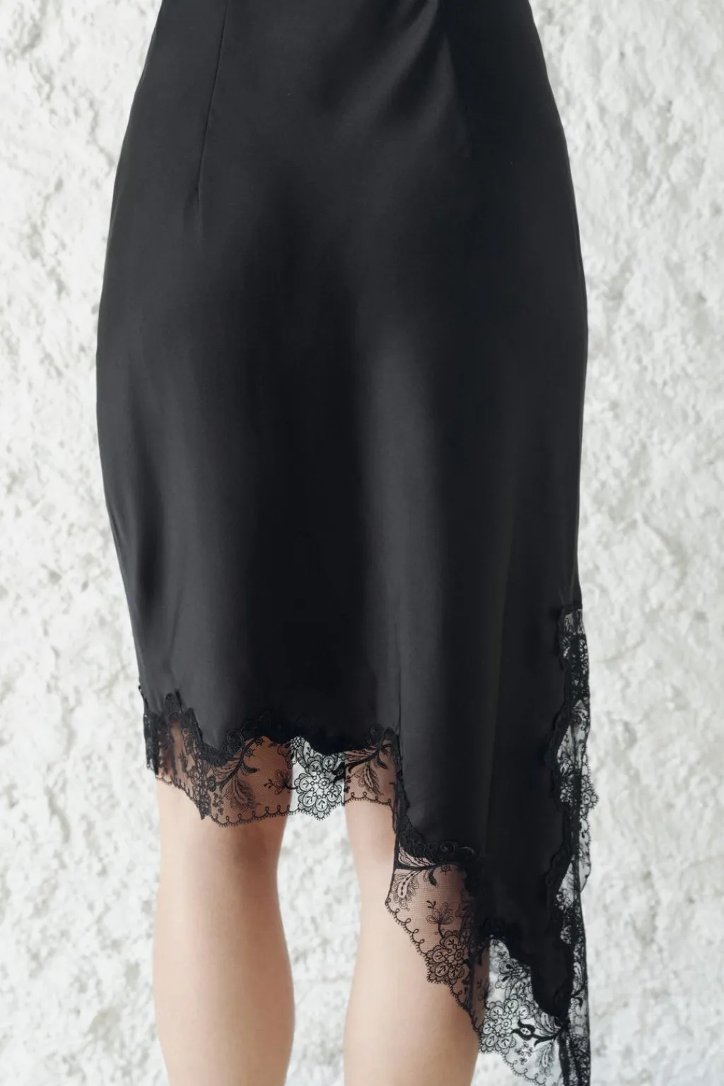 Falda midi de tiro medio. Bajo asimétrico con aplicación de encaje a tono. Cierre con cremallera oculta en costura.