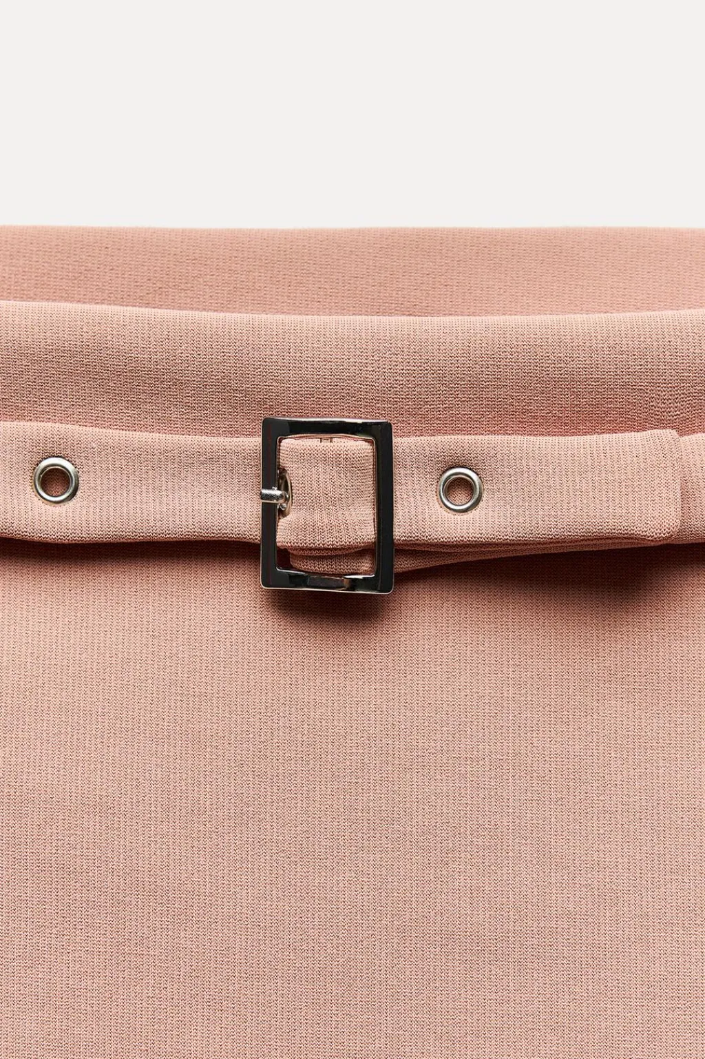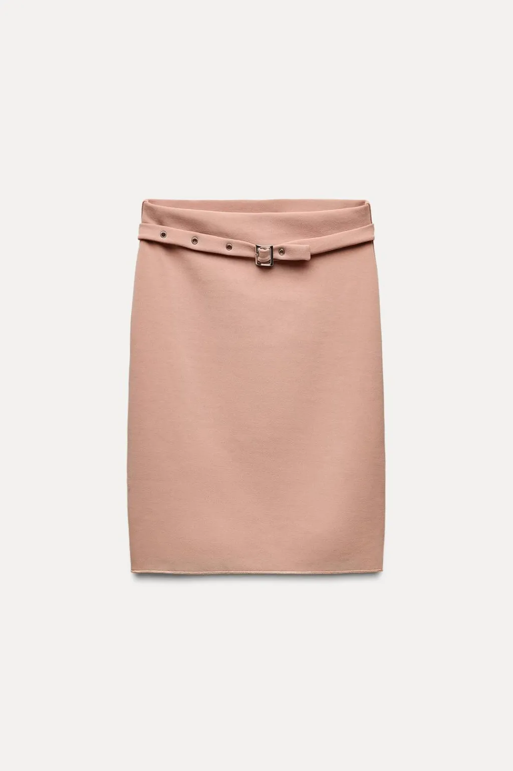 Falda confeccionada en tejido elástico. Tiro alto con cinturón fino con hebilla metálica.